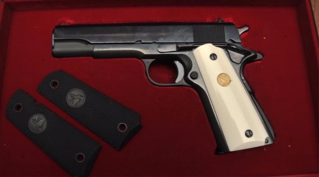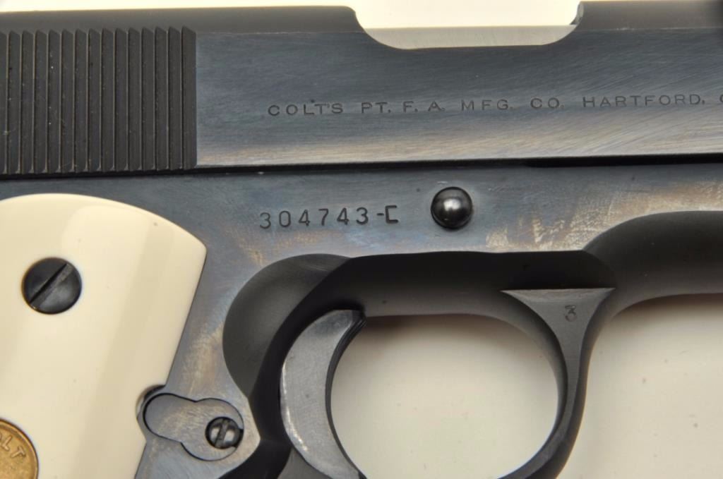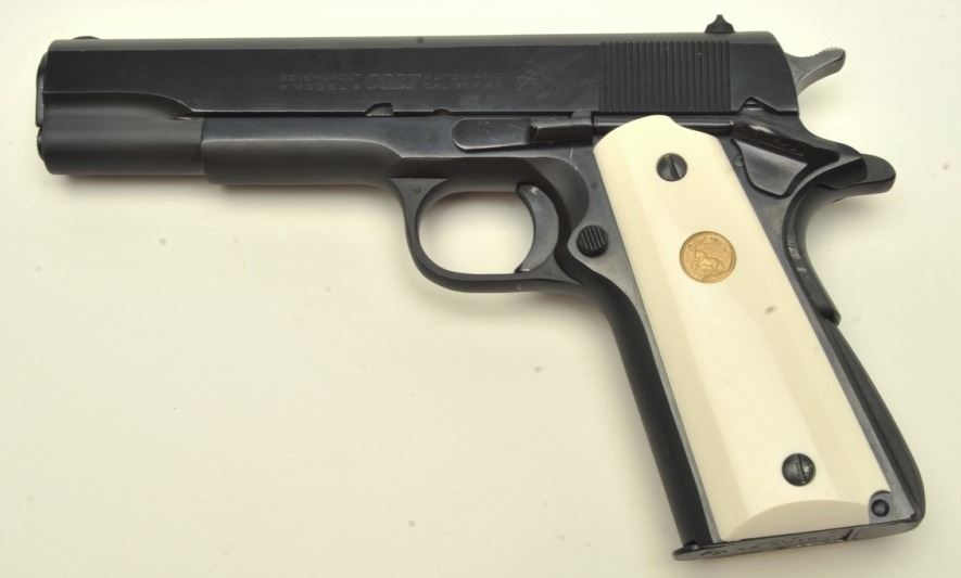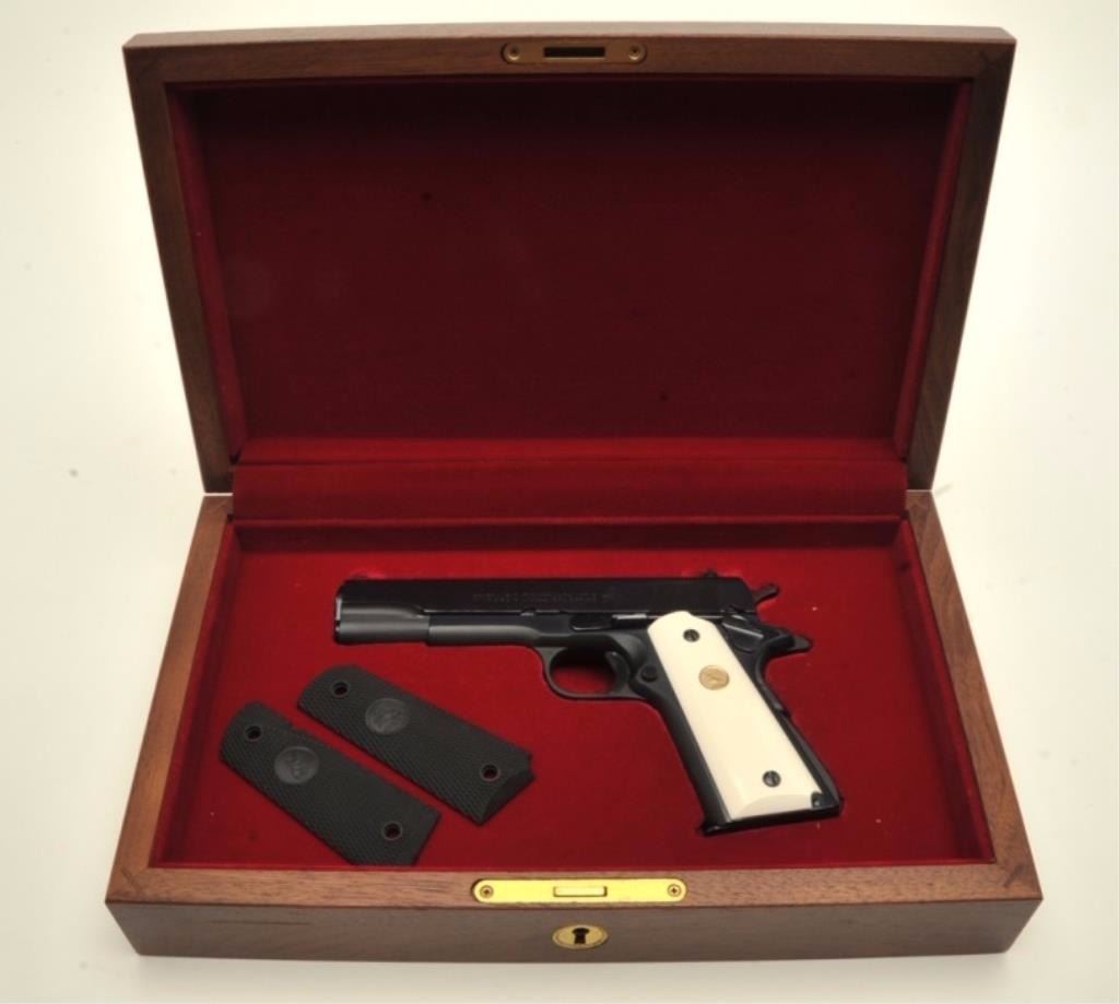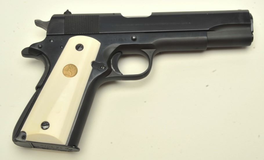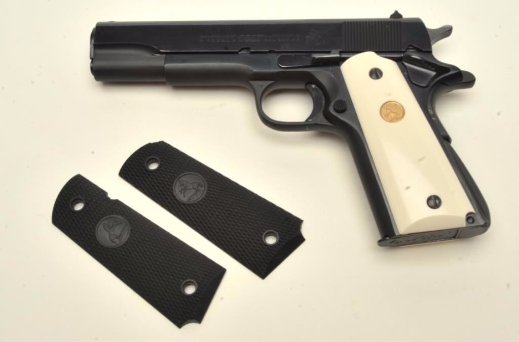 wood casing that has been used to display a Colt Government Model Post War Commercial semi-automatic pistol, .45 caliber, 5” barrel, blued finish, simulated ivory medallion grips, S/N 304743-C, in near new condition with additional pair of checkered black hard rubber grips. (Modern/PPT). Est.: $1,200-$2,400.