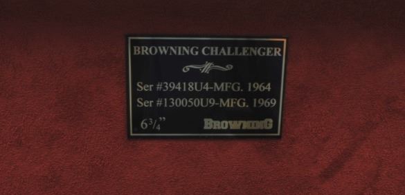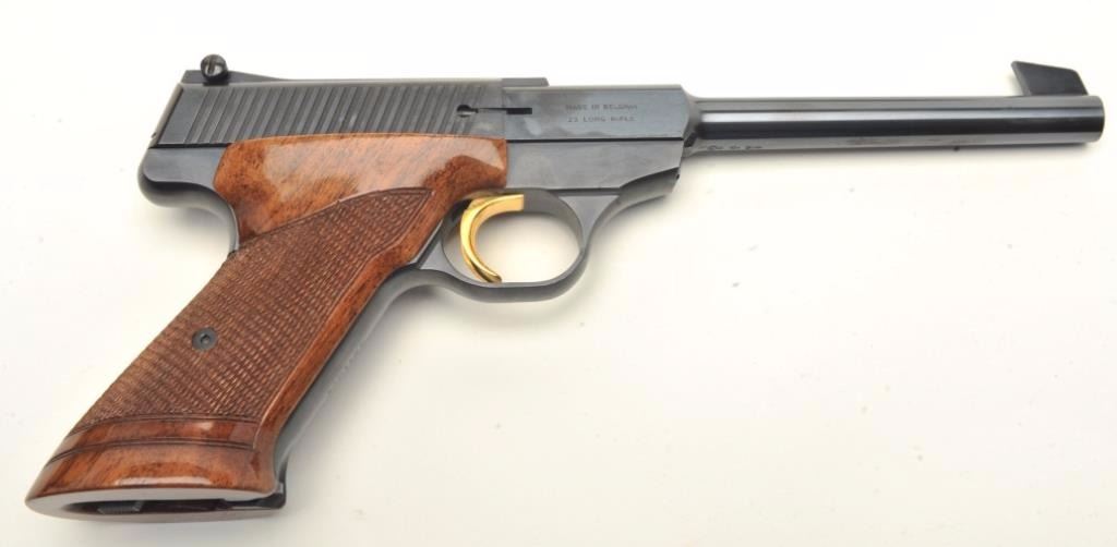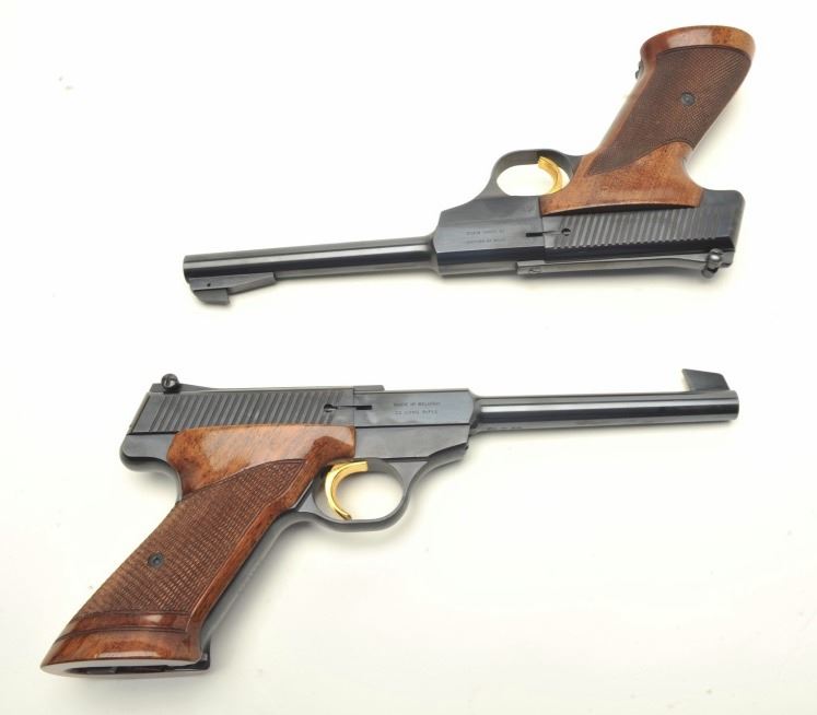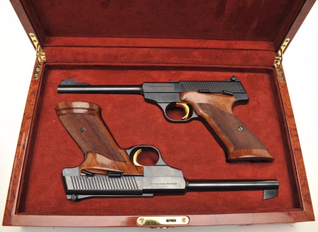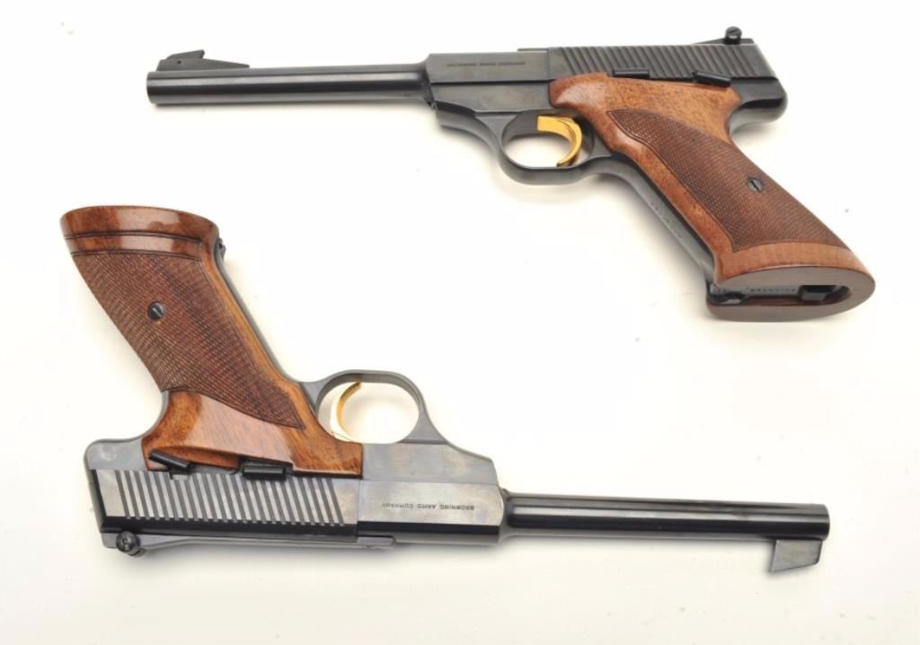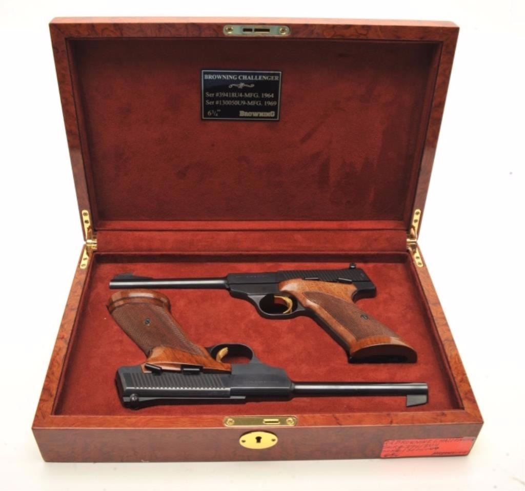 Browning Challenger Model semi-automatic pistols, .22LR caliber, 6.75” barrels, blued finish with gold triggers, checkered wood grips, S/Ns 130050U9 & 39418U4, both in near new condition. (Modern/PPT). Est.: $1,500-$3,000.