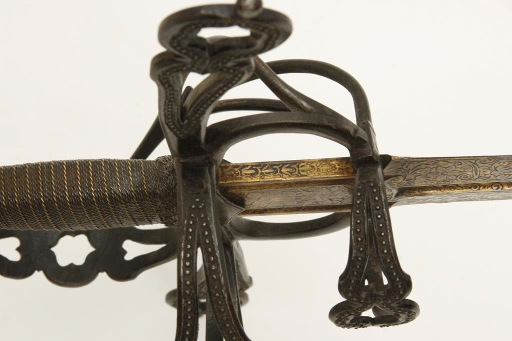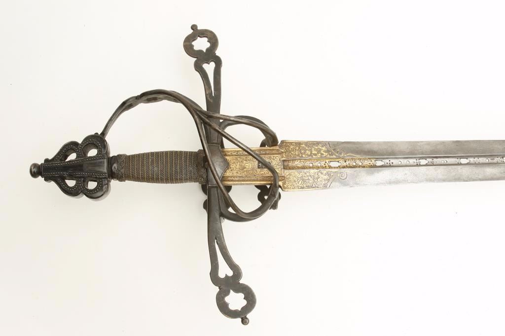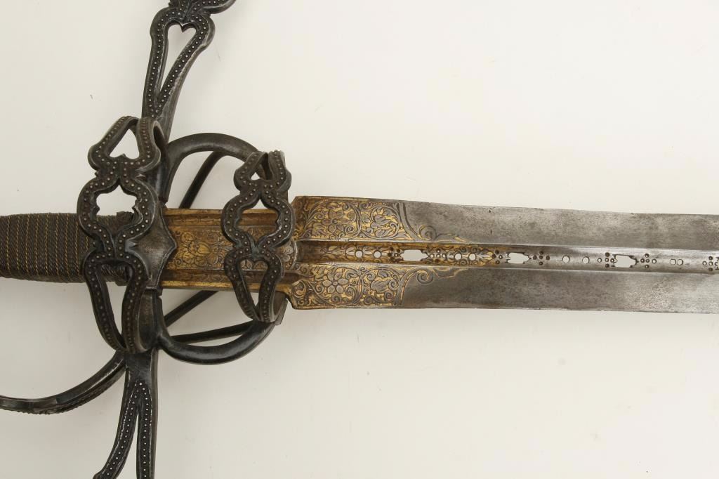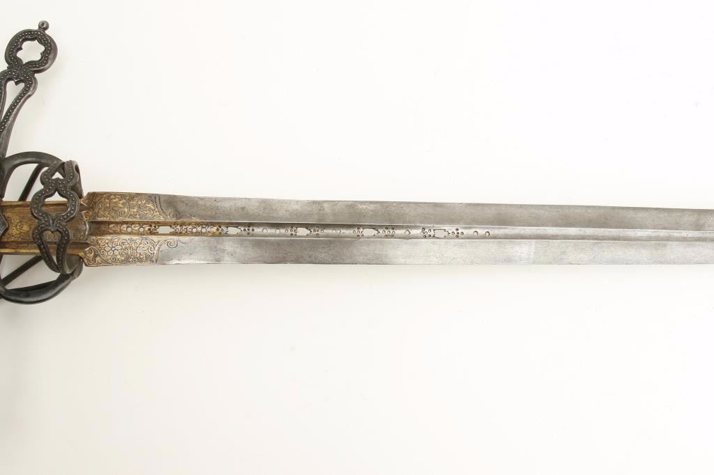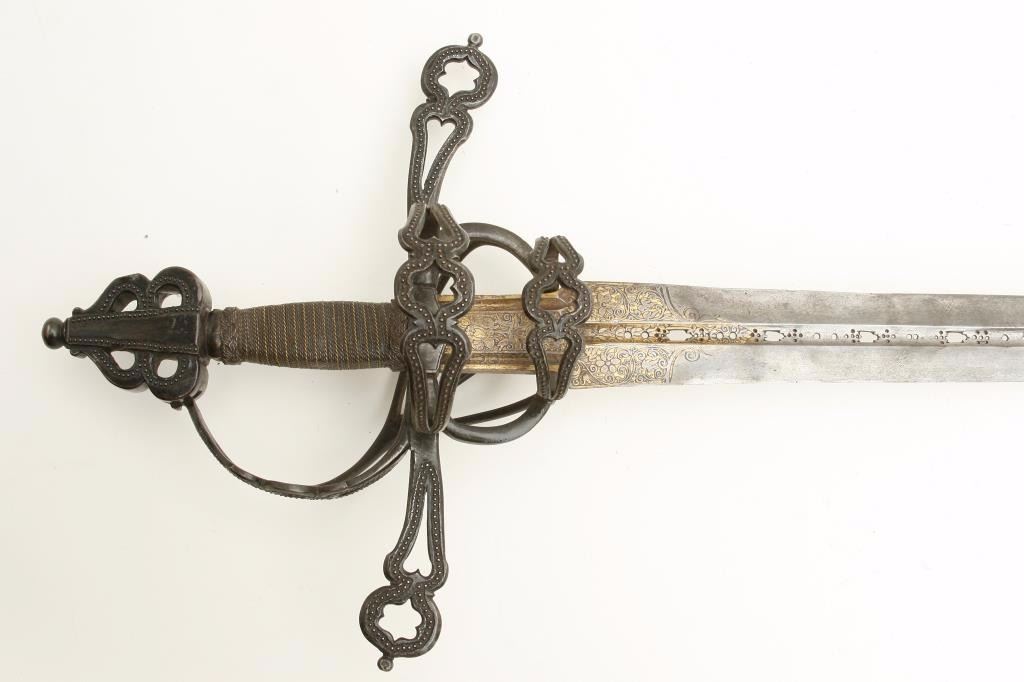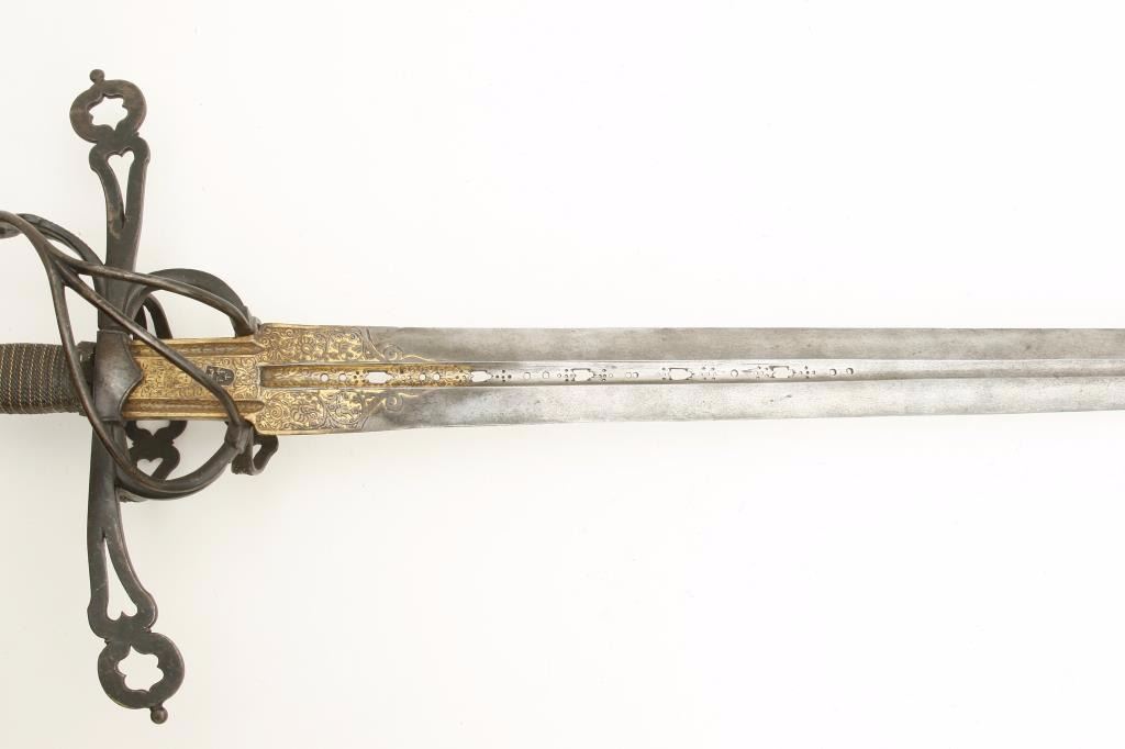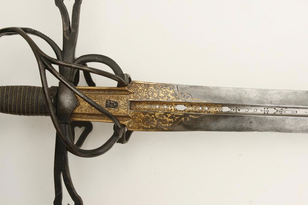 beautiful pierced and gilt blade, possibly by Heinrich, Schmidt or masterful 19th Century Armourer; old collector bought as authentic and “of the period”; a fine representation but 100-150 years old. Est.: $1,500-$3,000.