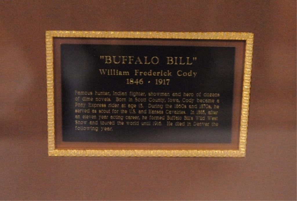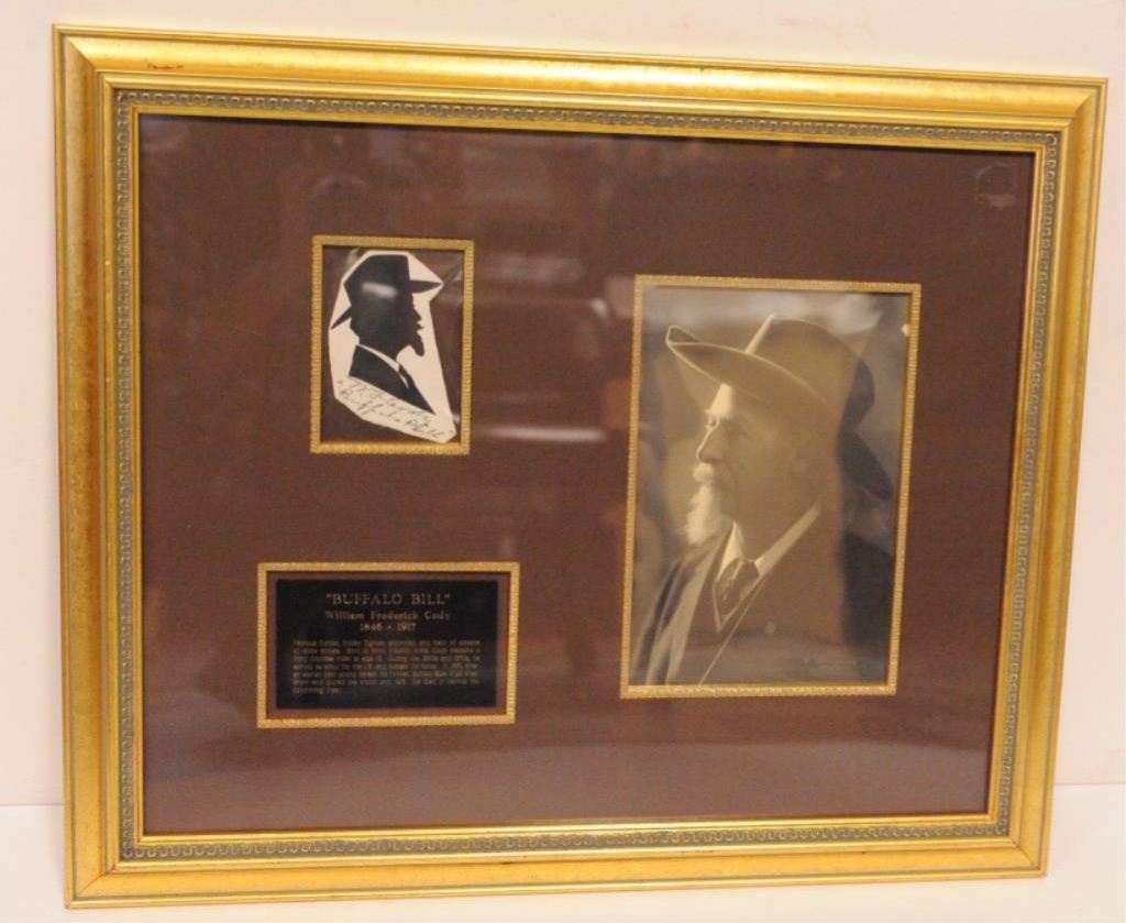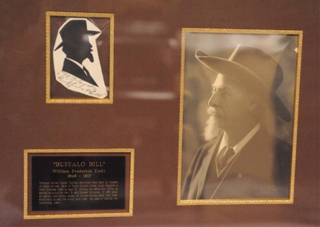 later years marked “Lumiere Studio” lower right. Measures approximately 9 ½”x 6”. In excellent condition framed with paper cut silhouette of Cody which is marked “W.F. Cody” and autographed along with plaque in beautiful shadow box design. 19 ½” x 23 ½”. Nice display from a premier Buffalo Bill collection. Est.: $750-$1500