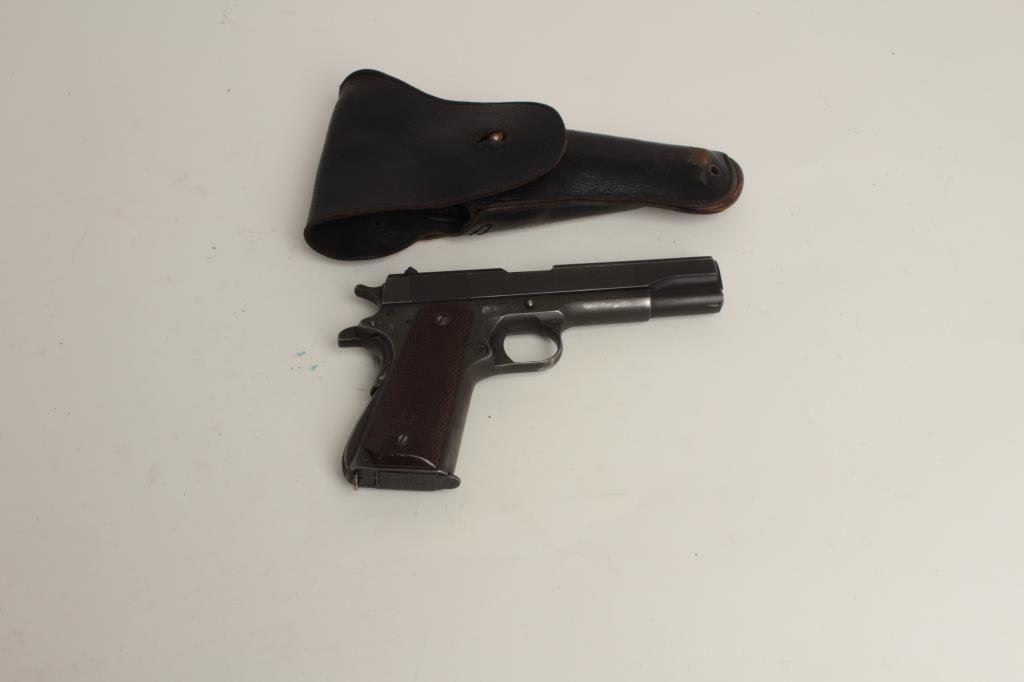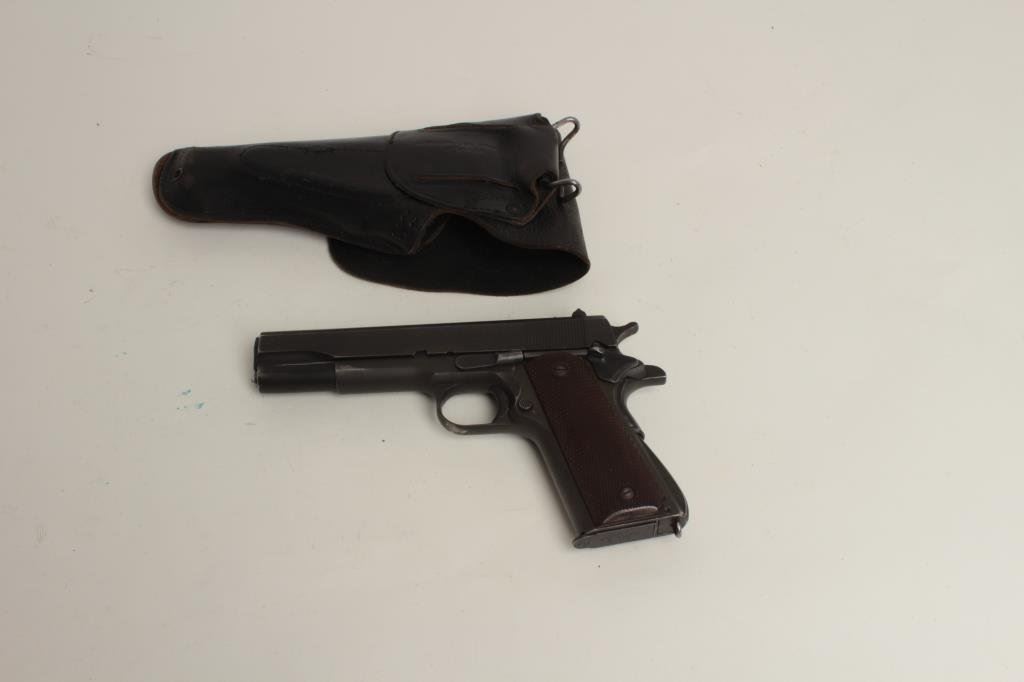 caliber, 5” barrel, “FJA” inspected, mat black finish, checkered brown plastic grips, S/N 1767451, in overall very good condition showing the majority of finish, some high point wear, very good to fine bore, crisp action and sharp markings, fine grips, commercial magazine. Accompanied by a US leather flap holster. (C&R/PPT). Est.: $1,400-$2,800.
