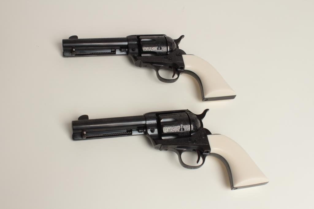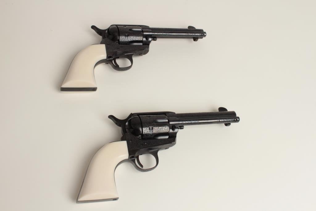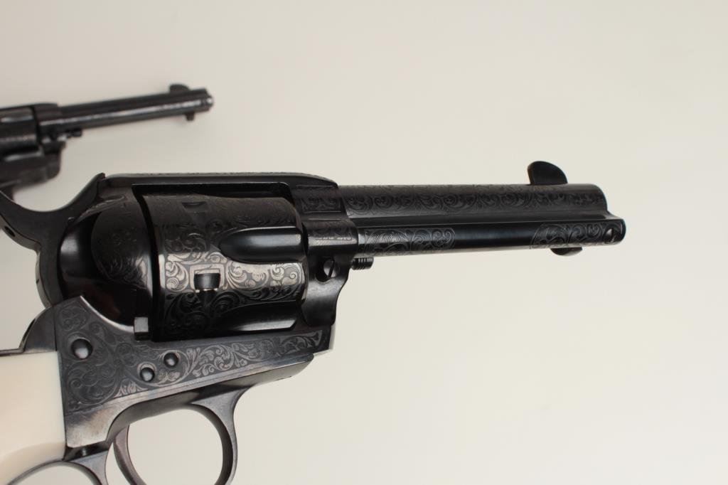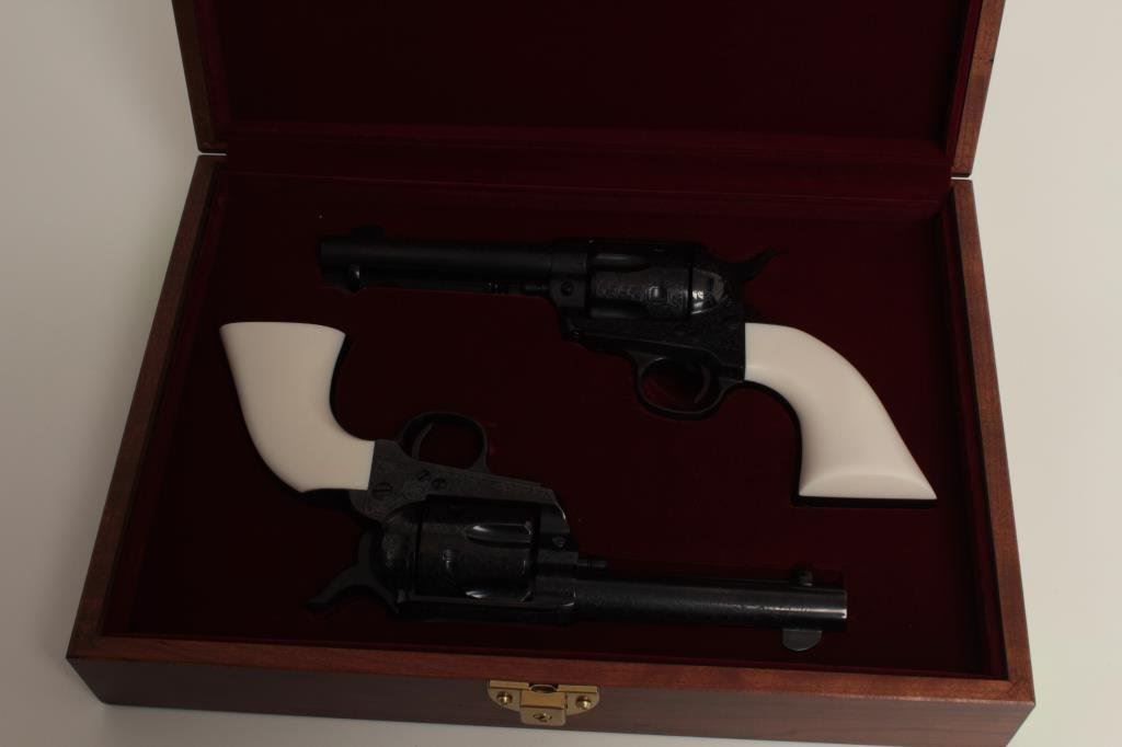 consecutively numbered and engraved SAA revolvers, .357 Magnum caliber, 4.75” barrels, S/Ns E16206 & E16207, blued finish, simulated ivory grips, both in near new condition. The presentation case appears to be of Colt manufacture and the maroon lining of the interior is in the French form-fitted style. The lot is also accompanied by the original factory Great Western cardboard boxes and inserts. (C&R/PPT). Est.: $1,400-$2,800.