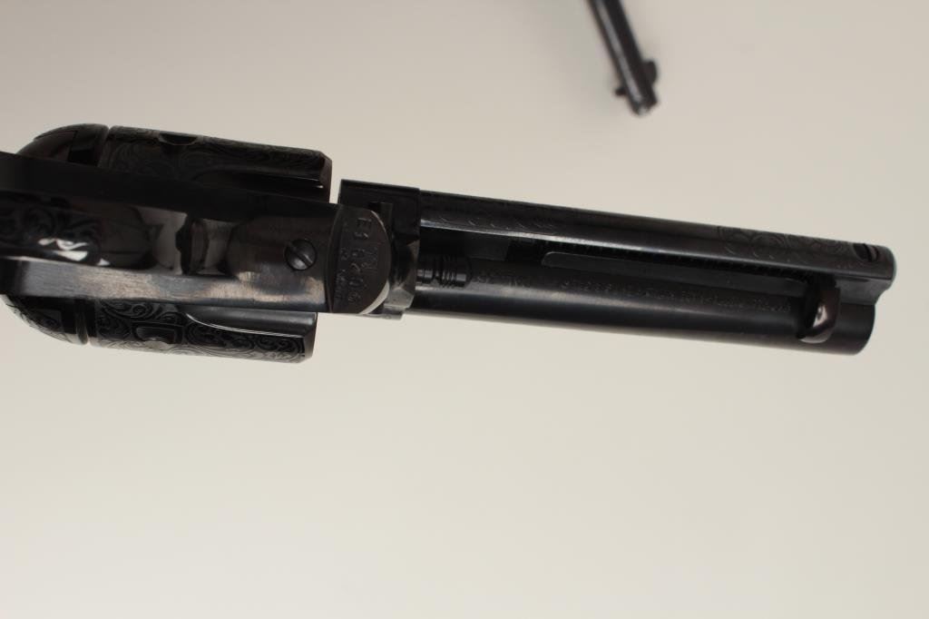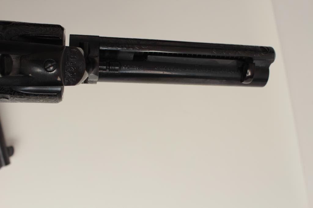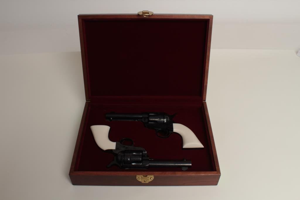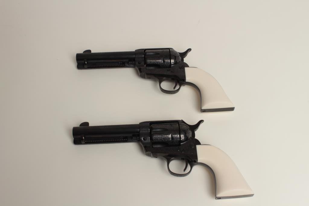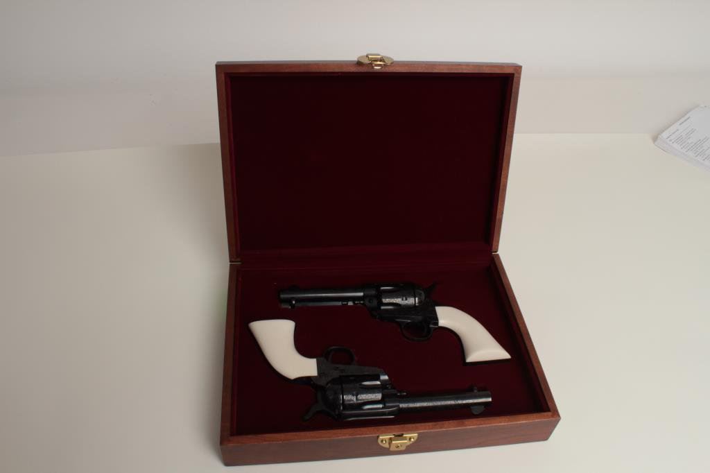 consecutively numbered and engraved SAA revolvers, .357 Magnum caliber, 4.75” barrels, S/Ns E16206 & E16207, blued finish, simulated ivory grips, both in near new condition. The presentation case appears to be of Colt manufacture and the maroon lining of the interior is in the French form-fitted style. The lot is also accompanied by the original factory Great Western cardboard boxes and inserts. (C&R/PPT). Est.: $1,400-$2,800.