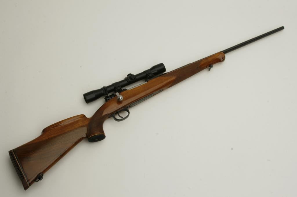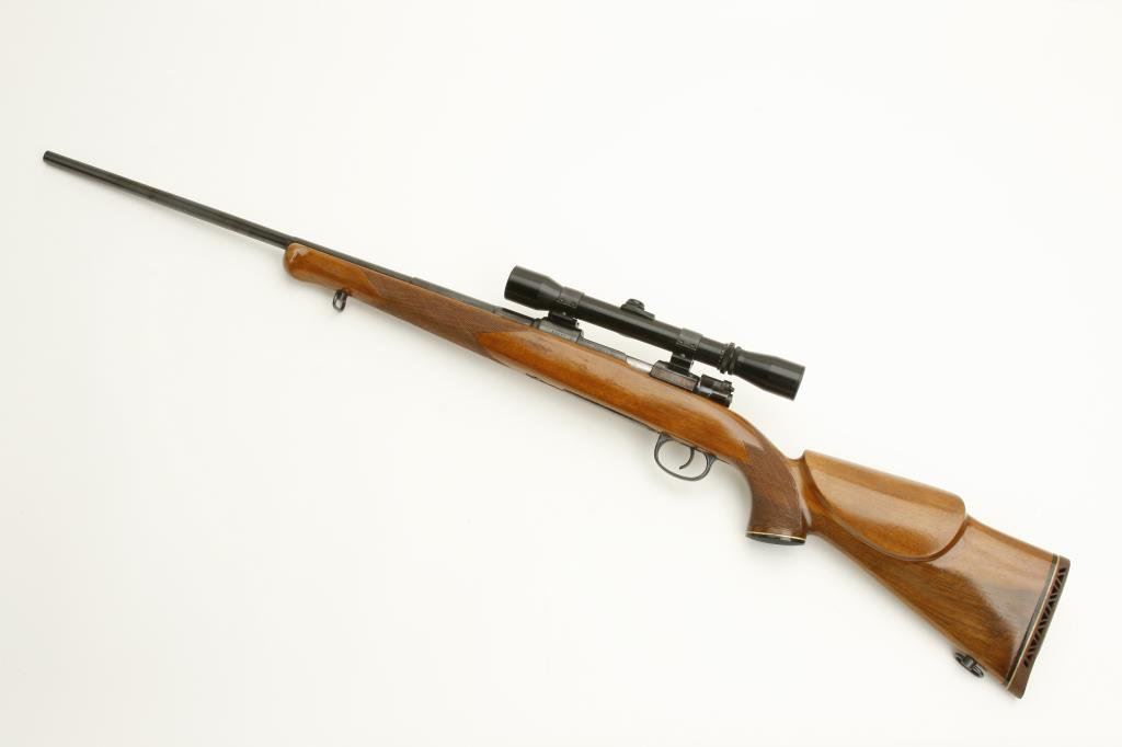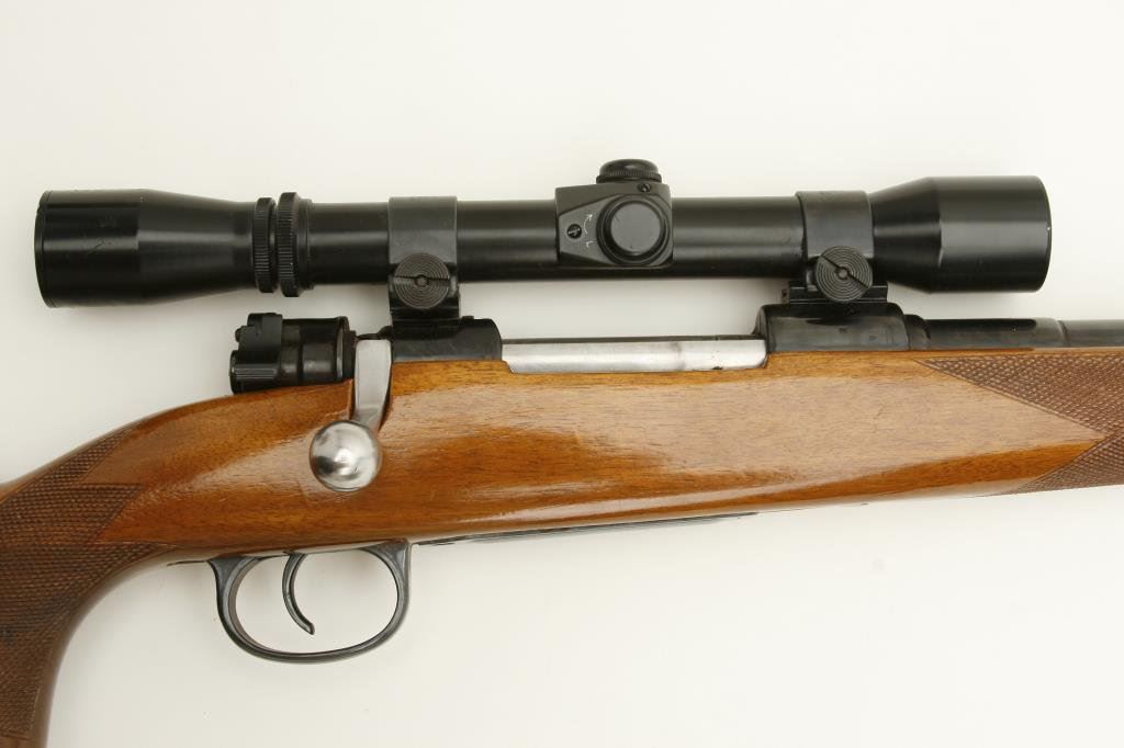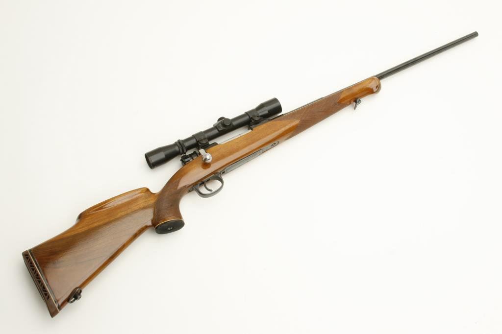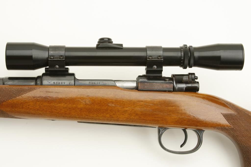 x 57mm caliber, 24” stepped barrel, re-blued finish, checkered wood stock with roll over cheek piece, S/N 50685, mounted with a Golden Eagle 3-7 x 31 scope displaying fine optics. This gun is in overall very good condition as refurbished, crisp action, good markings, very good bore and very good stock with sling swivels and red hard rubber butt pad. (C&R). Est.: $200-$400.