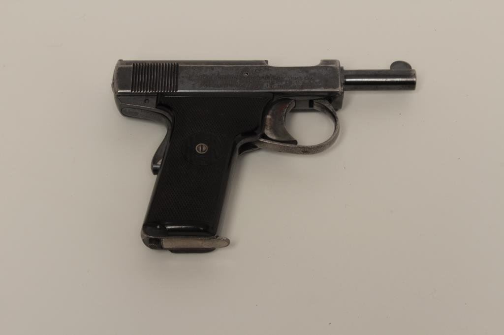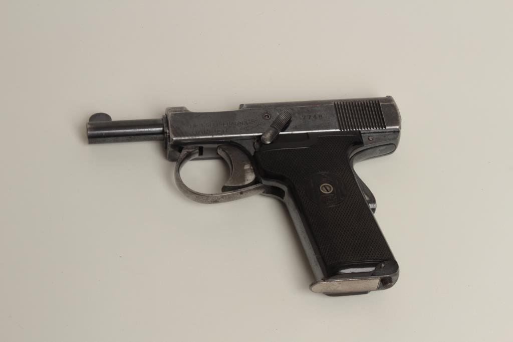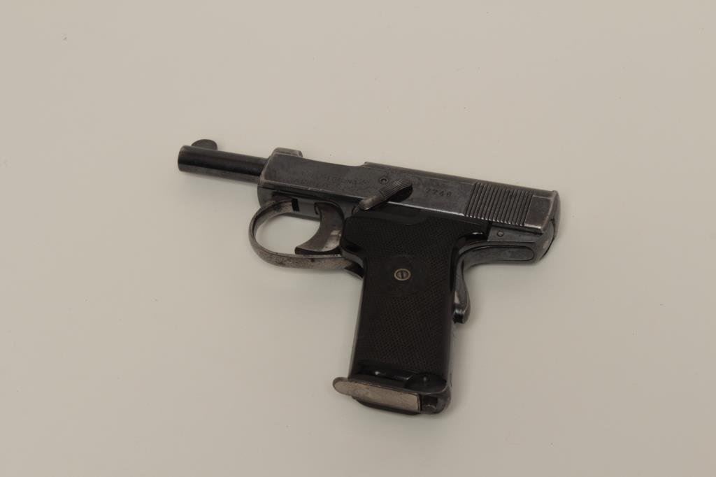 barrel, blued finish, checkered black plastic grips, S/N 7746, in overall good to very good condition with considerable original blue finish remaining, very good bore, sharp markings and overall good grips displaying an old loss at the rear bottom of each grip. (C&R/PPT). Est.: $200-$400.