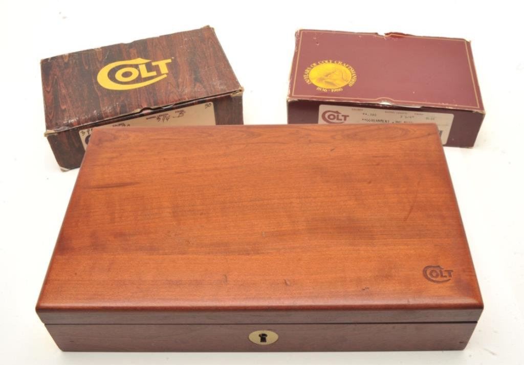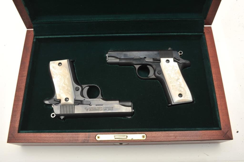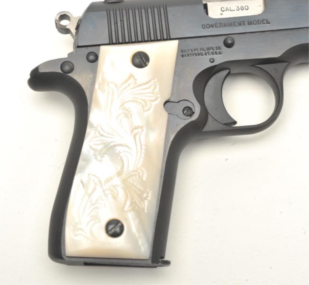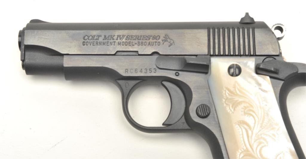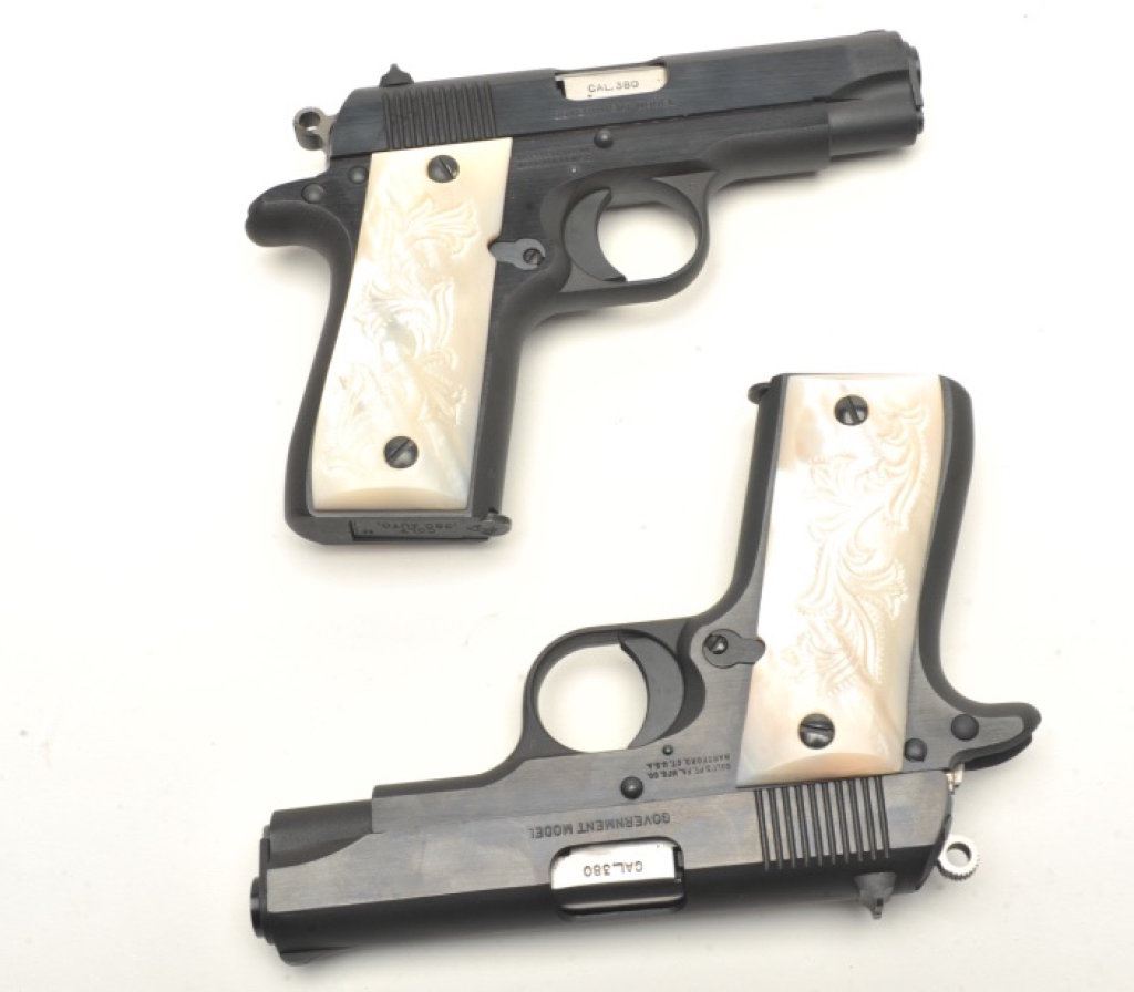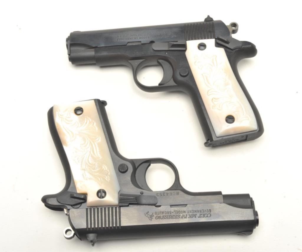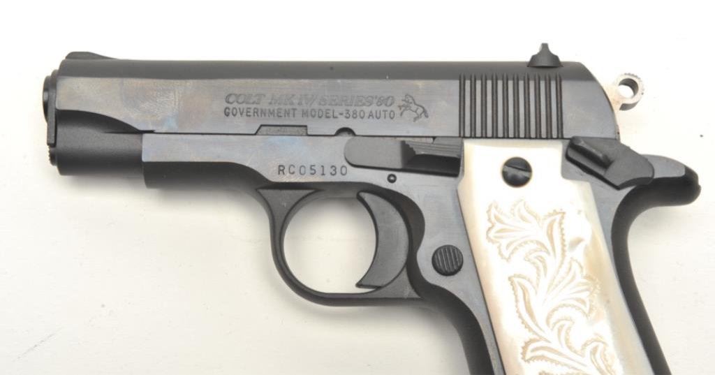 MK IV/Series ’80 semi-automatic pistols, .380 caliber, 3.25” barrels, S/Ns RC64353 & RC05130, blued finish, double carved pearl grips (note: now discontinued and originally costing $500 each); in overall near new condition. Also accompanied by factory cardboard boxes and inserts. (Modern/PPT). Est.: $1,750-$3,500.