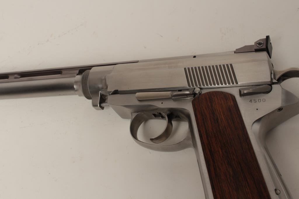 Mag. caliber, 7” barrel, stainless steel, wood grips, S/N 4500, in like new condition with one extra magazine and in factory cardboard box. (Modern/PPT). Est.: $1,400-$2,800.