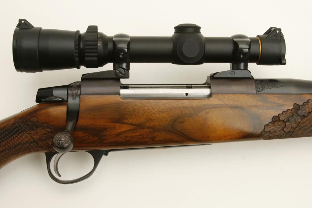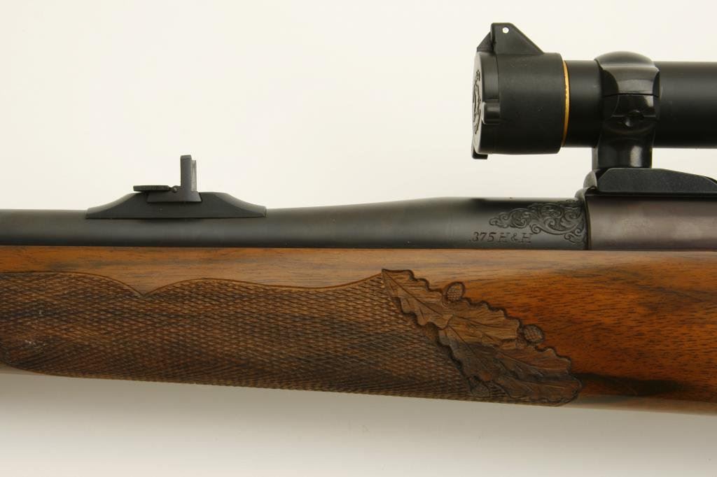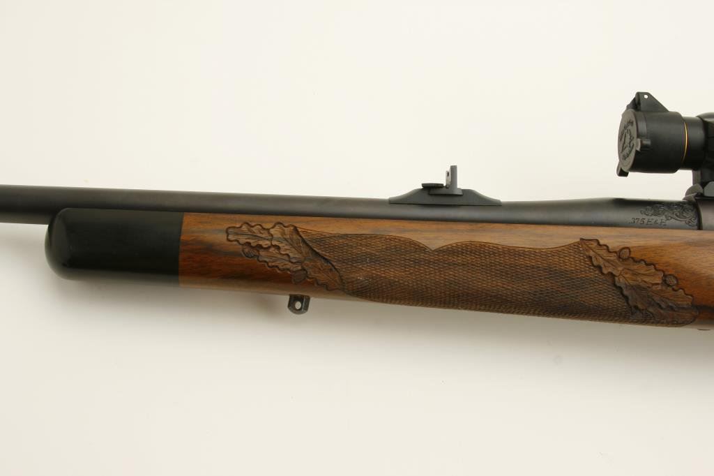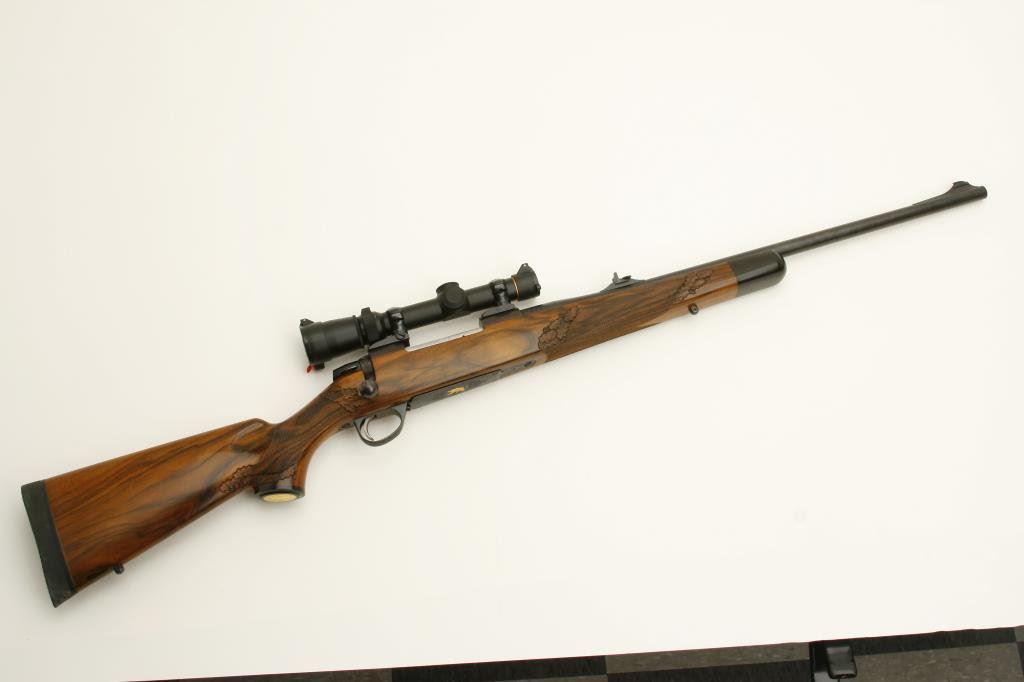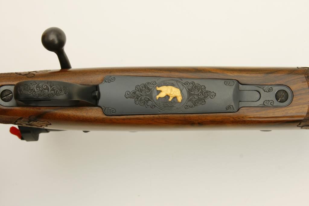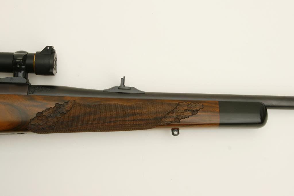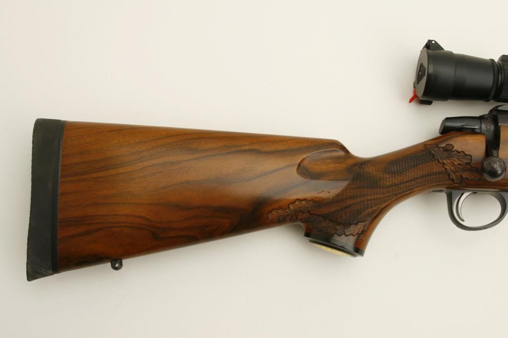 .375 H&H caliber; mounted with a Leupold scope, 1.5 x 5 power on Redfield mounts; fancy figured and select aged walnut stock; finely checkered and oak leaf carved; shot less than 1 box and in excellent condition. Engraved with scrolls on breech and floor plate with gold inlaid vignette of standing bear. Fred Shaw was a master gunsmith located in Orange, CA. and later in North San Diego Co. He made rifles for the carriage trade and celebrities from the 1950’s thru the late 1980’s. To reproduce a quality rifle of this type at today’s rates would be approximately $5,000 estimated cost; S/N 593865 (Modern). Est.: $2,000-$4,000.