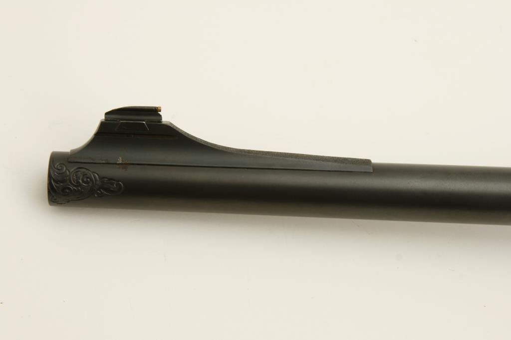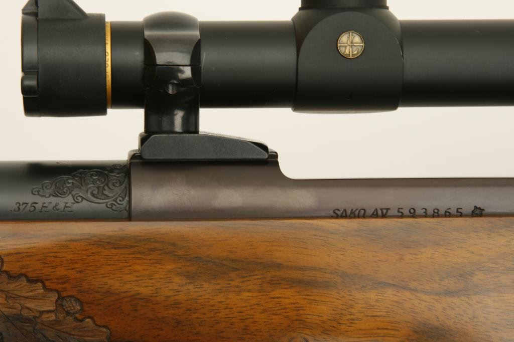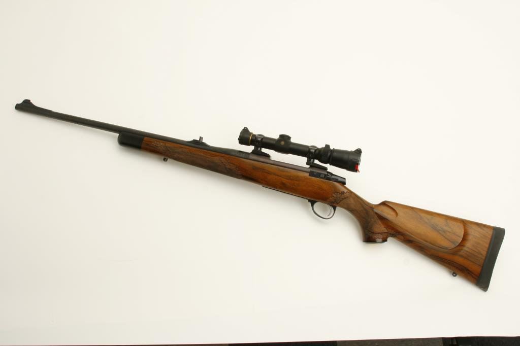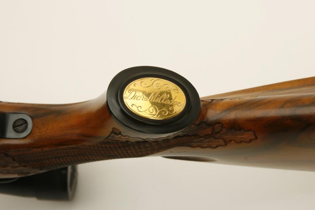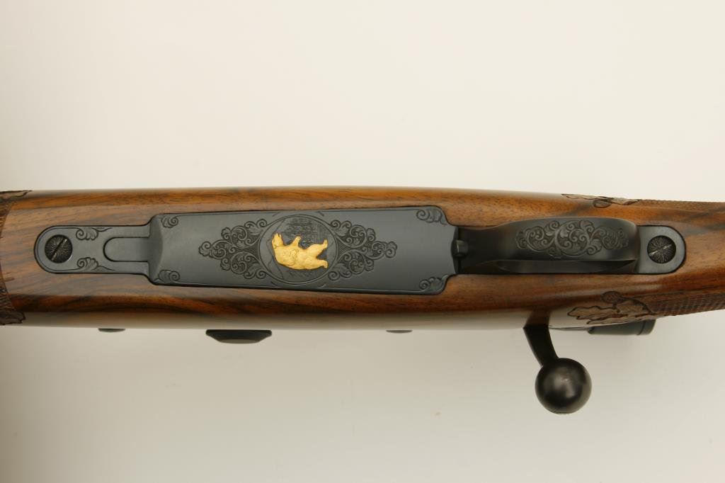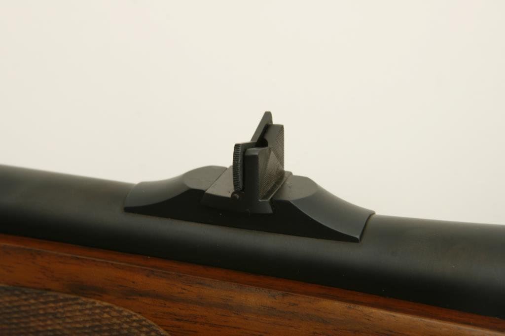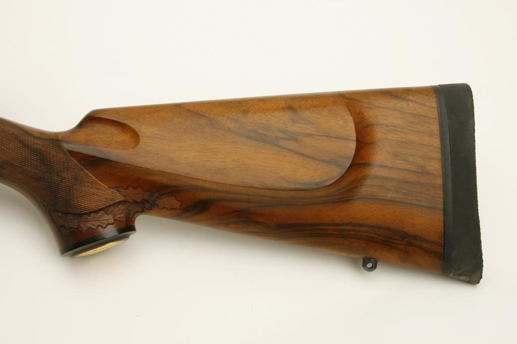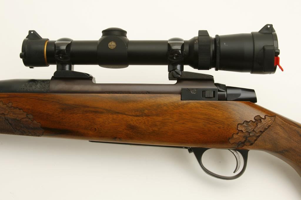 .375 H&H caliber; mounted with a Leupold scope, 1.5 x 5 power on Redfield mounts; fancy figured and select aged walnut stock; finely checkered and oak leaf carved; shot less than 1 box and in excellent condition. Engraved with scrolls on breech and floor plate with gold inlaid vignette of standing bear. Fred Shaw was a master gunsmith located in Orange, CA. and later in North San Diego Co. He made rifles for the carriage trade and celebrities from the 1950’s thru the late 1980’s. To reproduce a quality rifle of this type at today’s rates would be approximately $5,000 estimated cost; S/N 593865 (Modern). Est.: $2,000-$4,000.