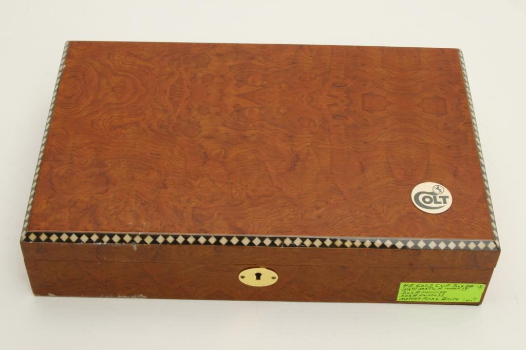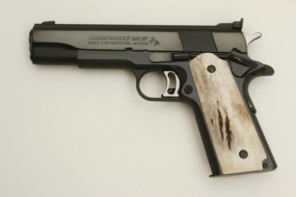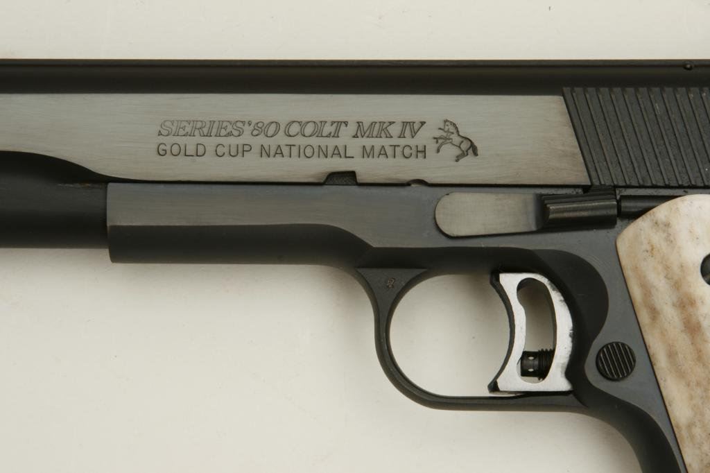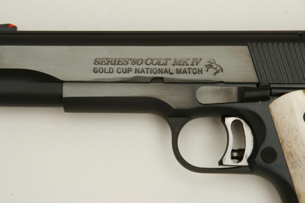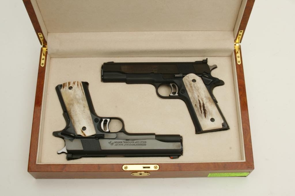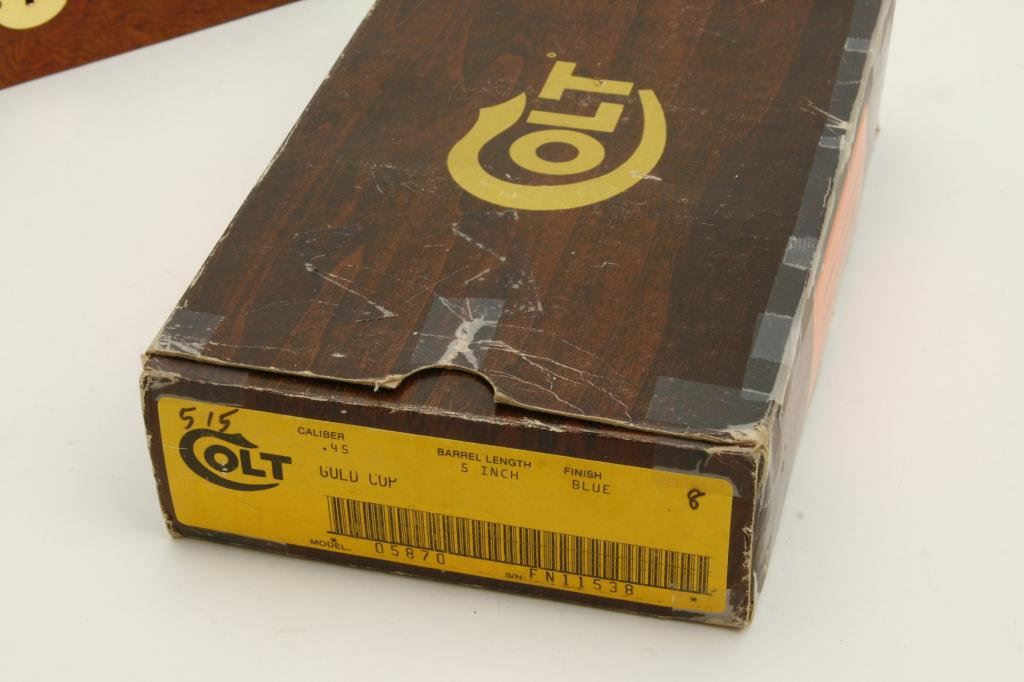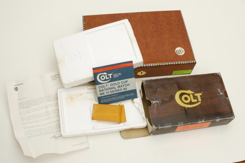 2 Colt MK IV/Series 80 Gold Cup National Match semi-automatic pistols, .45 caliber, 5” barrels, blued finish, stag grips, S/Ns FN11538 & FN32432, in overall near new condition and accompanied by a factory wood grain cardboard box and inserts for #FN11538. (Modern/PPT). Est.: $2,000-$4,000.