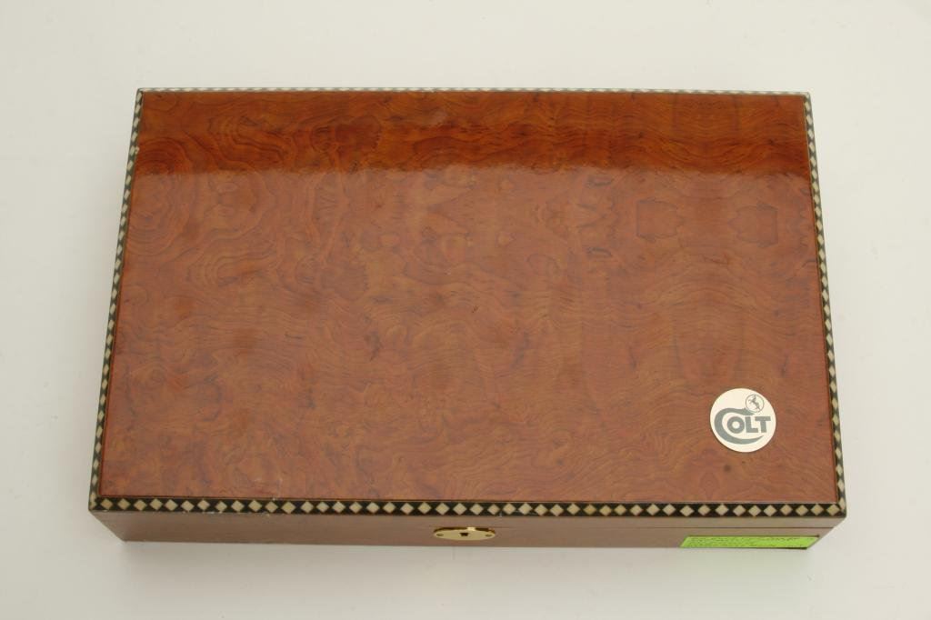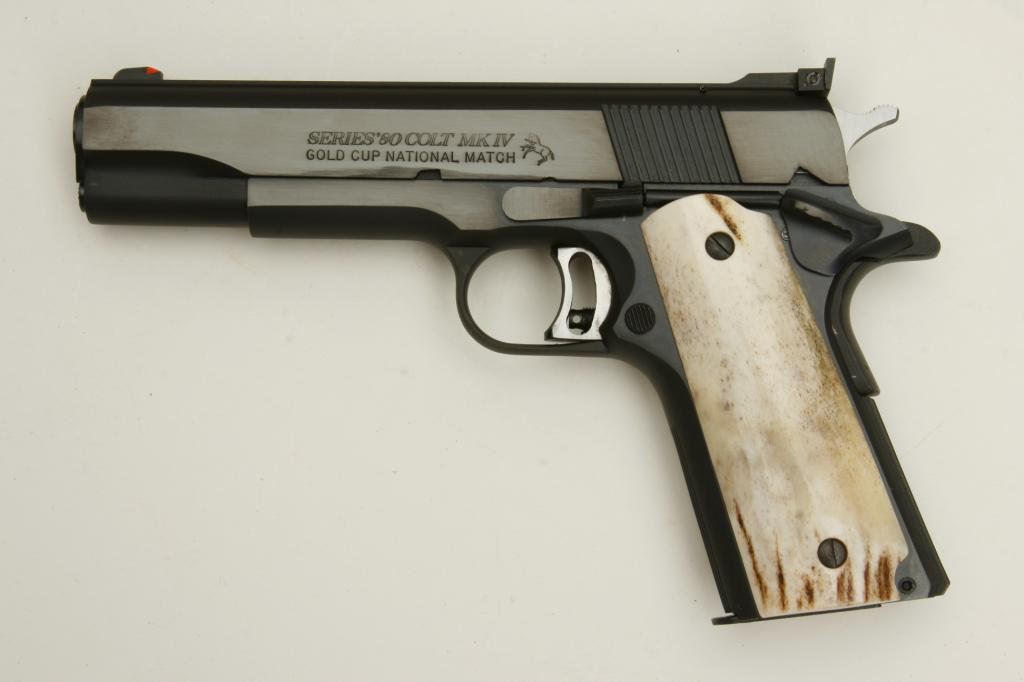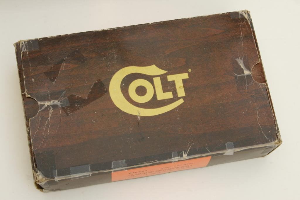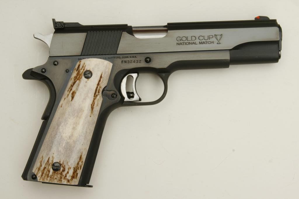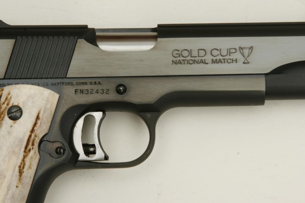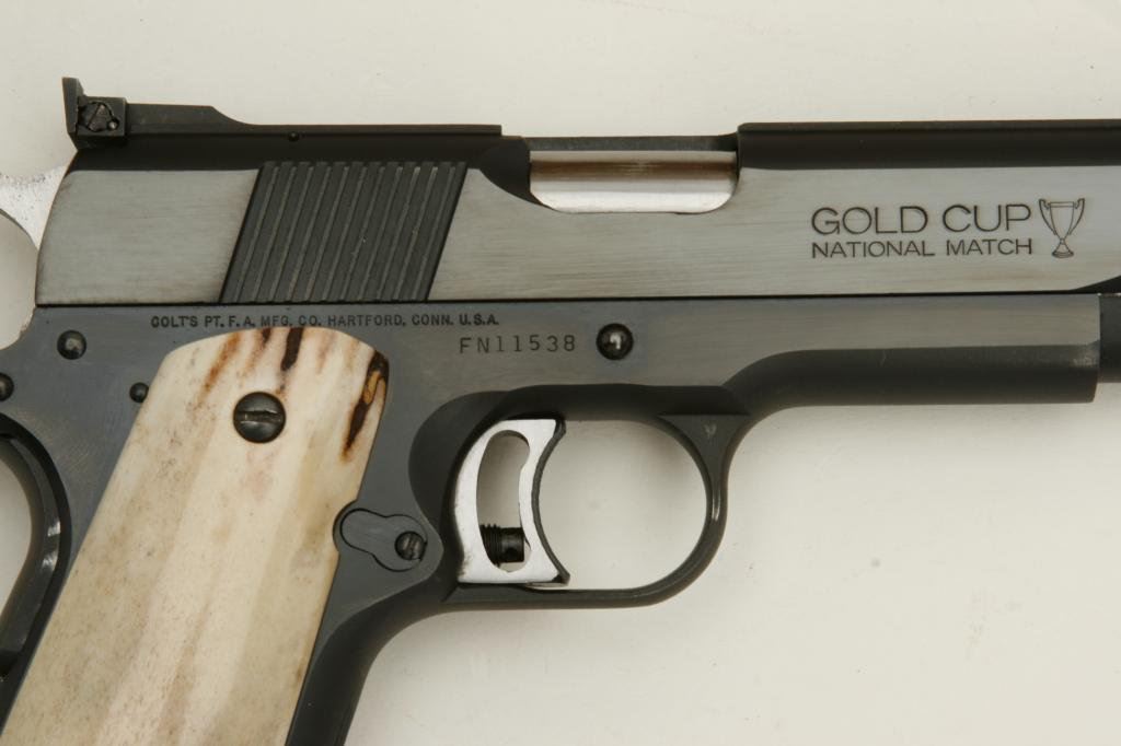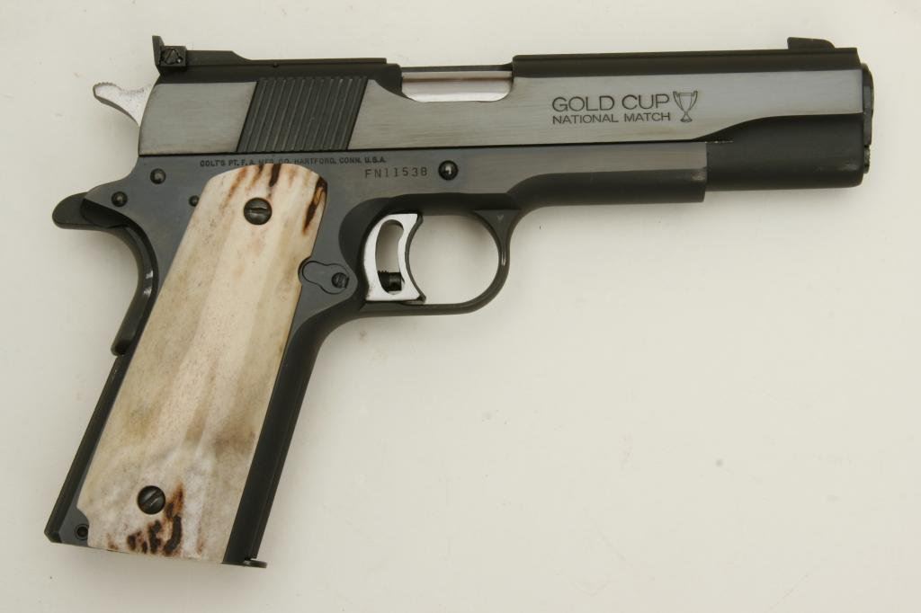 2 Colt MK IV/Series 80 Gold Cup National Match semi-automatic pistols, .45 caliber, 5” barrels, blued finish, stag grips, S/Ns FN11538 & FN32432, in overall near new condition and accompanied by a factory wood grain cardboard box and inserts for #FN11538. (Modern/PPT). Est.: $2,000-$4,000.