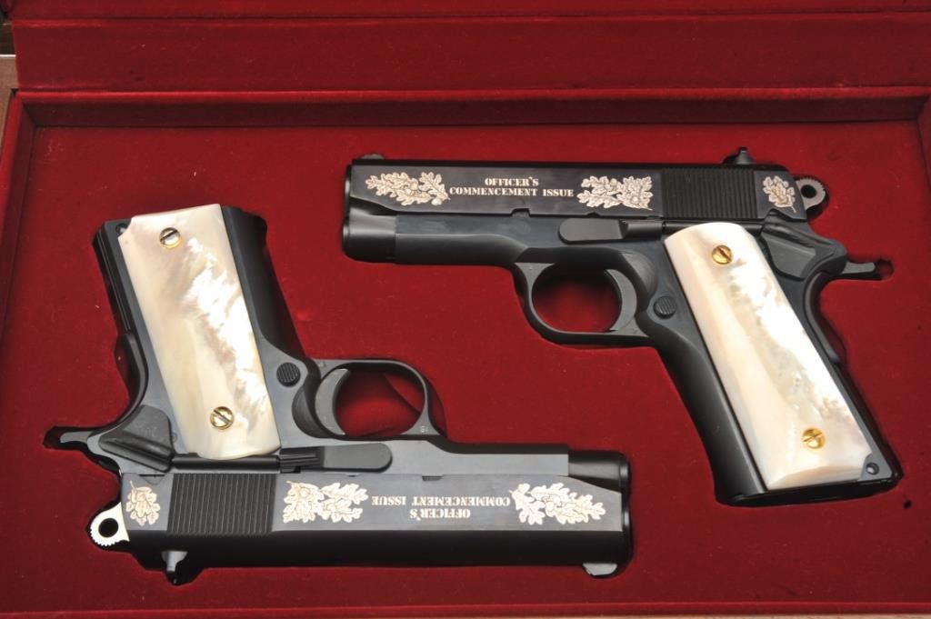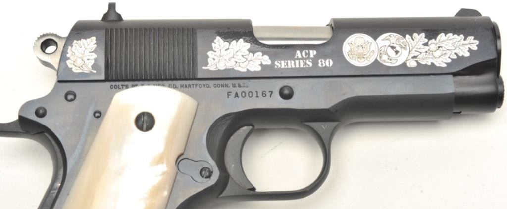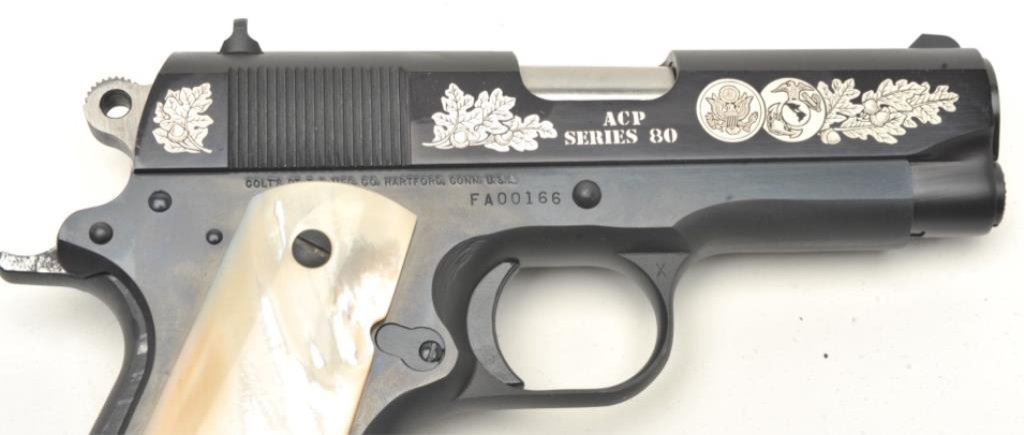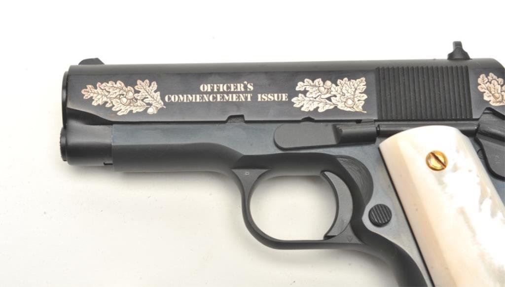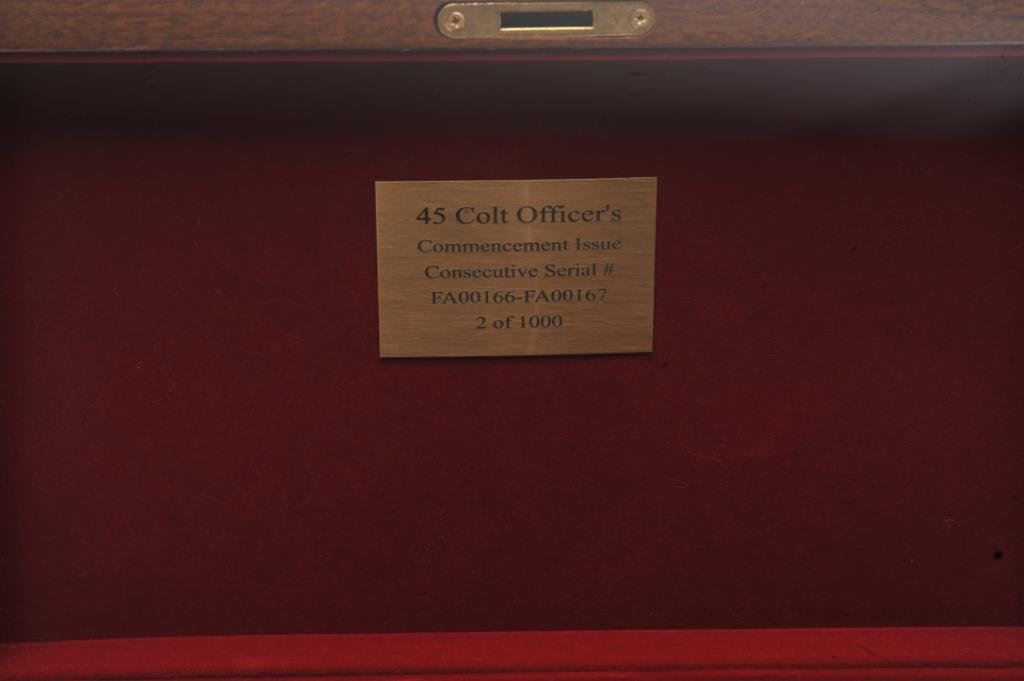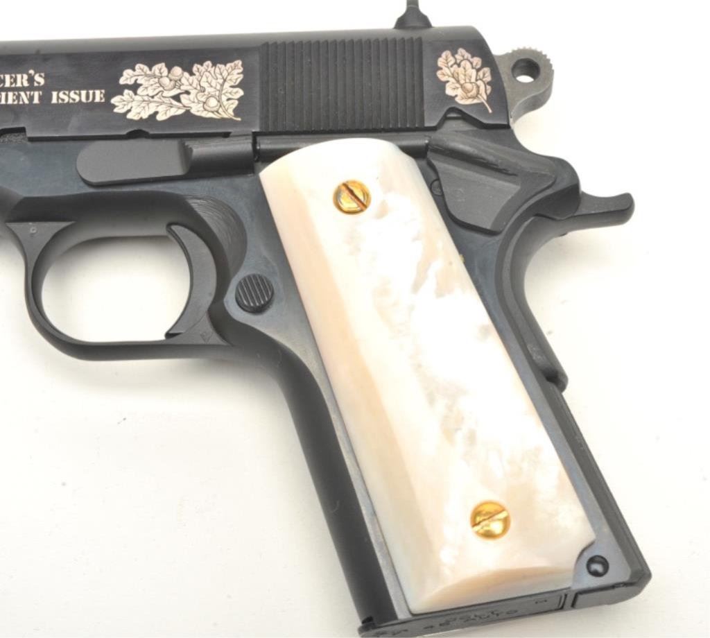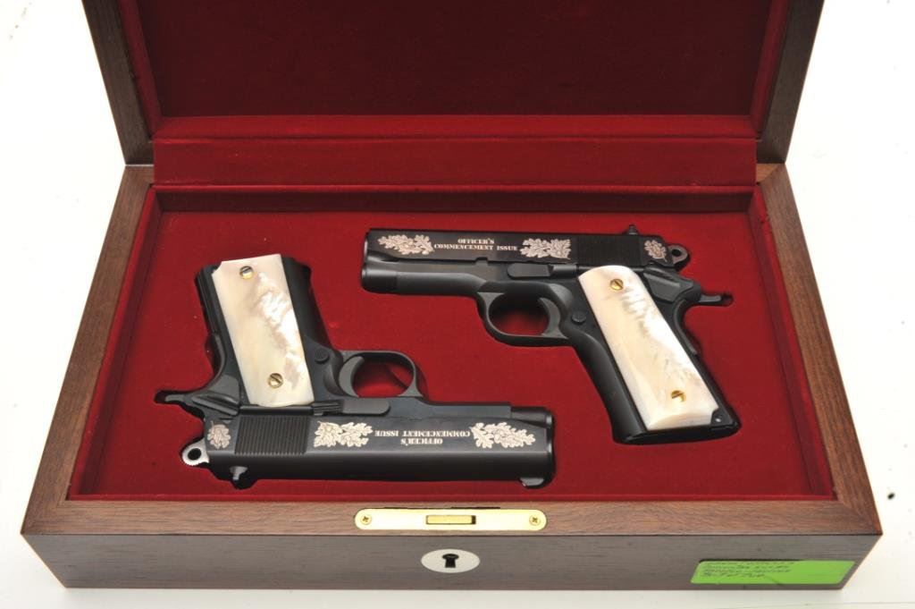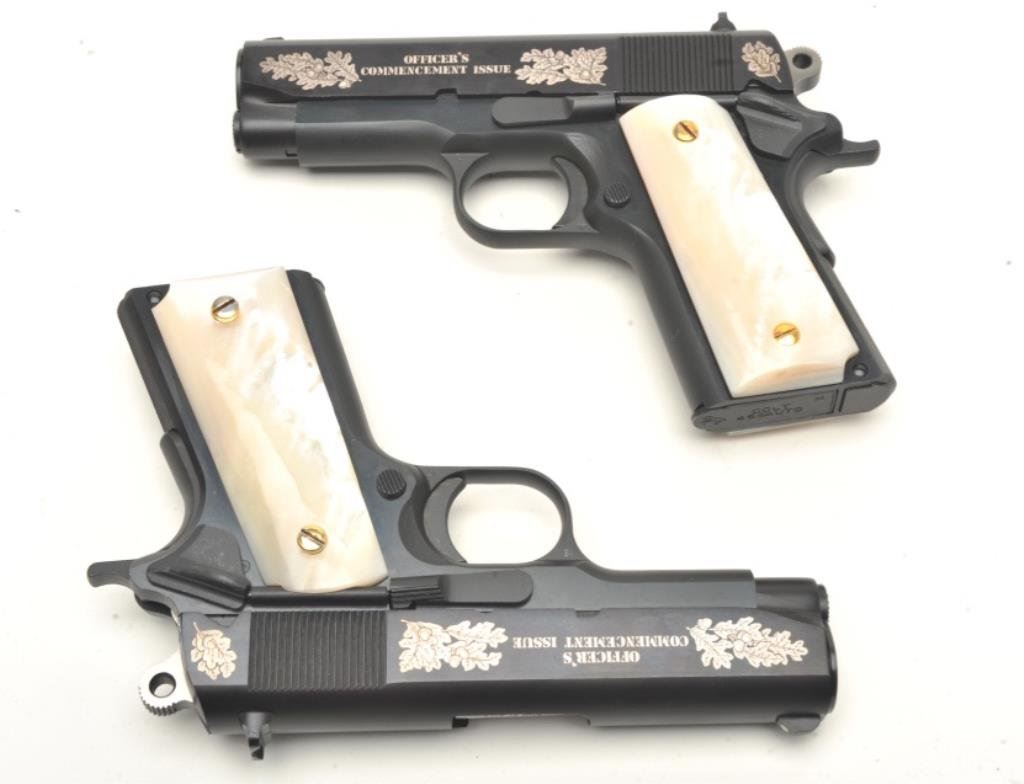 Gun Shop Officer’s Commencement Issue Series 80 semi-automatic pistols and their respective Colt factory wood grain cardboard boxes with correct end labels; .45 ACP caliber, 3.75” barrels, S/Ns FA00166 and FA00167 (consecutively numbered), black finish with silver ornamentation to both sides of the slides and pearl grips. Both guns are in near new condition with custom casing showing a plaque on inside of lid indicating “2 of 1000”; outside of lid has “COLT” insignia in lower right corner. A beautiful pair of limited edition Colts with presentation casing and original factory boxes. (Modern/PPT). Est.: $2,000-$4,000.