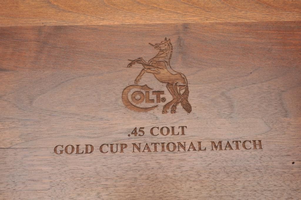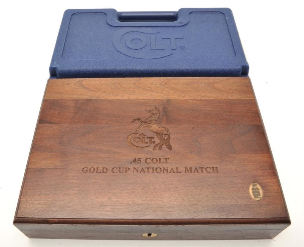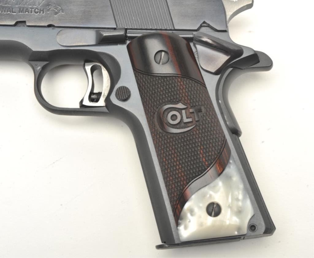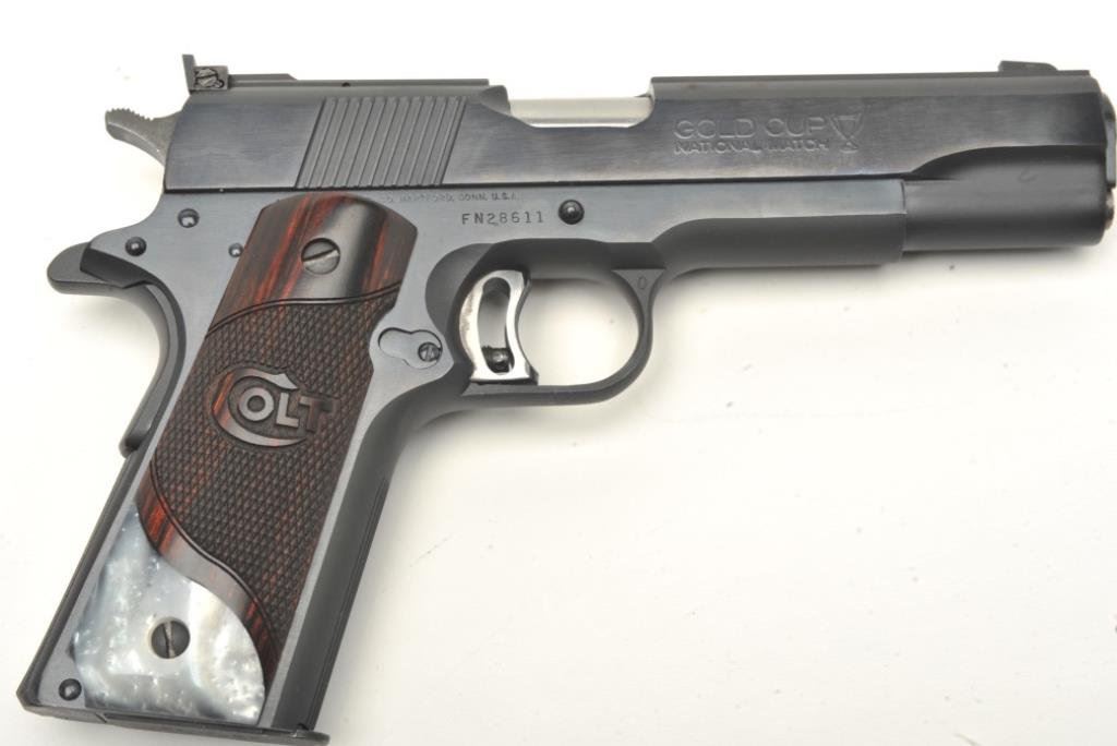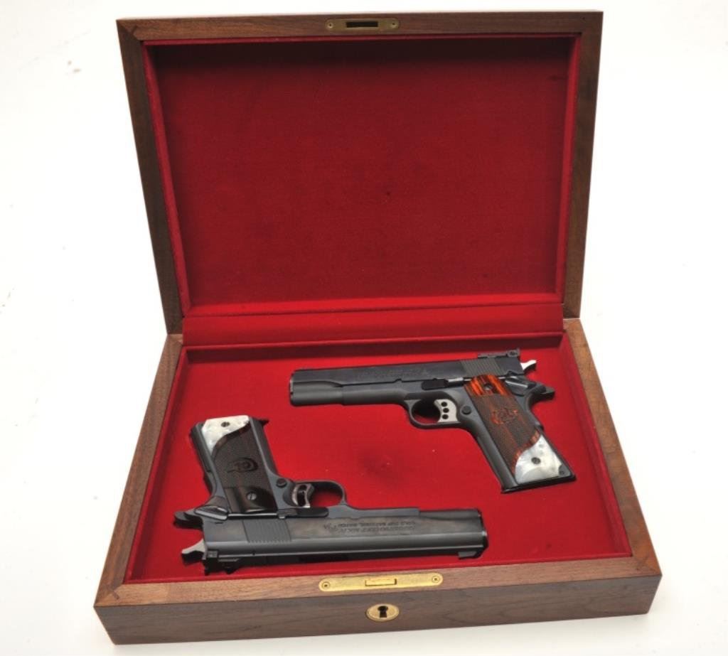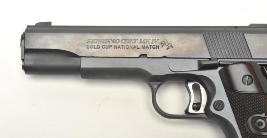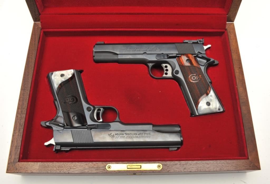 80/MK IV Gold Cup National Match semi-automatic pistols, .45 caliber, 5” barrel, blued finish, custom checkered wood grips with pearl accent bottoms, S/Ns FN102338 & FN28611, in overall near new condition. Accompanied by Colt factory blue hard case for FN102338. (Modern/PPT). Est.: $2,000-$4,000.