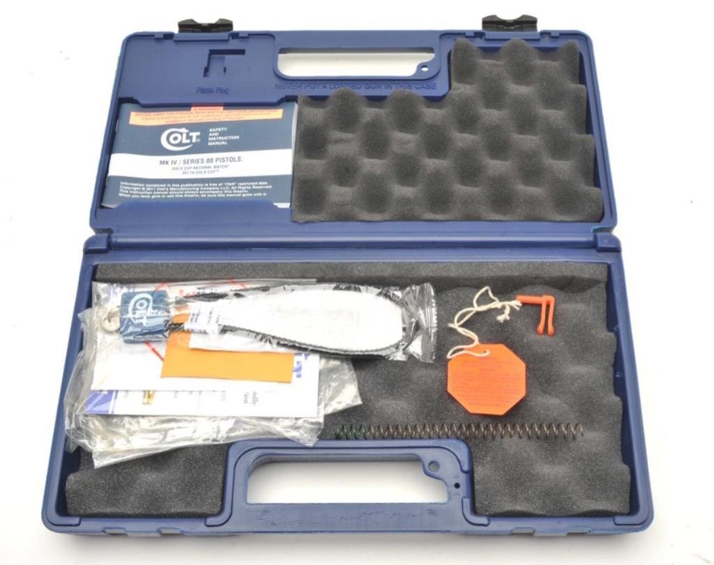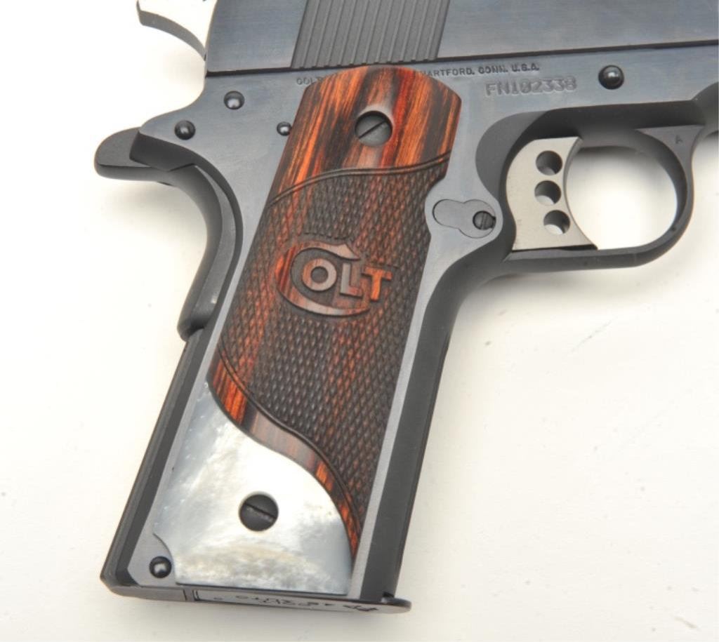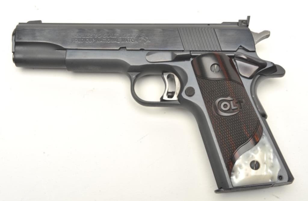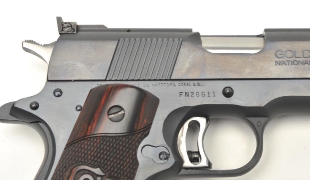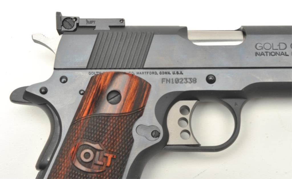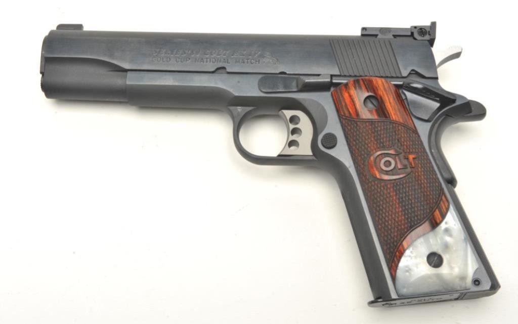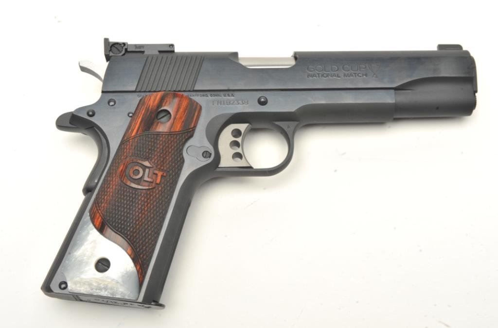 80/MK IV Gold Cup National Match semi-automatic pistols, .45 caliber, 5” barrel, blued finish, custom checkered wood grips with pearl accent bottoms, S/Ns FN102338 & FN28611, in overall near new condition. Accompanied by Colt factory blue hard case for FN102338. (Modern/PPT). Est.: $2,000-$4,000.