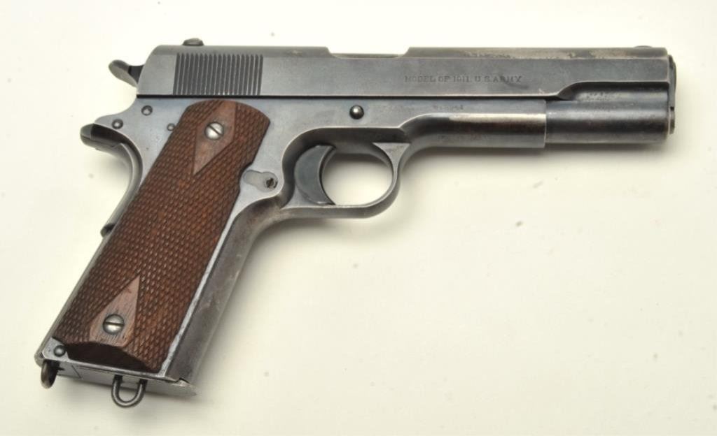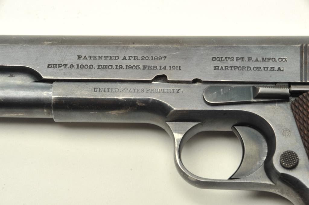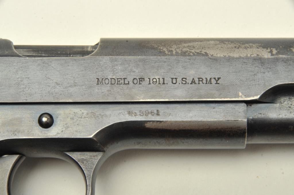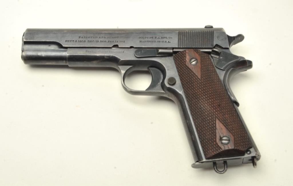 caliber, serial #3961. The pistol is in very good overall condition with a 5” barrel. The pistol is marked, United States Property”, with the Rampant Colt emblem displayed at the rear of the slide. The pistol was manufactured in 1912 and is marked, “MODEL OF 1911. U.S. ARMY”, on the slide. The pistol retains 80-90% of its original blued finish with wear at the muzzle and along the slide. The checkered wood grips are in good condition showing use and some flattening of checkering. The butt retains the lanyard ring. The pistol comes with a correct, 1st type magazine with lanyard ring. The bore is good, the action is crisp and markings are sharp on this highly desirable pre-World War I Colt. (C+R) Est.: $5,500-$7,000.