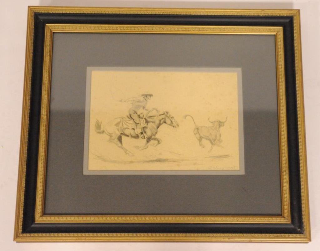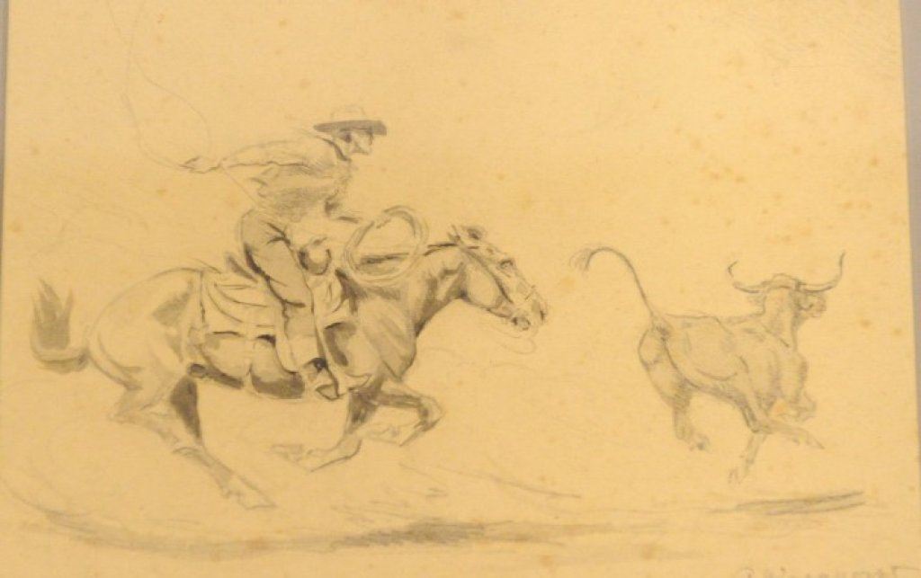 Wieghorst”. Shows great action of cowboy roping steer on the run. Measures 6 ½” x 9 ½”. Needs cleaning and minor conservation. Former Dr. John Murphy collection, La Jolla. Est.: $300-$600