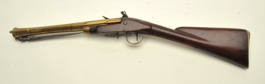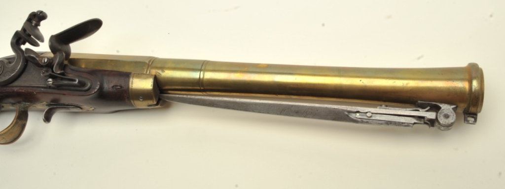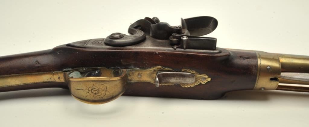 mounted spring bayonet, half stock, and side mounted ramrod circa 18th to early 19th century. Measures 30” overall with 14 ¼” brass barrel constructed in 3 stages with ringed cannon muzzle of 1 ¼” across inner edge with thick walls. In good to very good condition overall with good markings and wood along with some minor pitting on the bayonet. All original flintlock parts and not rubbed out. A premium maker. (Antique) Est.:$2000-$4000