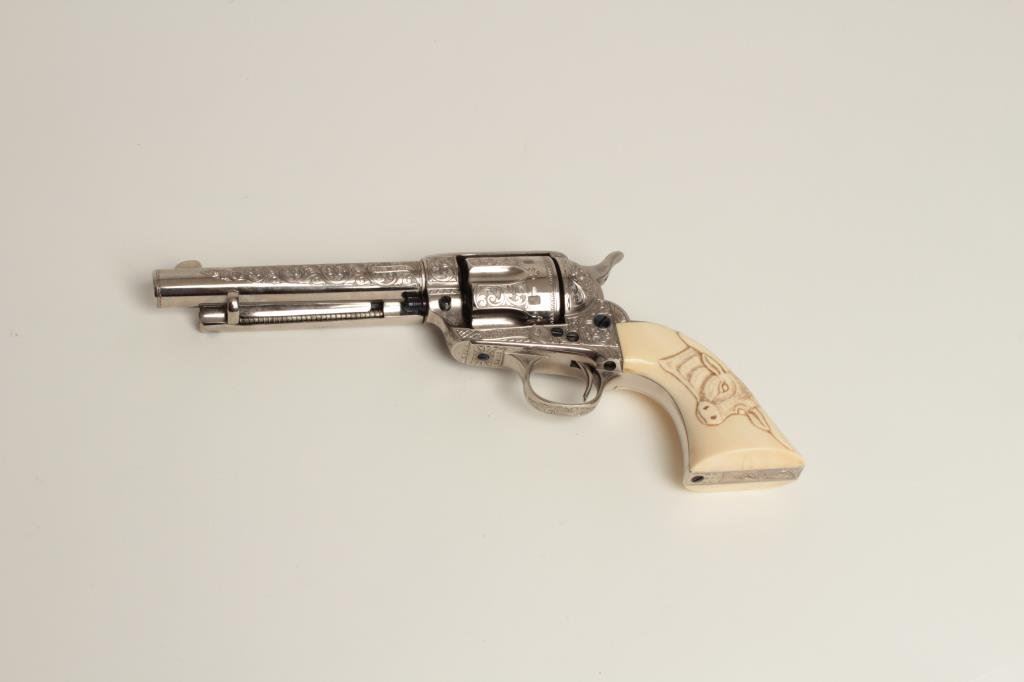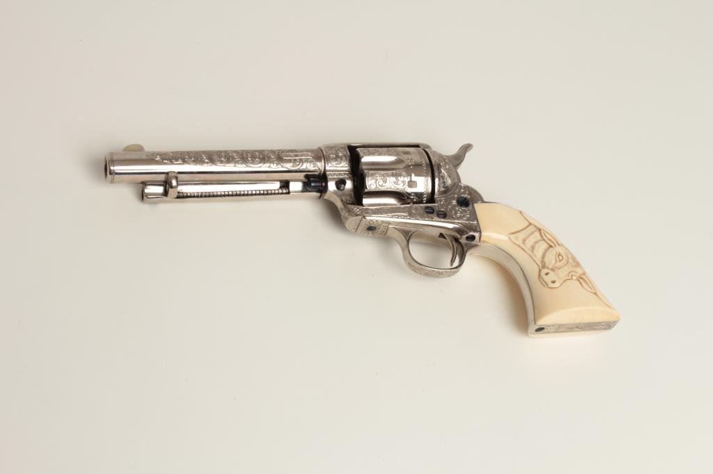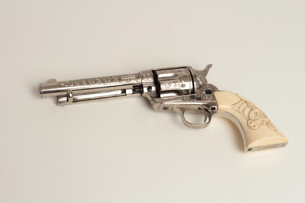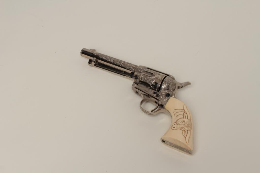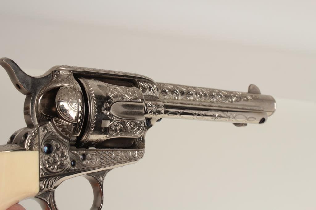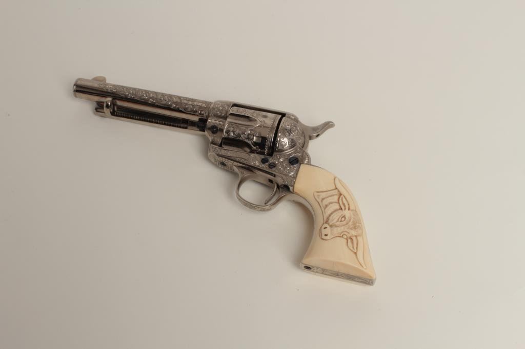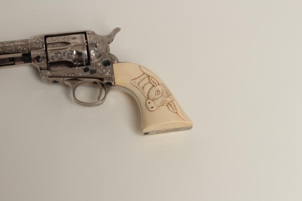 caliber with 5 ½” barrel, nickel plated with fire blue screws and small parts, S/N 219500 showing finely and fully Helfricht style engraving in “C” plus pattern with high relief carved steerhead ivory grips. Signed “Ben Lane Jr, 1 of 2, 1991” and restored by Lane at time of engraving. Ben Lane in our opinion best emulates the style of classic engravers such as Helfricht and Nimschke. Ben is a personal friend and longtime member of Texas Gun Collectors and Colt Collectors Association. He has engraved Colts for the top collectors in the world and has just retired after a 40 plus year stellar career. His wife is a superb ivory carver. To replace this Colt at Ben’s last custom order rate would exceed 10000 depending on the cost of a sharp 1st gen. single action. A GEM! (See pair to this revolver at lot 185). (C&R/PPT) Est.: $3500-$7000+