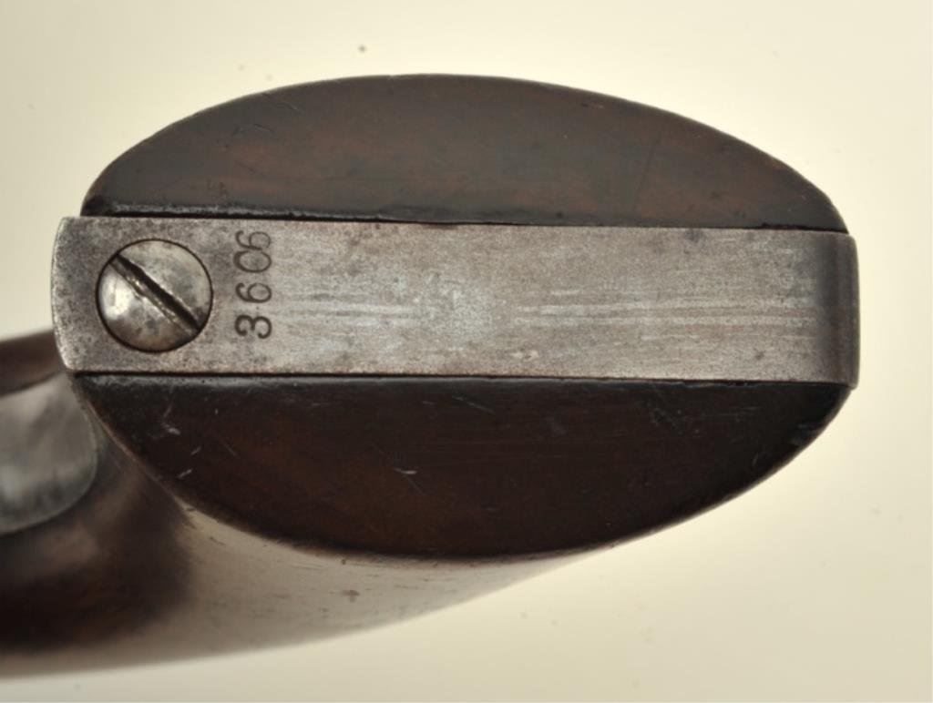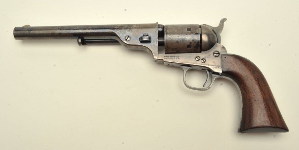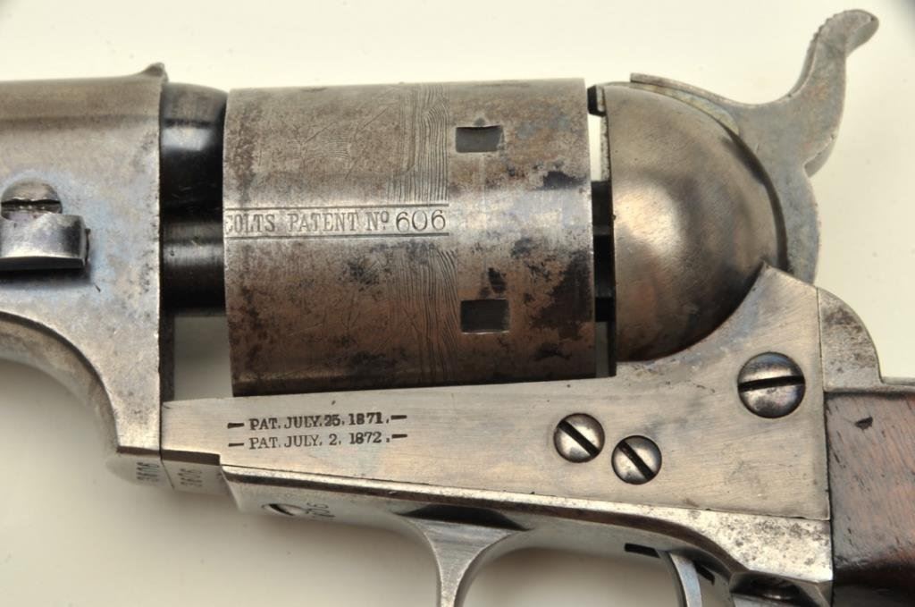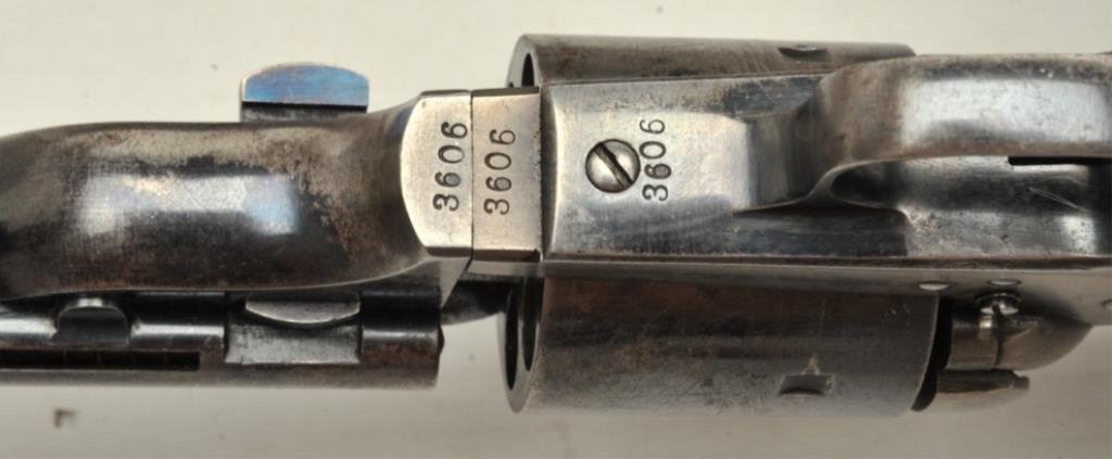 caliber, 7.5” barrel, desirable blued and case hardened finish, wood grips, S/N 3606, in overall near fine condition with considerable original blue finish remaining on barrel, ejector housing and straps; also ample original case colors on the frame; crisp action, sharp markings and fine bore; grips are very good to fine. The cylinder scene is sharp. A key Model in the Colt line of revolvers and a truly scarce example in great shape given only 7,000 of this Model were produced between 1872 and 1873. (Antique). Est.: $9,000-$18,000.