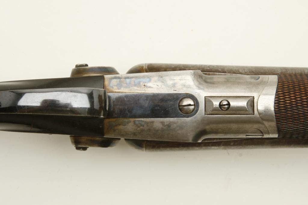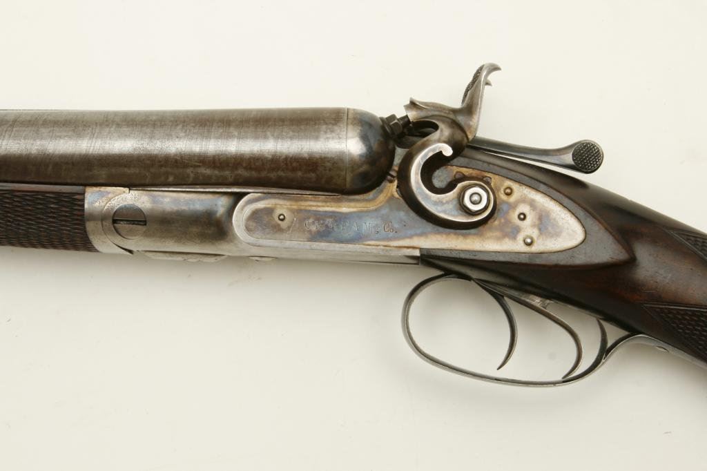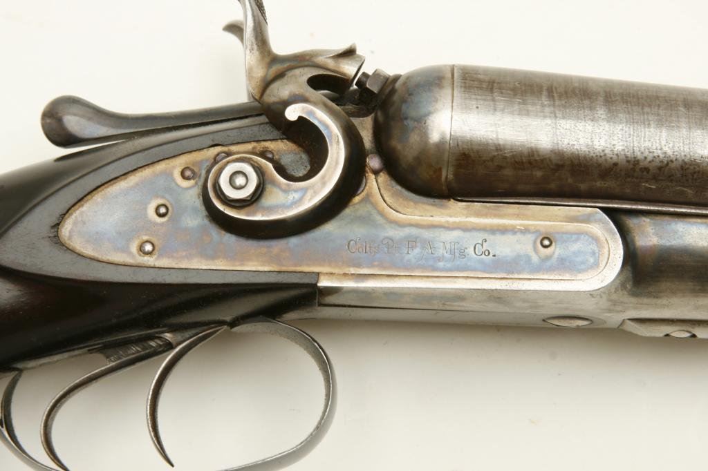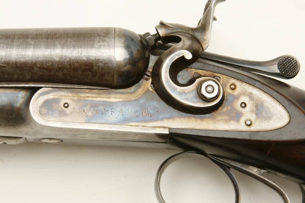 12GA with 30” barrels in excellent original condition, S/N 1586. A strong 9.5 on a 1-10 scale showing nearly all the original tobacco brown finish with bright case hardening. The stocks are also near excellent with just minor handling and storage marks. 70%-80% original blue on steel butt plate. The lever shows 90%-95% original bright blue. The action is crisp and locks up tight. The bores are bright with no problems. Unlikely to improve upon this high condition Colt. (Antique) Est.: $3000-$6000
