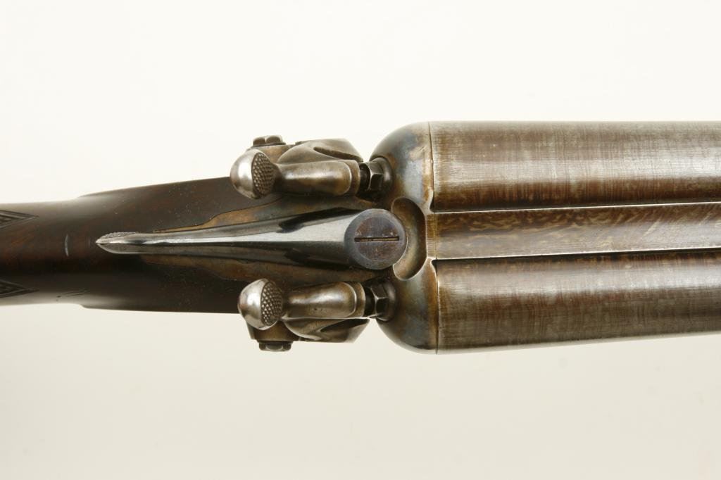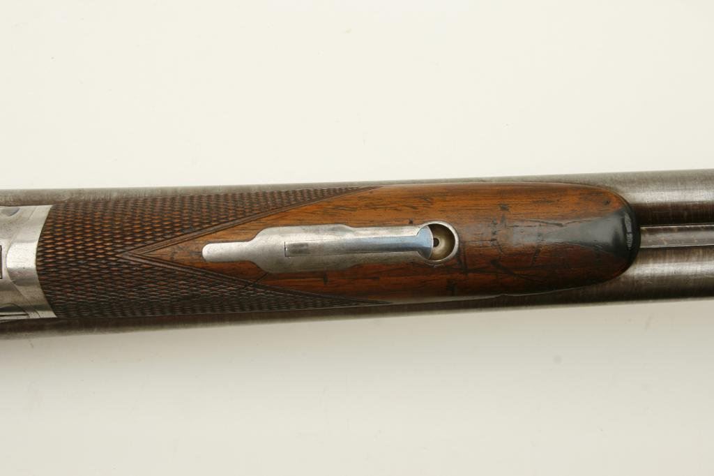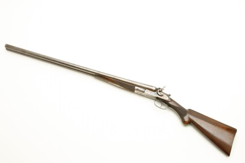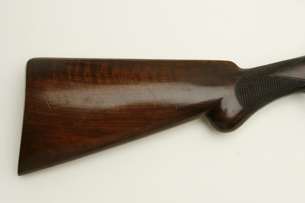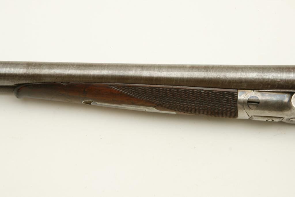 12GA with 30” barrels in excellent original condition, S/N 1586. A strong 9.5 on a 1-10 scale showing nearly all the original tobacco brown finish with bright case hardening. The stocks are also near excellent with just minor handling and storage marks. 70%-80% original blue on steel butt plate. The lever shows 90%-95% original bright blue. The action is crisp and locks up tight. The bores are bright with no problems. Unlikely to improve upon this high condition Colt. (Antique) Est.: $3000-$6000