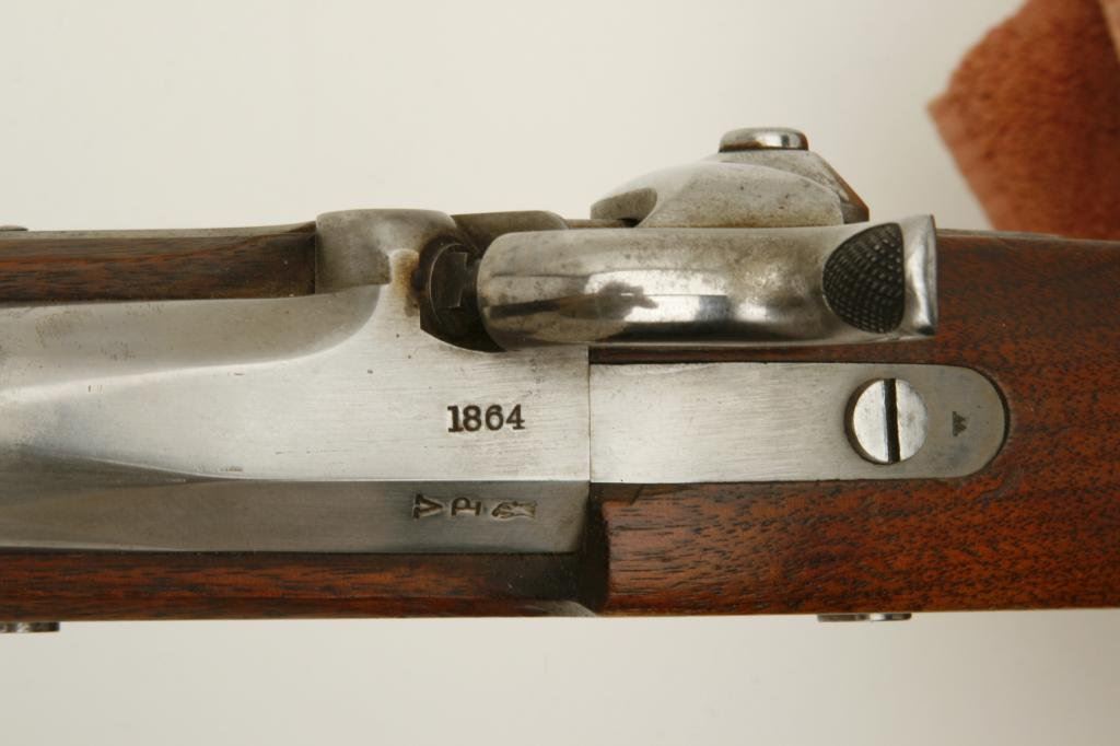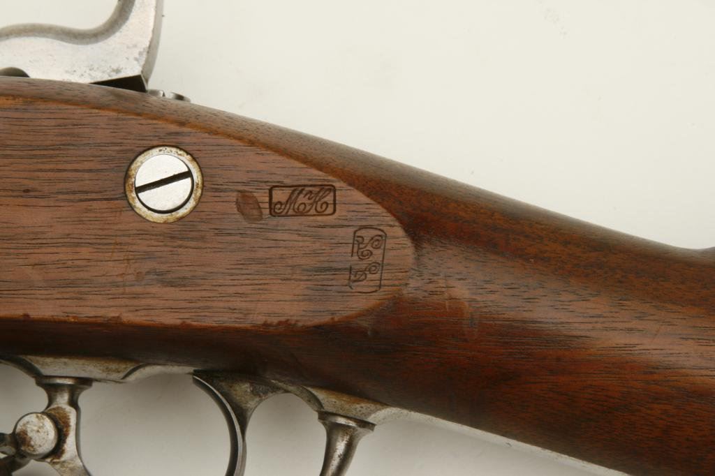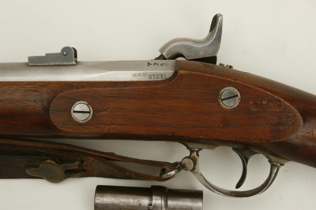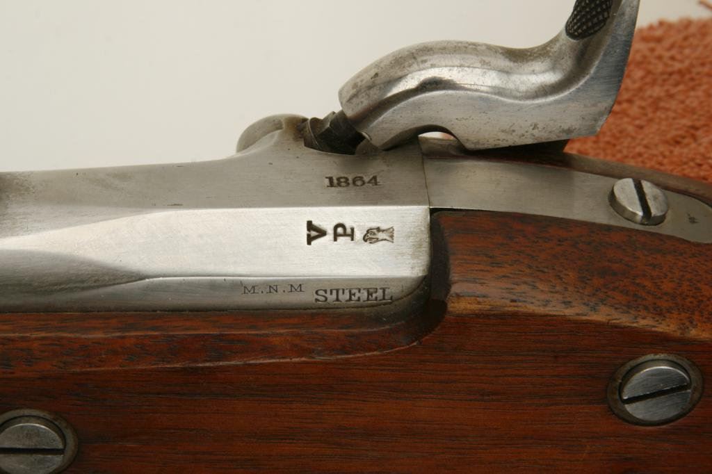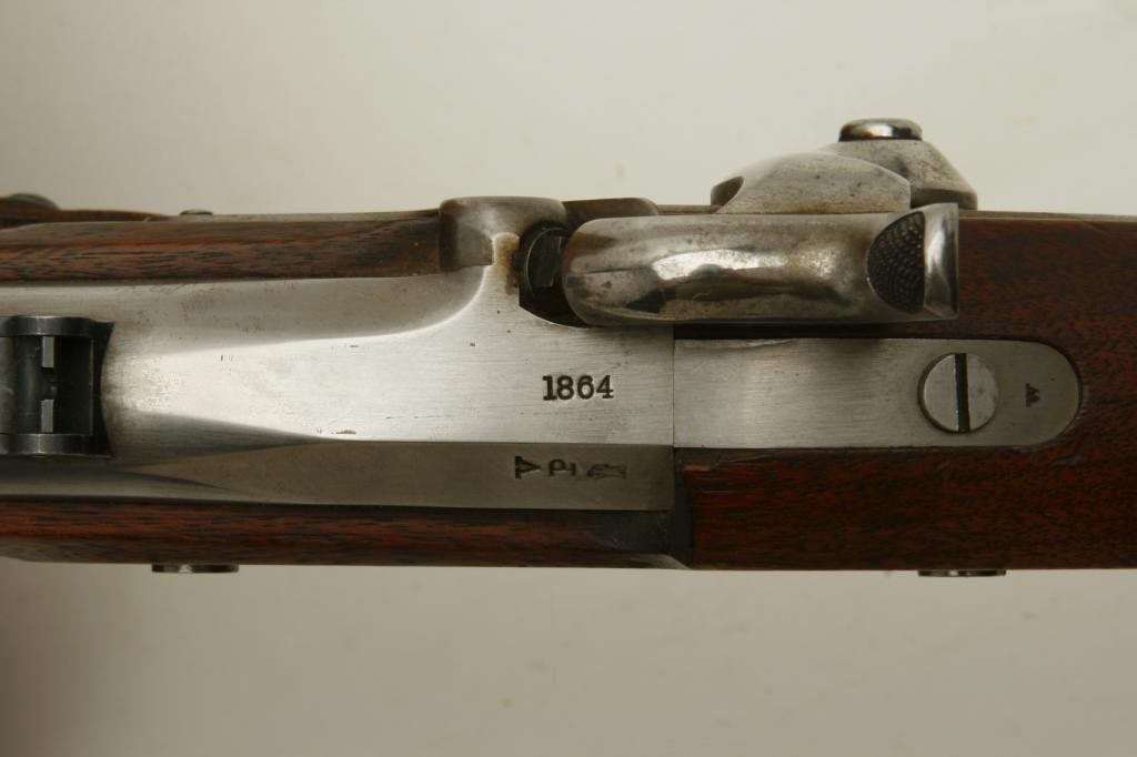dated 1864 in fine original condition with bayonet and sling. The rifle shows its original arsenal bright with very slight beginning minor age. Two sharp and well defined inspector’s cartouches in stock with some minor bumps and storage marks. The edges or ramrod channel are sharp and well defined with correct ramrod retained. A 9.95 on a 1-10 scale. (Antique) Est.: $3500-$7000