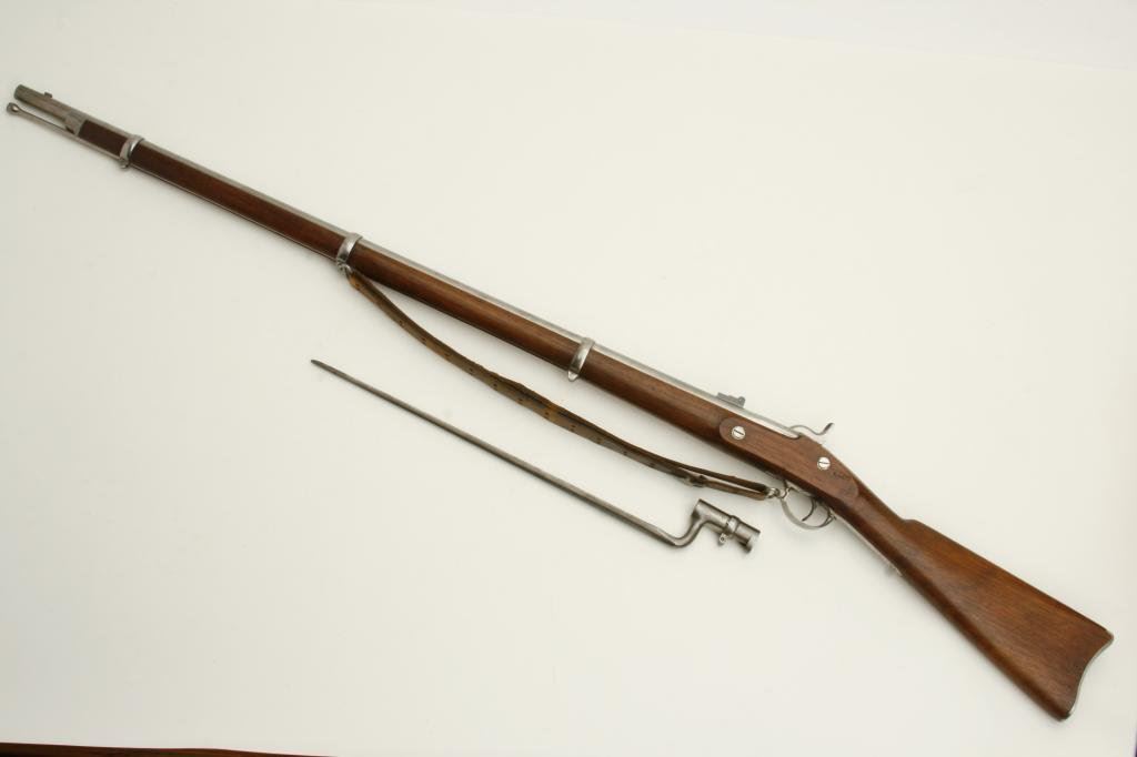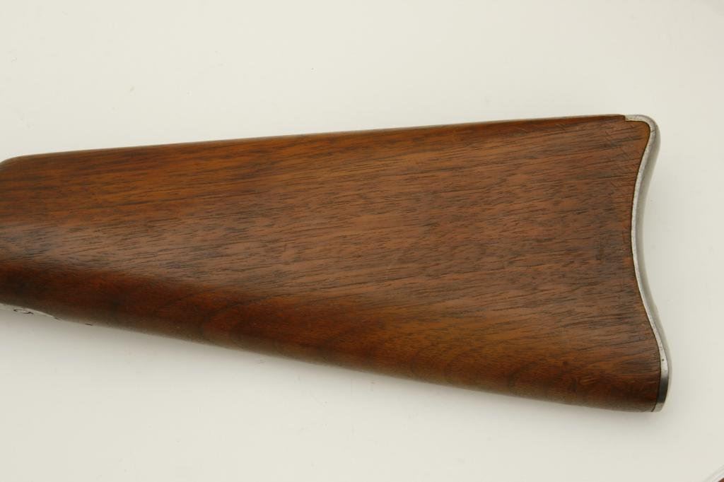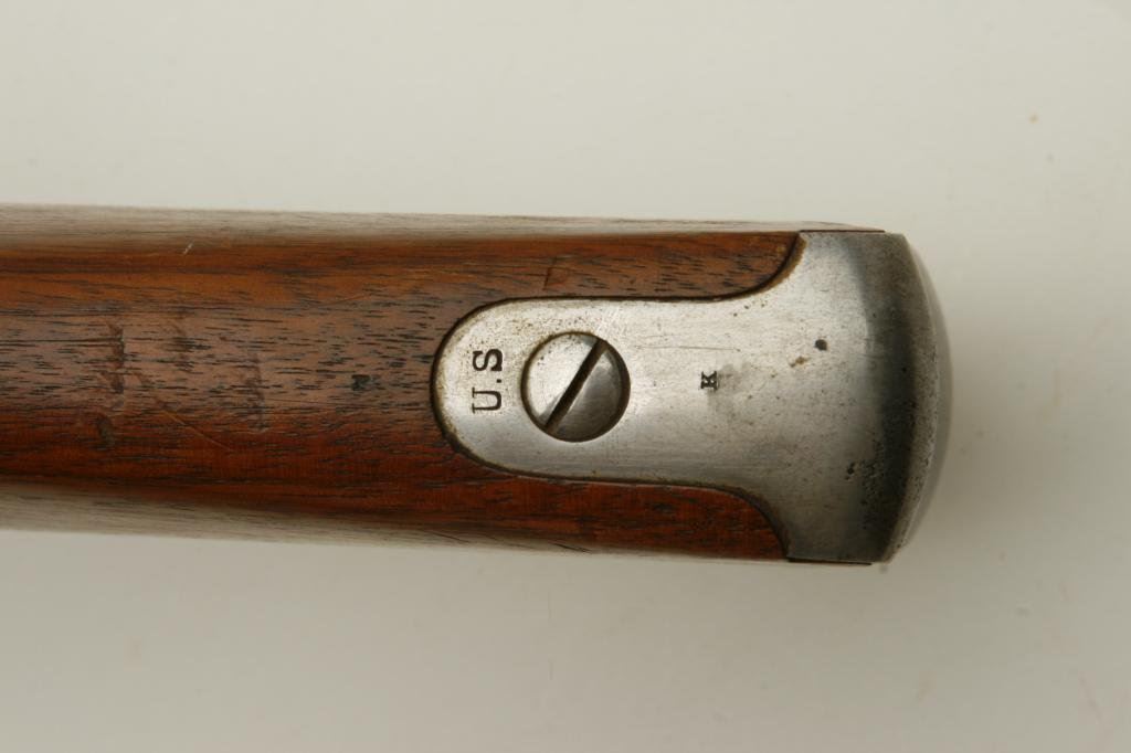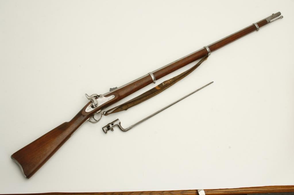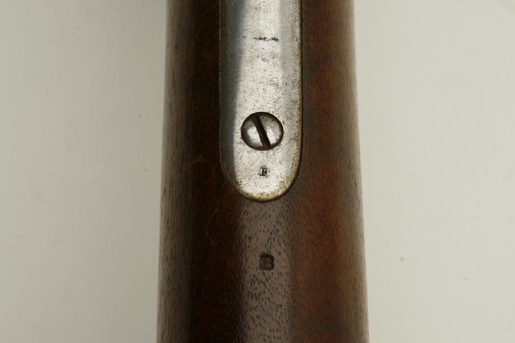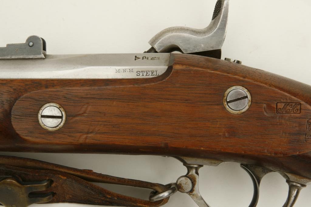 dated 1864 in fine original condition with bayonet and sling. The rifle shows its original arsenal bright with very slight beginning minor age. Two sharp and well defined inspector’s cartouches in stock with some minor bumps and storage marks. The edges or ramrod channel are sharp and well defined with correct ramrod retained. A 9.95 on a 1-10 scale. (Antique) Est.: $3500-$7000