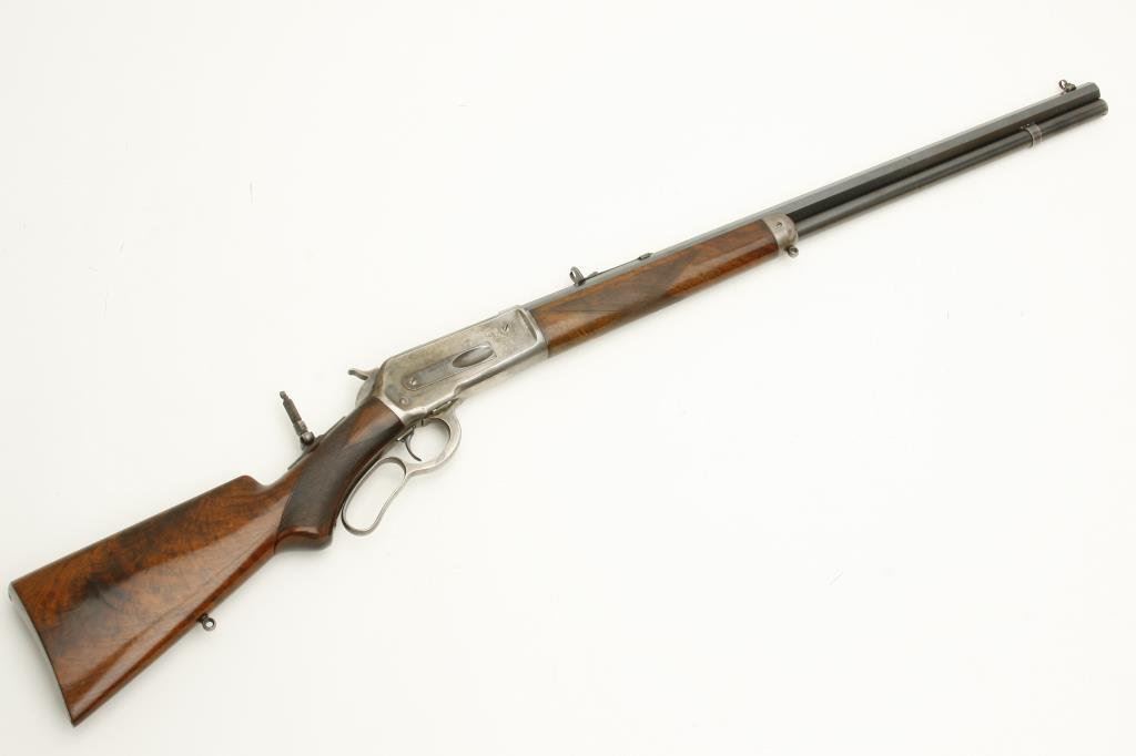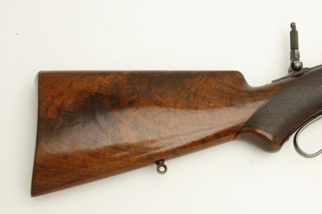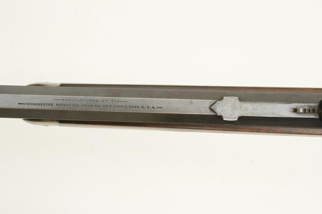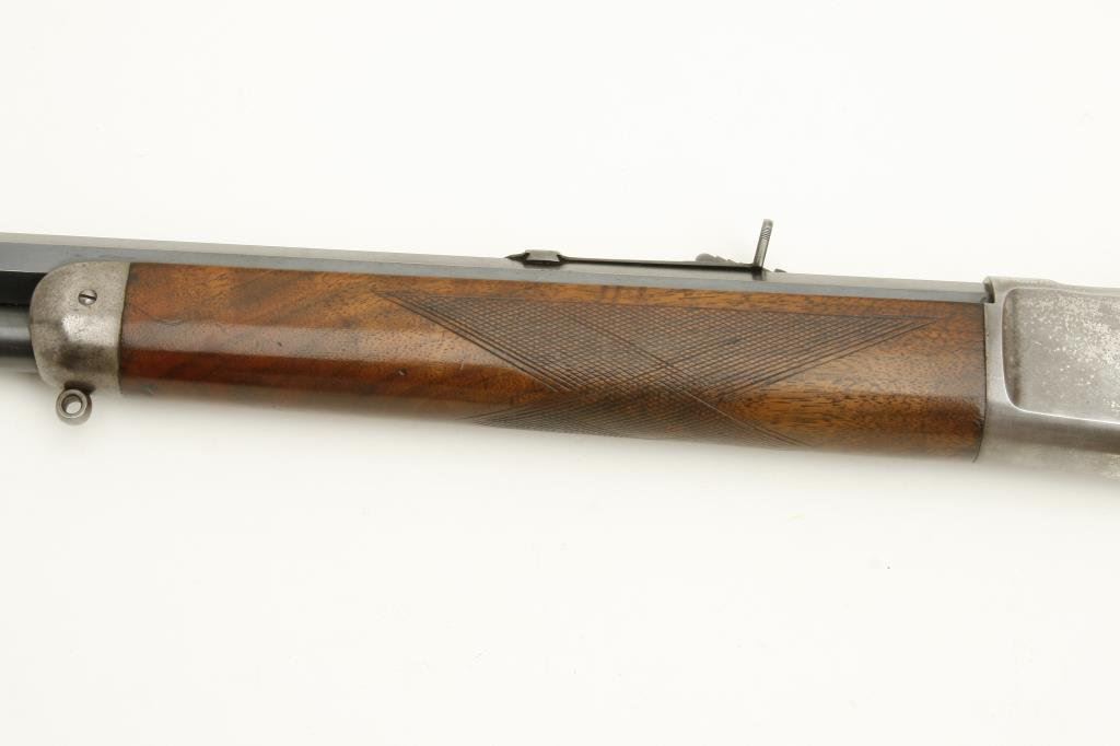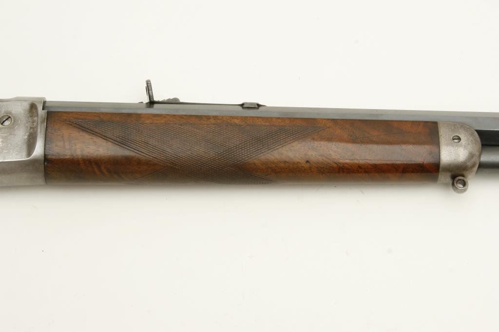 caliber, 26” octagon barrel, blued and case hardened finish, single set trigger (working at time of description), buckhorn rear sight, flip up front sight, checkered deluxe wood with sling swivel eyelets, shotgun butt, S/N 14899, in overall fine original condition displaying the majority of its original blue finish on barrel and loading tube, ample original case colors on the receiver, lever and hammer mixed with silver toning, fine bore, crisp action and markings, beautifully grained deluxe wood stocks. (Antique). Est.: $6,000-$12,000.