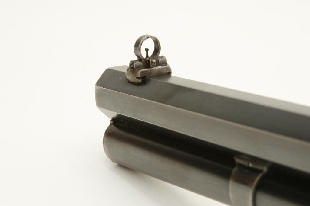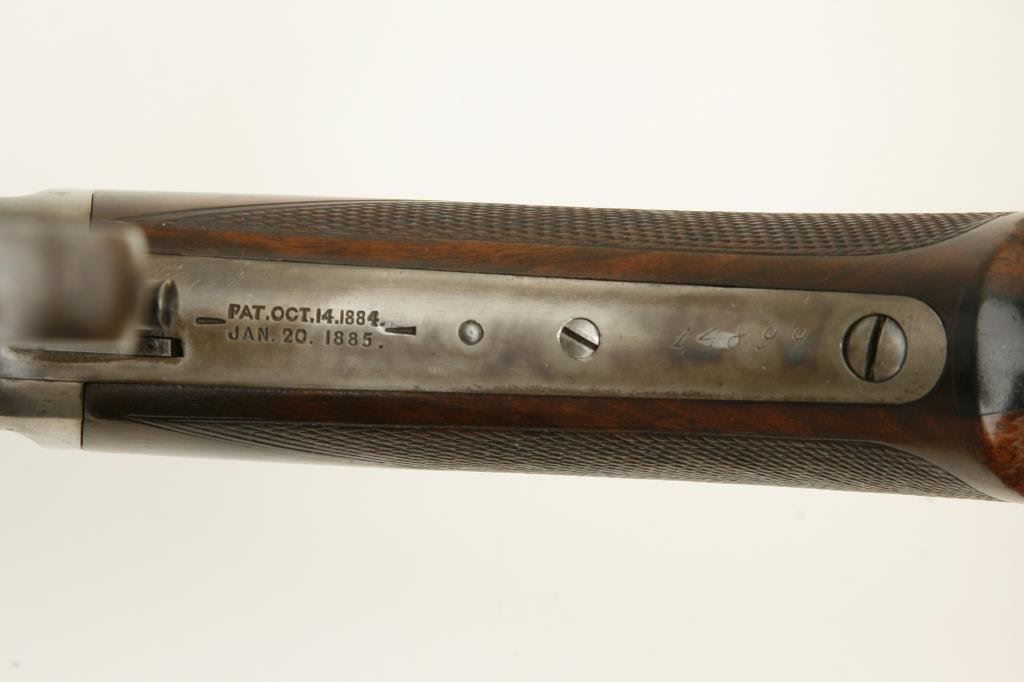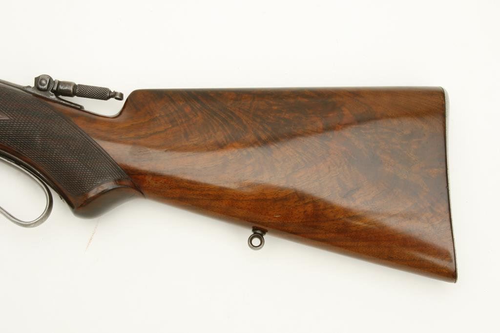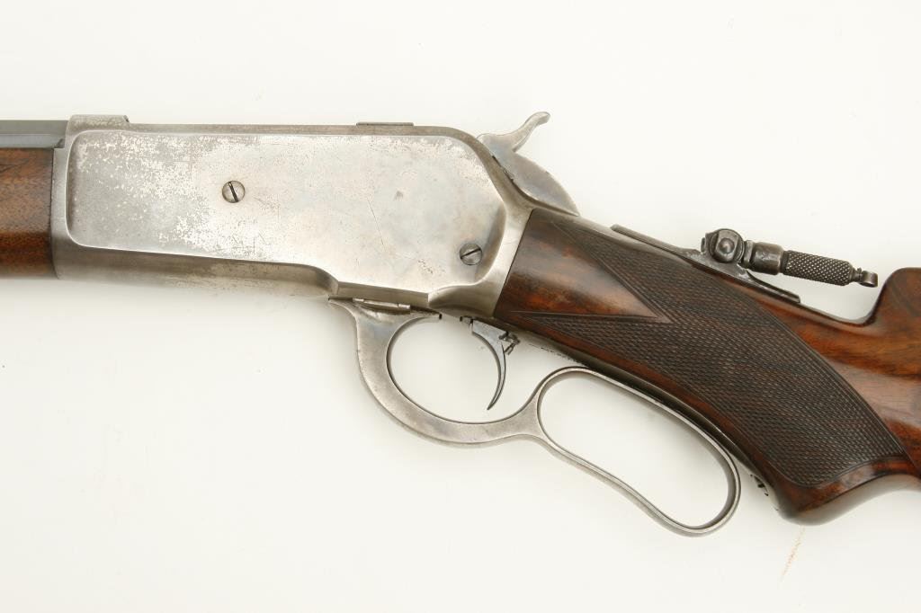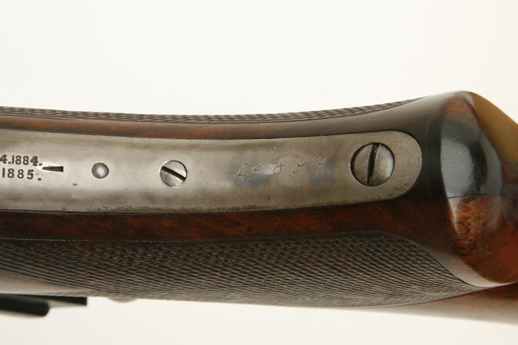 caliber, 26” octagon barrel, blued and case hardened finish, single set trigger (working at time of description), buckhorn rear sight, flip up front sight, checkered deluxe wood with sling swivel eyelets, shotgun butt, S/N 14899, in overall fine original condition displaying the majority of its original blue finish on barrel and loading tube, ample original case colors on the receiver, lever and hammer mixed with silver toning, fine bore, crisp action and markings, beautifully grained deluxe wood stocks. (Antique). Est.: $6,000-$12,000.