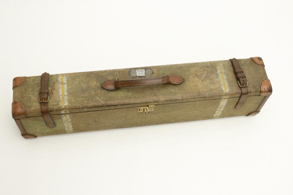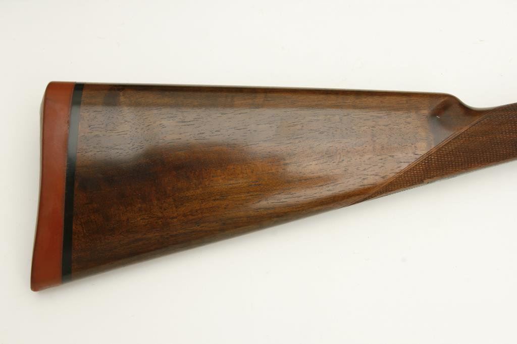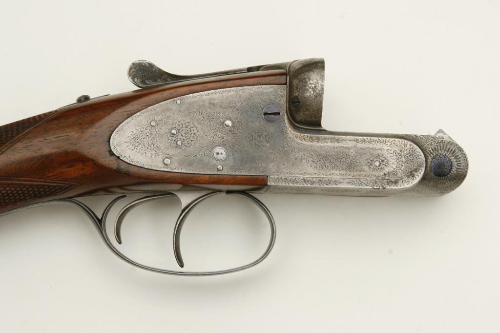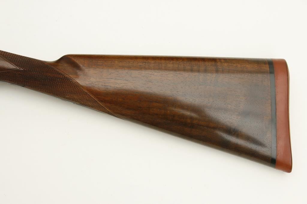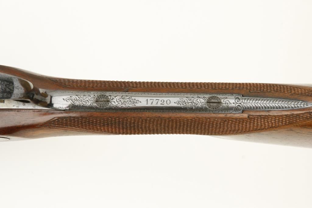 30” barrels, auto ejectors, 2 ¾” chambers, S/N 17720 and originally built 1902-05. Copies of letters and bills from Purdey confirms return to the factory for refinishing, lengthening of chamber, and re-proof circa 1978. Currently shows 1978 nitro proof for 1 1/8 oz. shot also self-opening, straight stock without pistol grip, splinter fore end, floral and scroll best quality engraved with British style heel plate. Letters also confirm restocking and change from pistol grip to straight. The condition is fine to excellent as factory re-built and refinished. The length of pull is 14 ½” to front trigger, drop is 1 ½” at comb and 2 ½” at heel. Choked cylinder and improved cylinder. The barrel thickness are “In range”. Also a Purdey motor case with label in lid included. Approximately 80000 to replace at current rates and a very nice gun showing modern proofing and factory restoration. (C&R) Est.: $12,500-$25,000