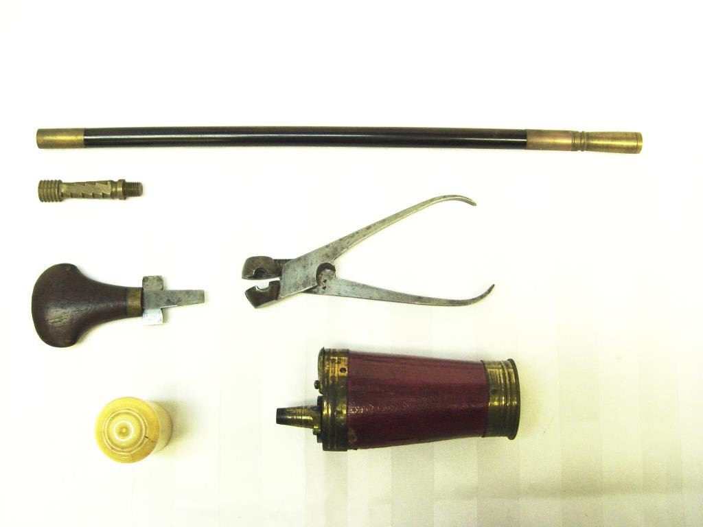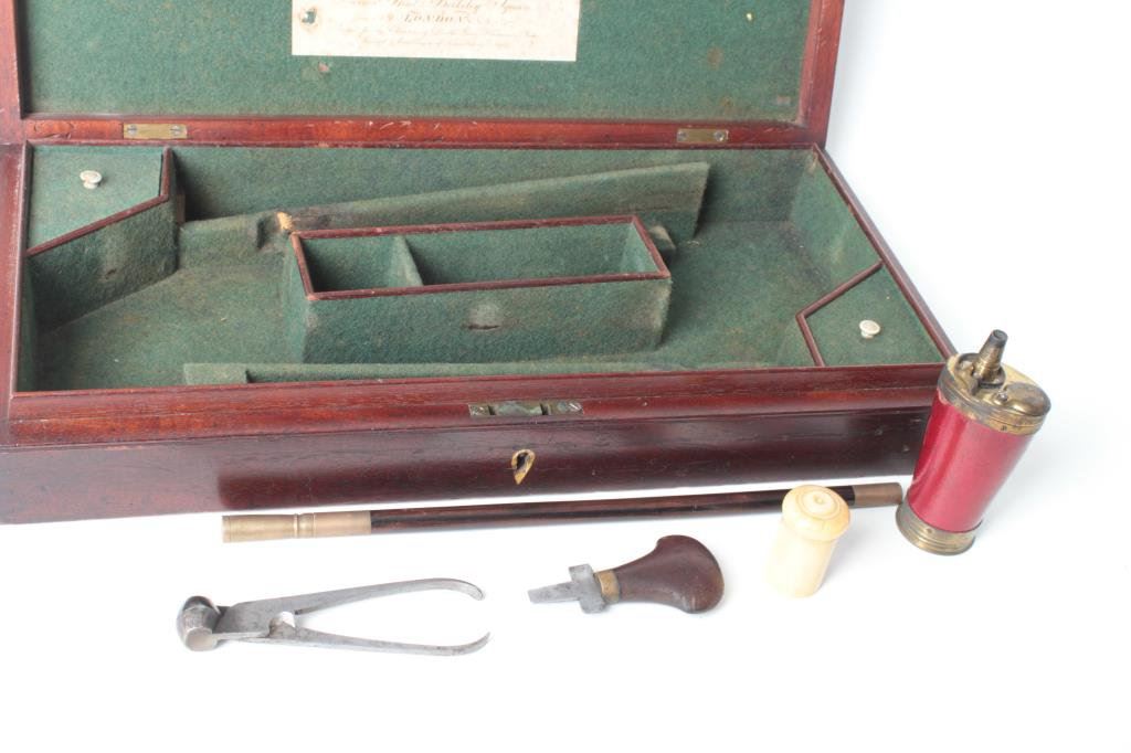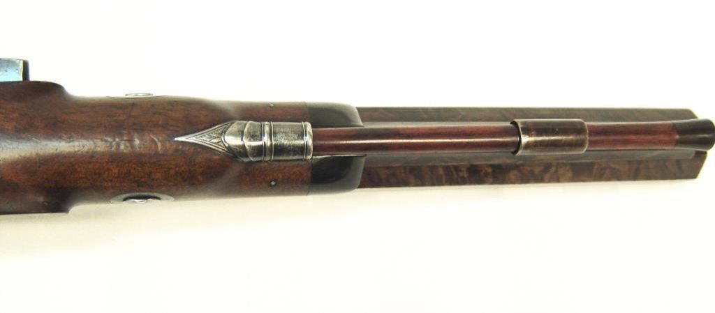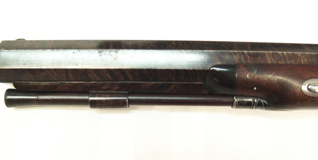 in fine condition cased with accessories. Measures approximately 15 ½” overall with 10” slightly heavy octagon barrels of .46 plus caliber. The pistols retain 90%-95% original stripped brown finish on the barrels, 60%-70% case hardening, and 70%-80% bright “Robbin’s egg” blue on the trigger guard. The stocks are very good plus with only slight wear and very minor imperfections. Signed on lock with maker’s cartouche at the breech. All original locks and small parts. Good Manton label in the lid with Davies Street and Berkley Square address. The lining is original and very good to almost fine with minor age and slight wear. Lovely Moroccan red leather flintlock flask of proper age along with mold, screwdriver, rod, and both original compartment covers. The exterior of the box is very good with slight scratches and mars. A strong 8.5-9 on a 42379 scale and by a top London maker from the high point of flintlock pistols. (Antique) Est.: $14,000-$28,000