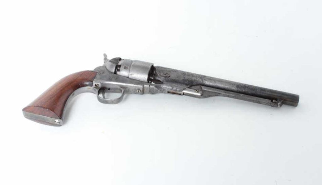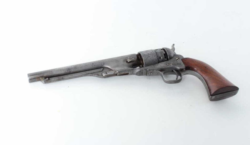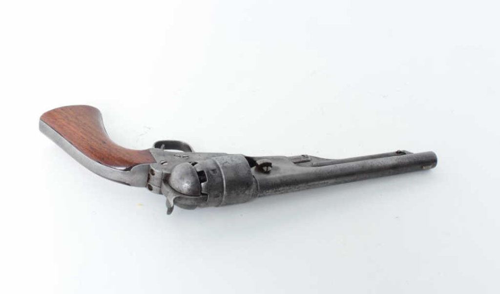 8” barrel, rare London barrel address and no proofs indicating return from sale on American market during the Civil War; Very, Very Rare; few known, S/N 167928 L, all matching visible numbers, in overall good condition displaying a grey patina on metal surfaces with scattered areas of pinprick pitting and some more moderate pitting; good action, very good grips; hard to find ’60 Army variation. (Antique). Est.: $2,500-$5,000.