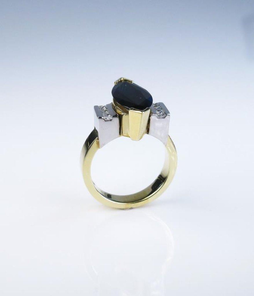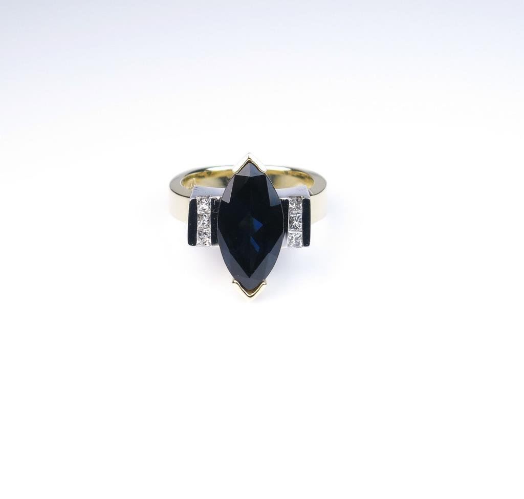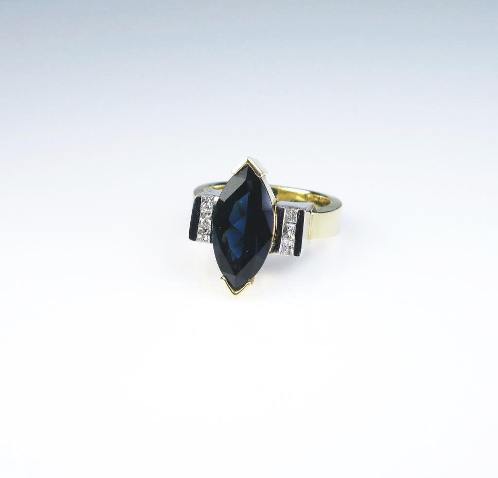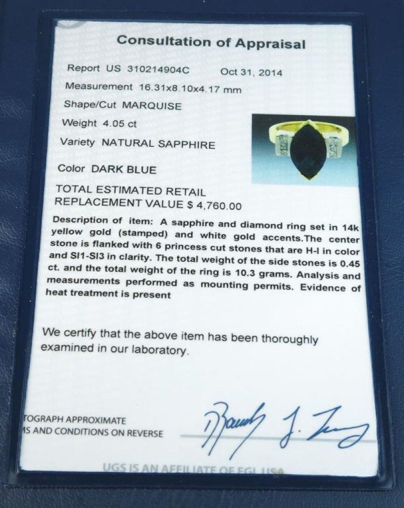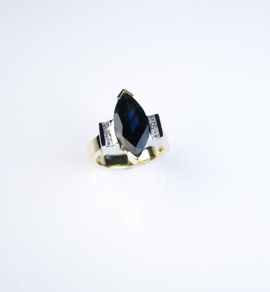 MQ cut blue Sapphire and 6 princess cut diamonds weighing approx. 0.45 carats of H colors and SI clarity set in a heavy 14 karat two tone custom made setting. Please see FULL appraisal. Retail $5,000.00 Estimates $3,000-$4,000