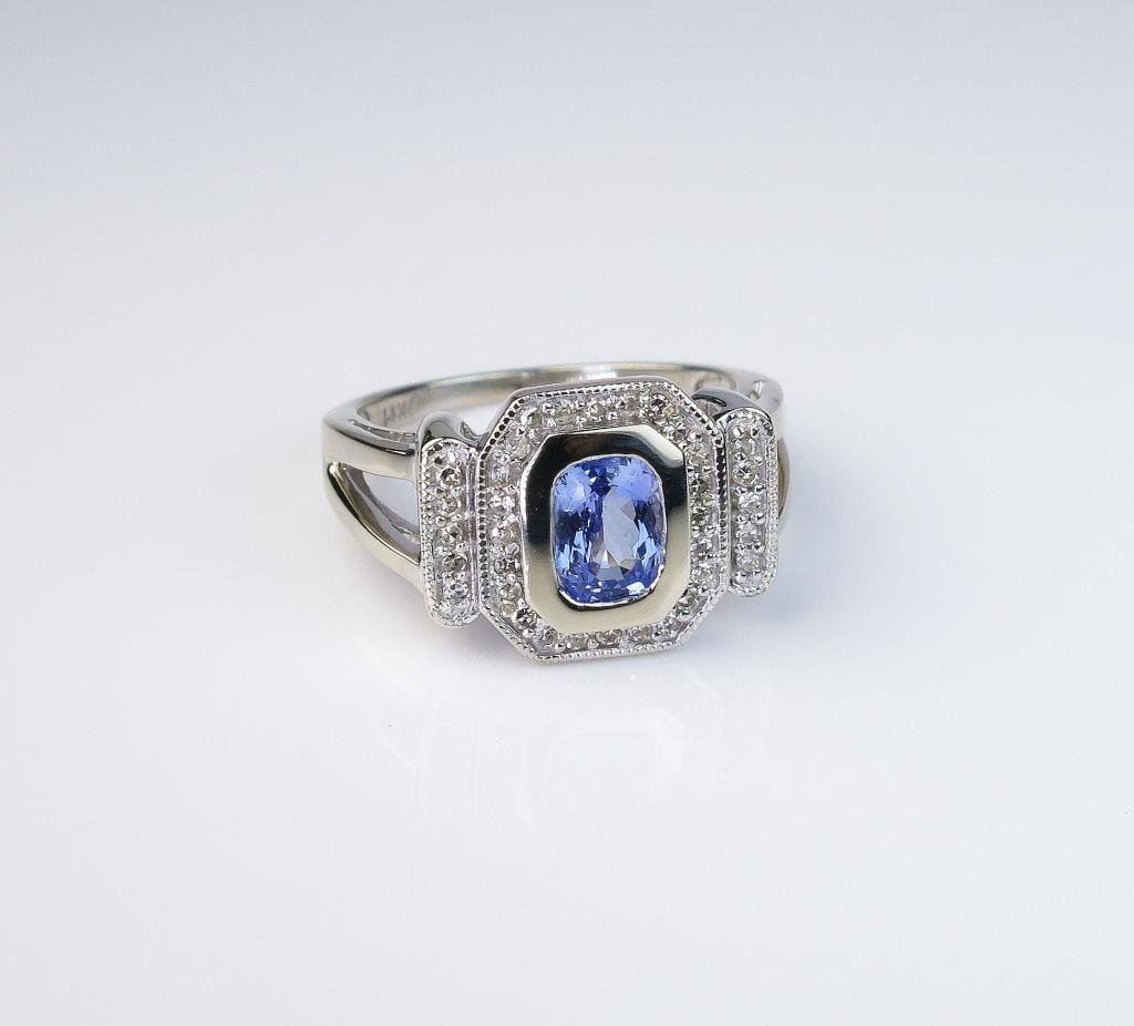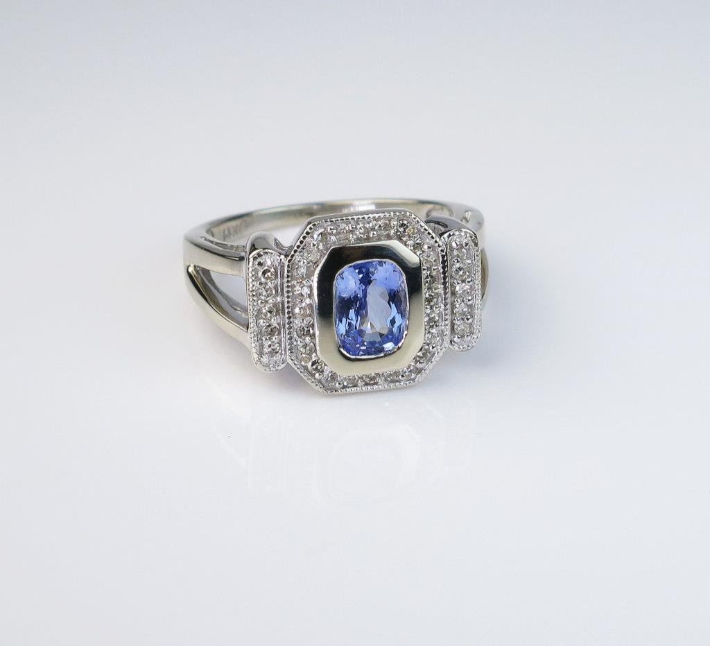 cushion cut Ceylon sapphire weighing over 1.00 carat and encircled with 34 round diamonds weighing approx. 0.50 carats of F-G colors and VS clarity set in a 14 karat white gold Art Deco vintage style setting. Retail $3,000-$4,000 Estimates $2,000-$3,000
