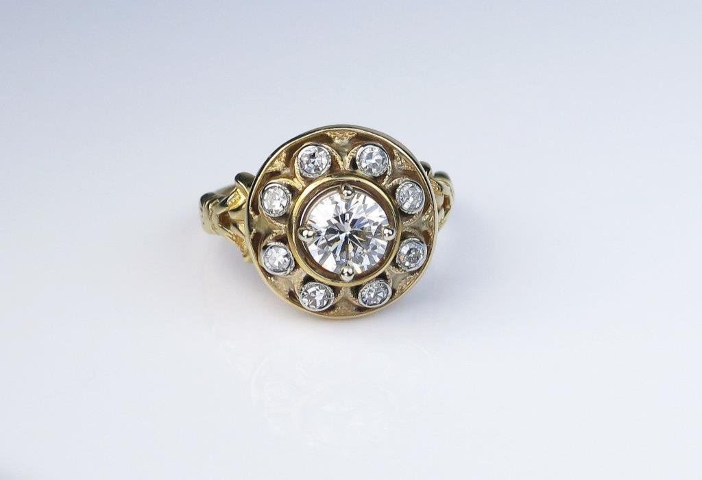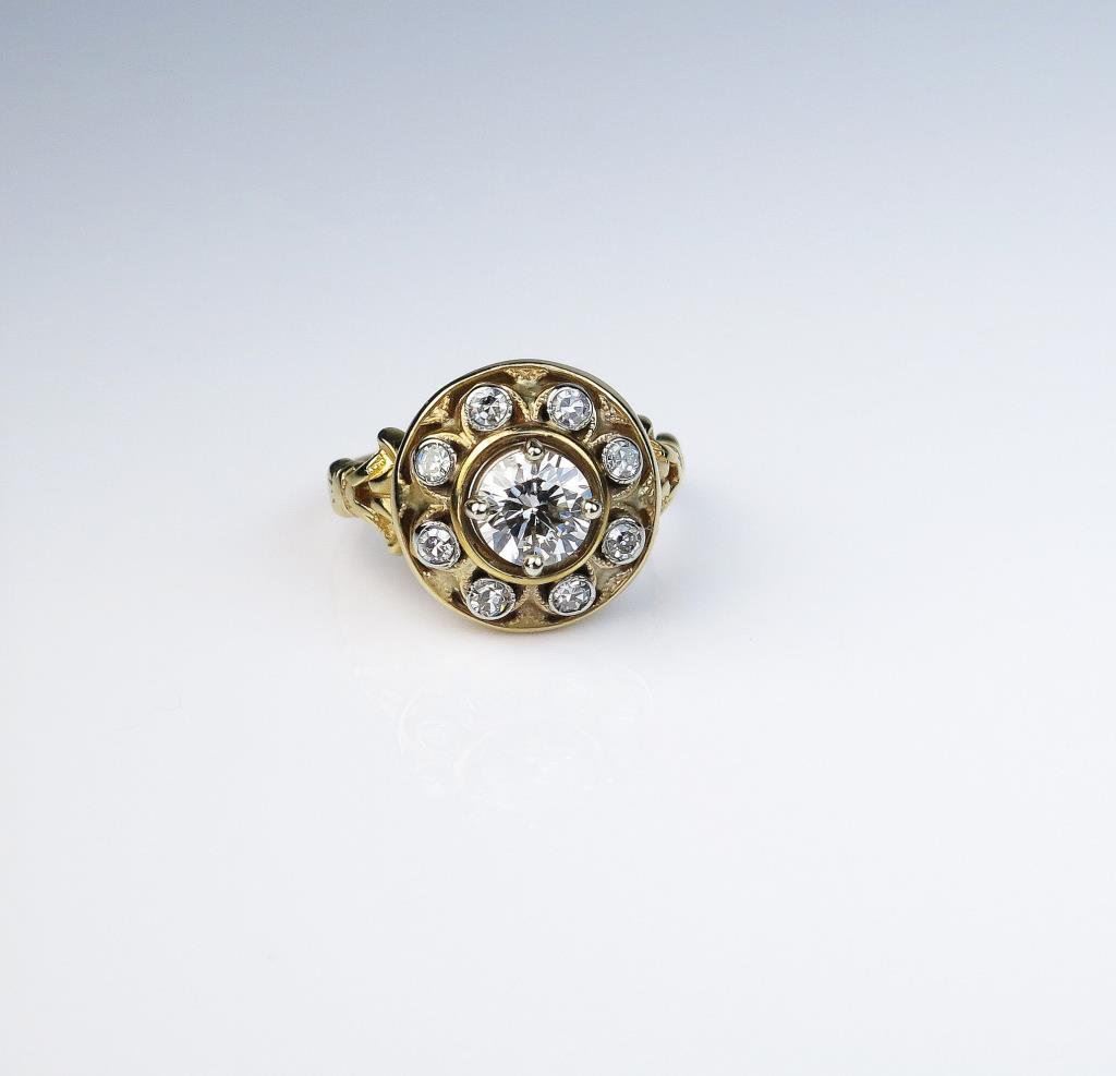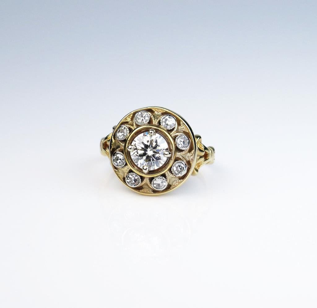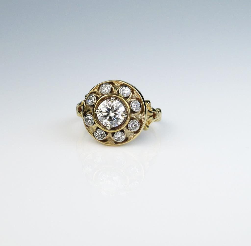 diamond weighing 0.72 carats of H-I color and SI clarity encircled with 8 single cut diamonds weighing approx. 0.20 carats of H-I colors and VS clarity set in a 10 karat yellow gold setting. Retail $5,000-$6,000 Estimates $3,000-$4,000