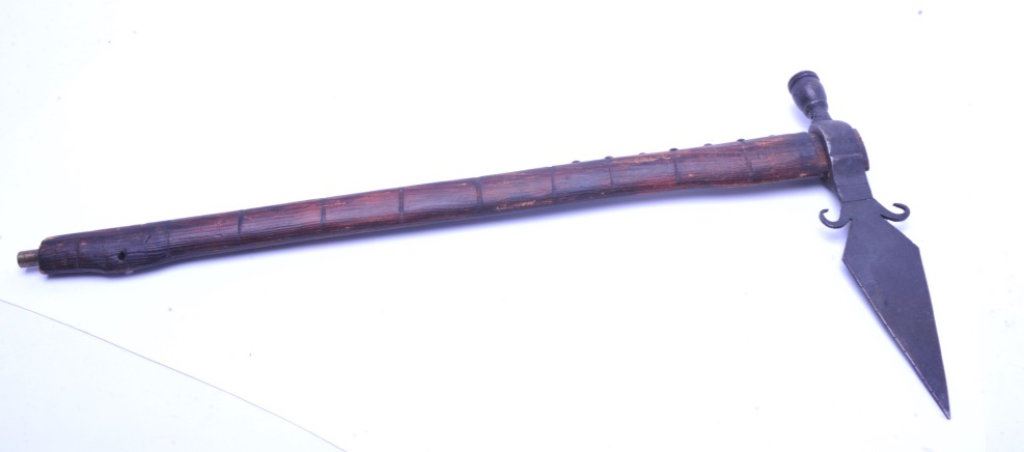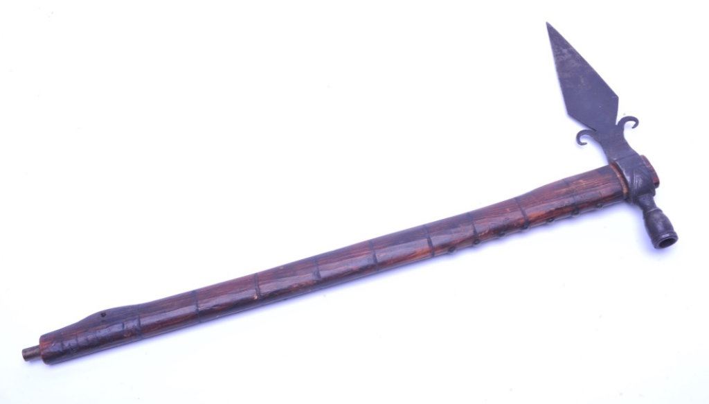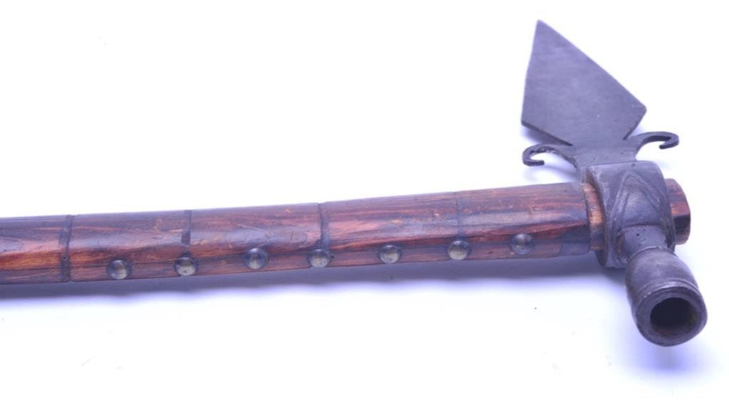 with French style head. Tacked hand carved period shaft possibly from table leg. Hole is offset drilled by Indian methods. Measures 21 1/8” from end to end and 10 ¼” from bowl to point. Interior steel with many “Blow holes” or perocity as these were cheap trade items. Good overall condition with normal aging and some rust in dark patina. Est.: $1500-$3000