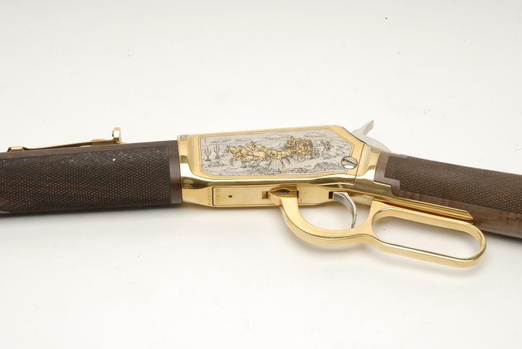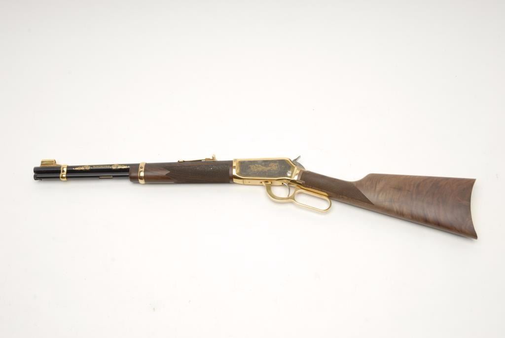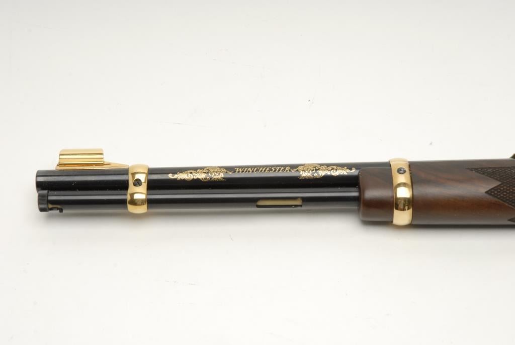 in .22 caliber rimfire with a 16 ½” barrel, S/N WACA208 in series. Mint in box with fancy stocks and gold embellishments. See lot 876 for consecutive serial number. (C&R) Est.: $1500-3000