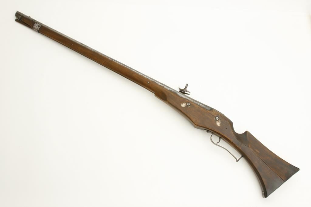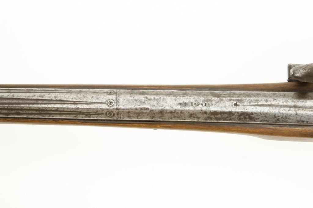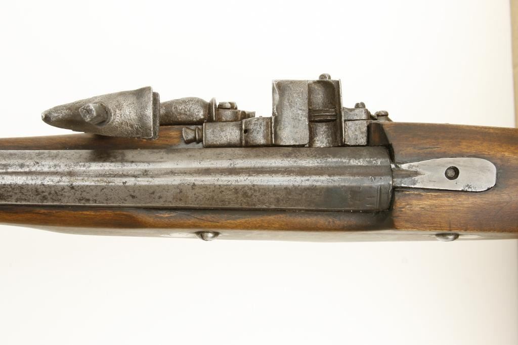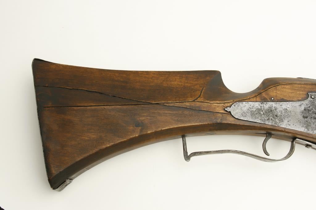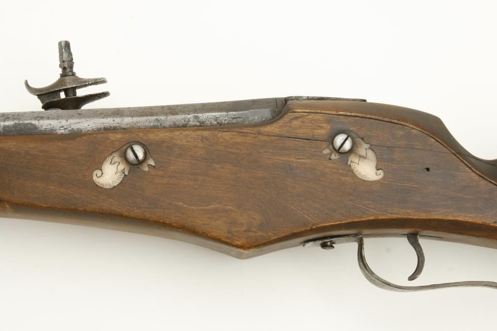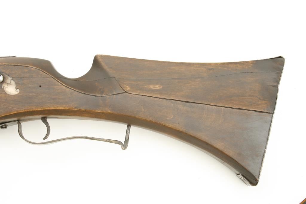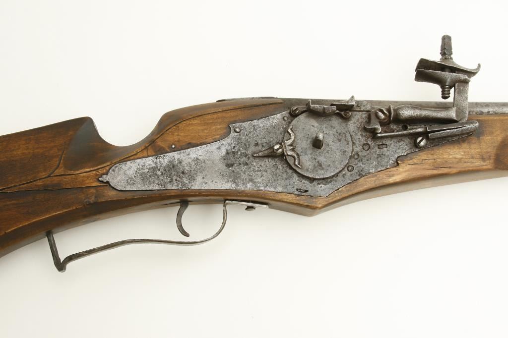 style probably Germanic. Measures 55” overall with a 37” barrel of approximately .75 caliber smoothbore. The inside of the lock shows maker’s cartouche of “I.H.” with trident separating the initials. The lock is complete with chain and small parts and springs all intact. The stock has been broken and restored a long while ago and the color lightened as it shows evidence of being a darker color before the repairs. Some pitting on the lock and barrel but good metal condition for 400 years of age! An acceptable Wheelock musket with a nice form and a great marking inside the lock. Est.: $2,500-$5,000