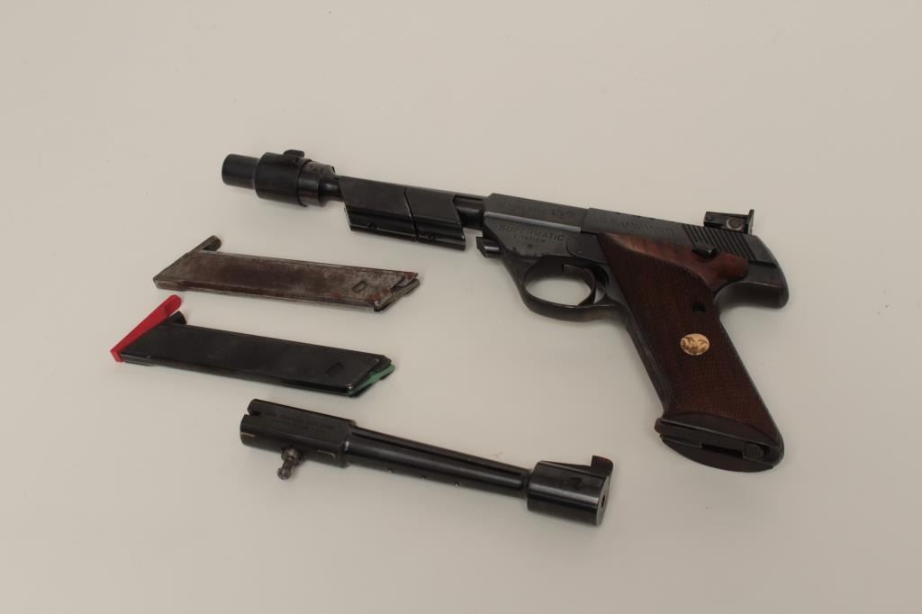 6 ¾” barrel, muzzle brake, 2 weights, 3 clips, and extra 6 ¾” barrel. 85%-95% original blue with some high point and edge loss along with some minor rust spots and cleaning after poor storage. Bright interior. (Modern/PPT) Est.: $350-$700