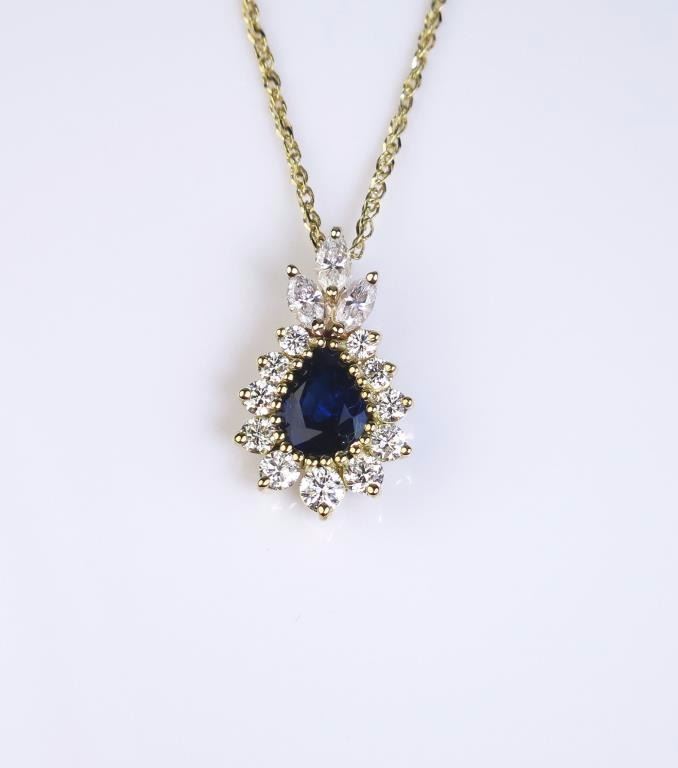 shape blue Sapphire weighing approx. 1.50 carats and surrounded by 14 round and MQ ‘IDEAL’ cut diamonds weighing approx. 1.50 carats of G-H colors and VS clarity in an 18 karat yellow gold custom made setting. Retail $5,000-$6,000 Estimates $2,500-$3,500