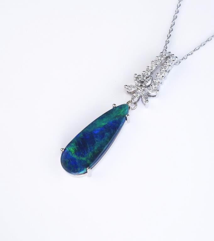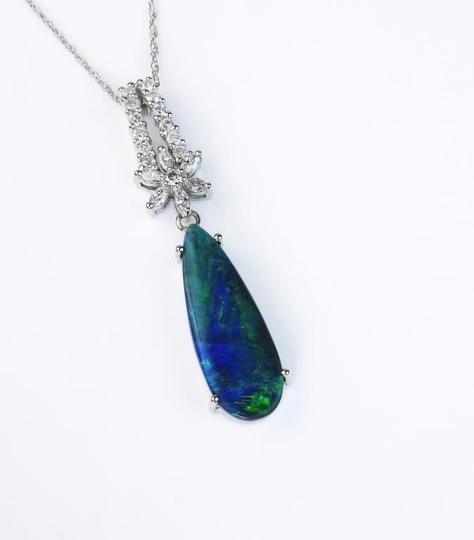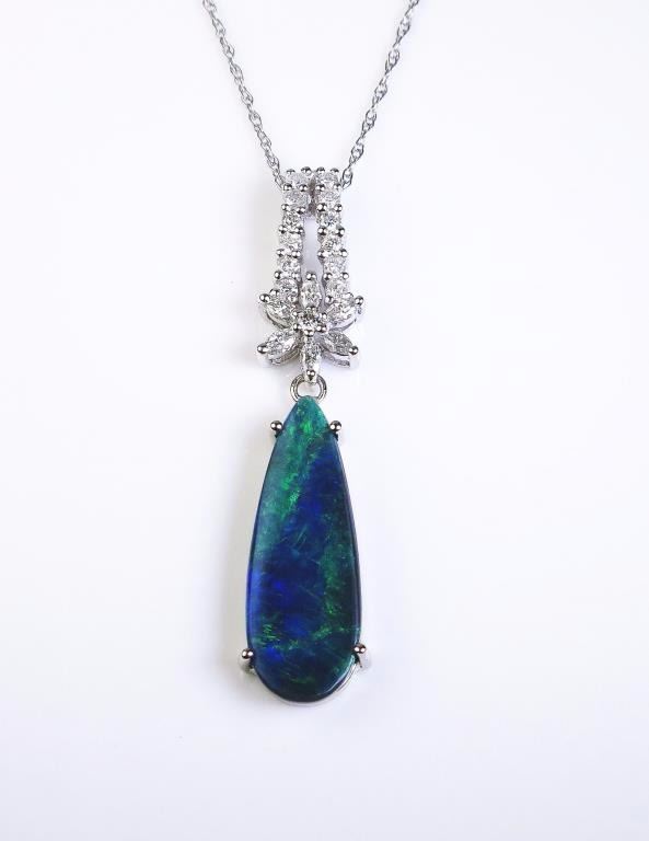 Black Opal weighing 4.25 carats of exquisite green and blue color tones and 19 round and MQ cut diamonds weighing approx. 0.50 carats of H-I colors and SI clarity set in a 14 karat white gold custom made setting. Retail $5,000-$6,000 Estimate $3,000-$4,000