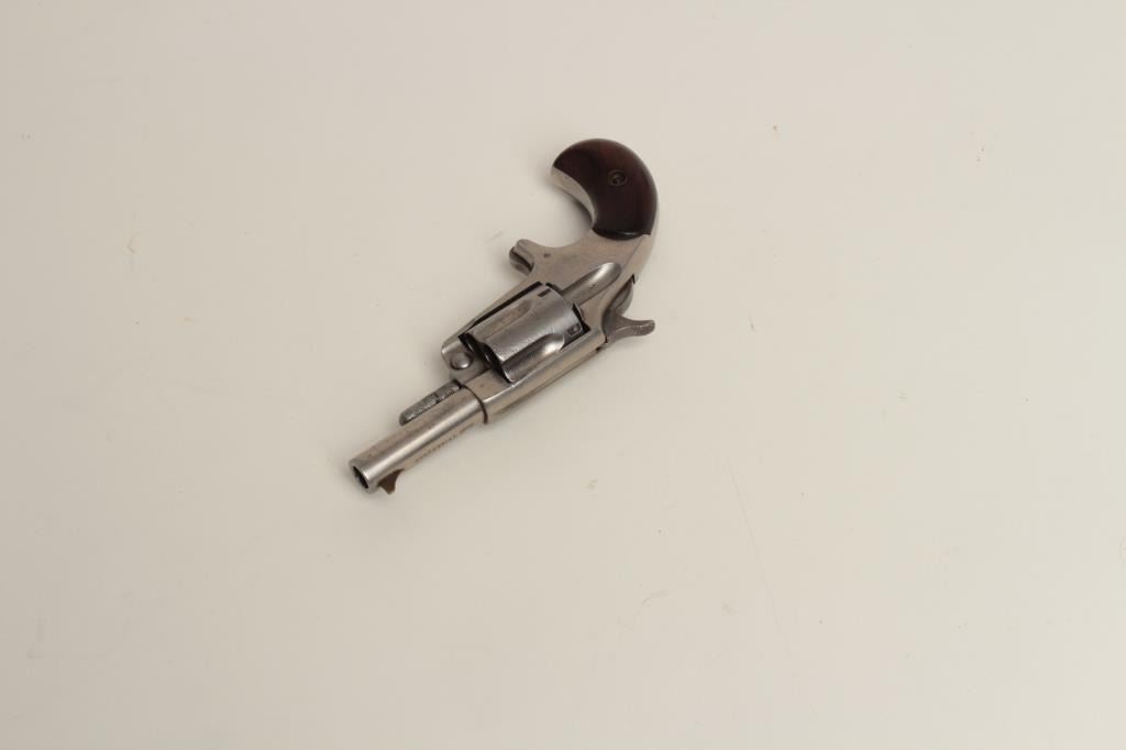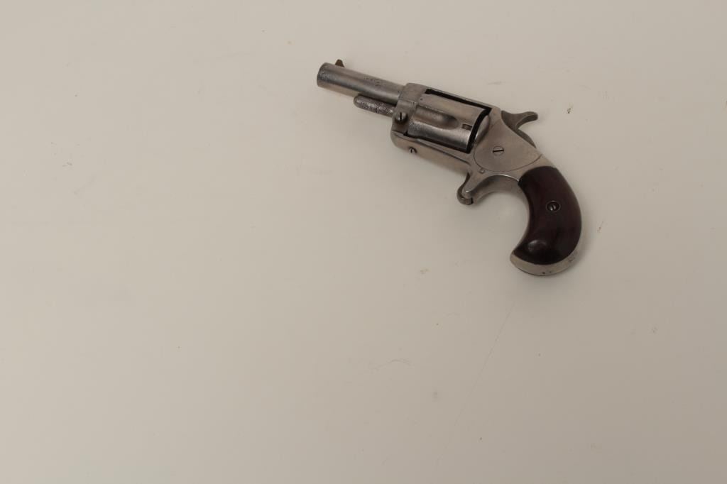 in .32 rimfire showing 1876 patent date on the barrel. In good condition with traces of nickel and some “pebbly” erosion and pinprick pitting. Good grips, good action and legible markings. Front sight an old handmade brass blade as a replacement. (Antique) Est.: $150-$300