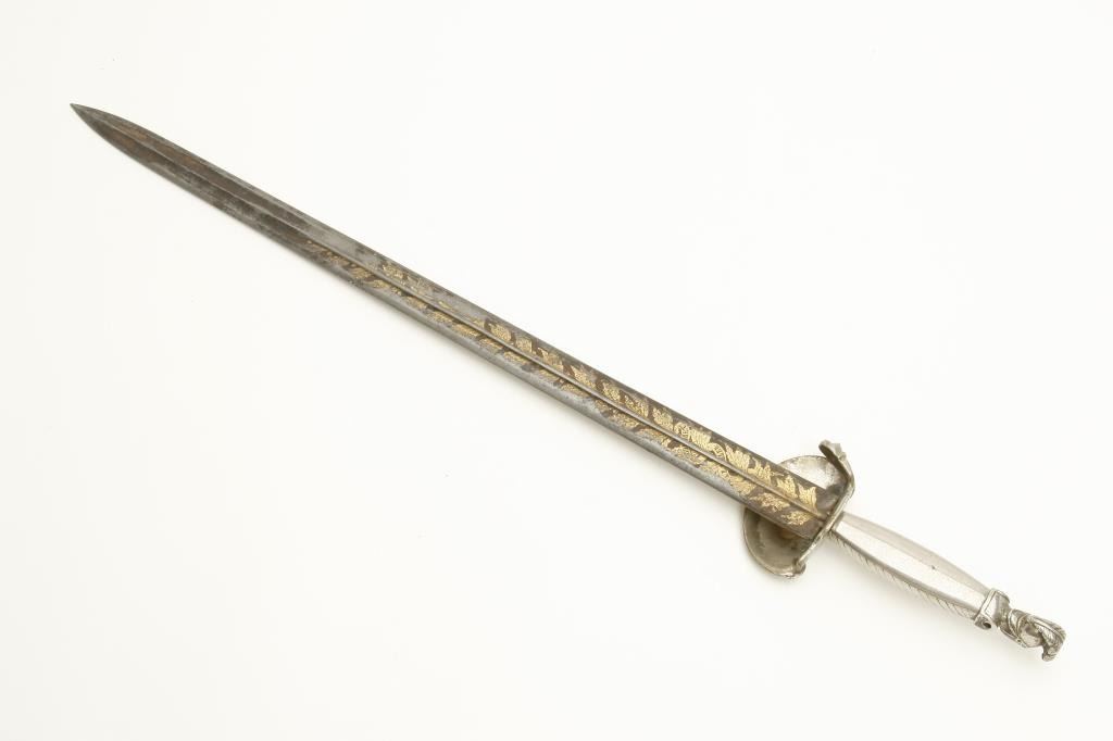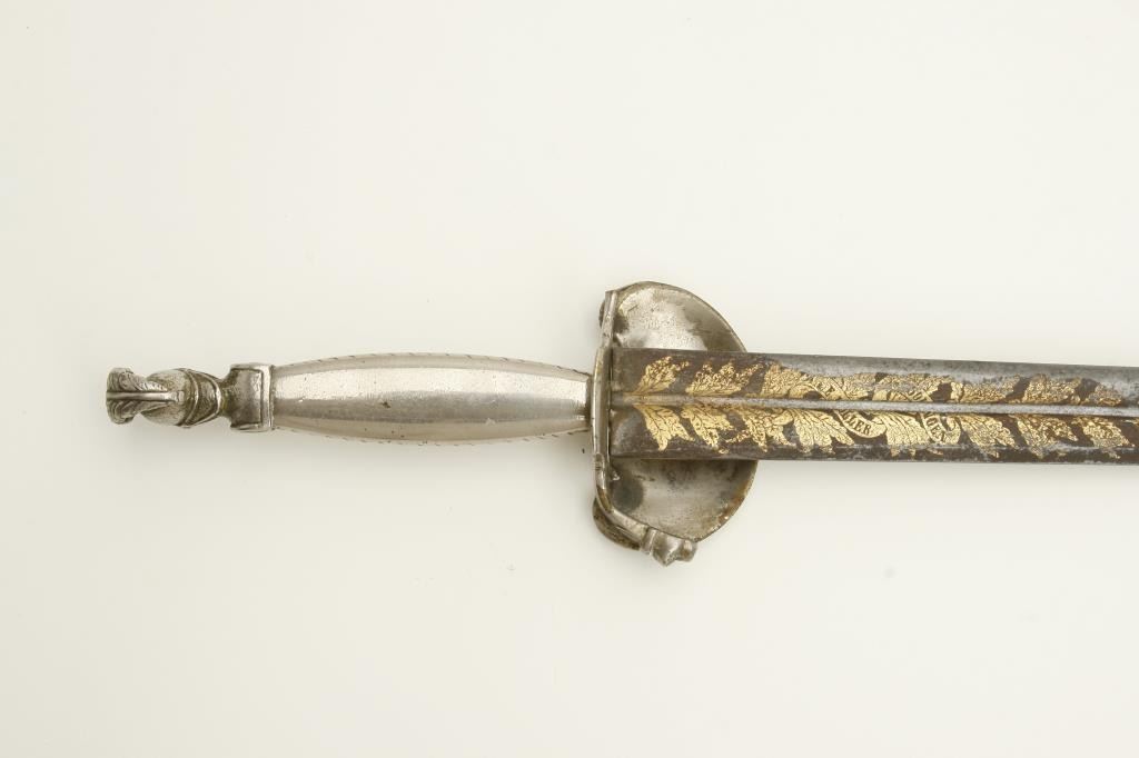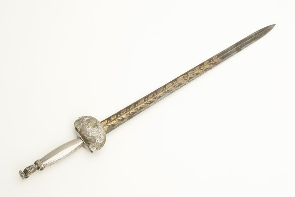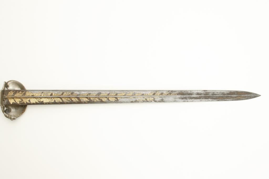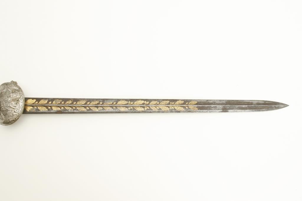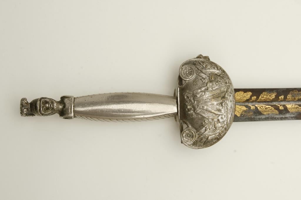 style showing silver hilt with Roman Legion helmeted soldier at the pommel. Measures 25 ½” overall with a 20” blade showing blue and gilt. Maker’s name “A.E. (Last letter not visible) Uller, Soligen”. The quillons show one lion and one broken and missing. The guard shows goddess placing ring on soldiers head holding sword surrounded by stand of arms. Note: chain and part of quillon or guard broken but otherwise good with 75% plus gilt on the blade, considerable blue and some pitting. A very unusual short sword of 1830s militia style that could have been American imported. Est.: $500-$1000