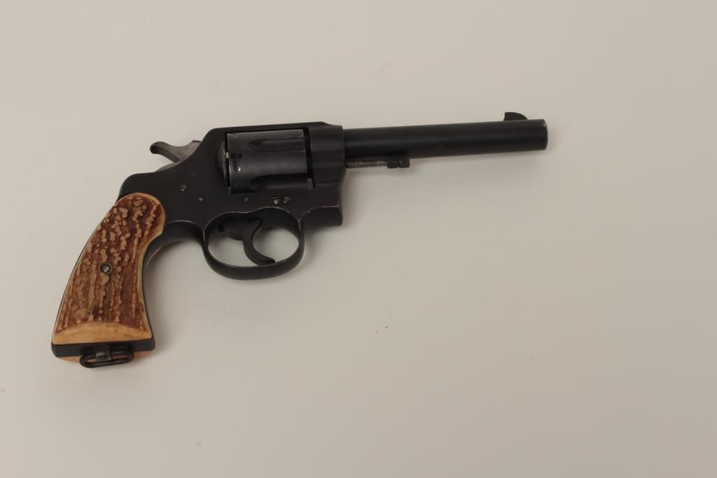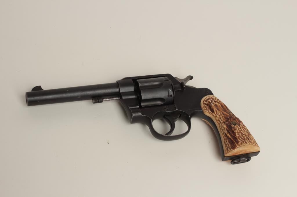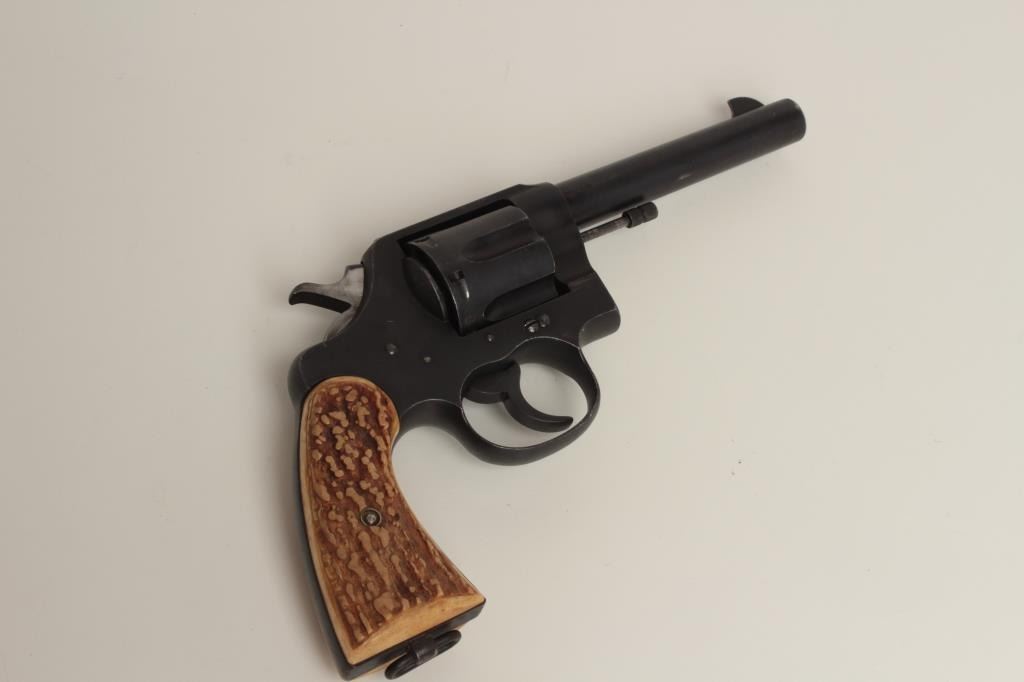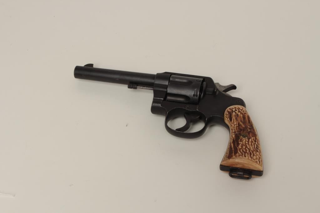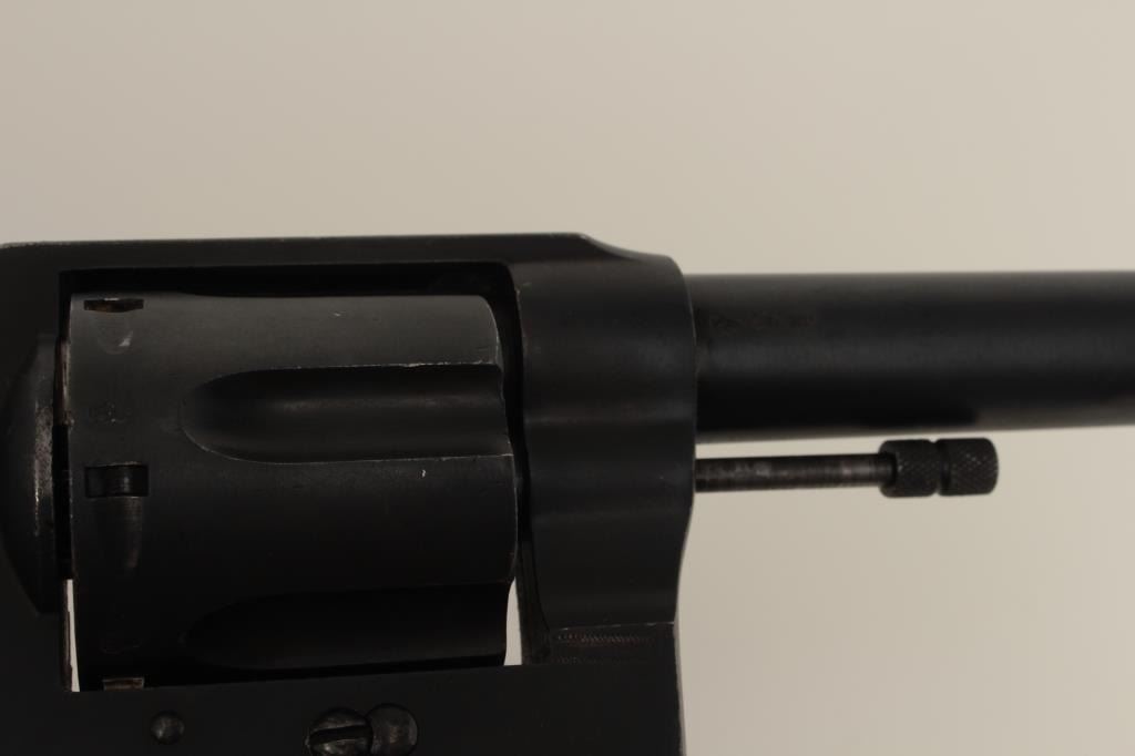 Proofs and broad head stamp in .455 Eley caliber, S/N 83793 with 5 ½” barrel. Military finish in very good condition with excellent bore and excellent period stag grips along with lanyard in the butt. Consignor theorized this revolver was used in Britian during WWI and reissued in WWII. (C&R/PPT) Est.: $600-$1200