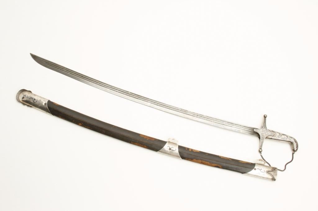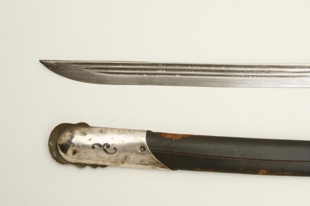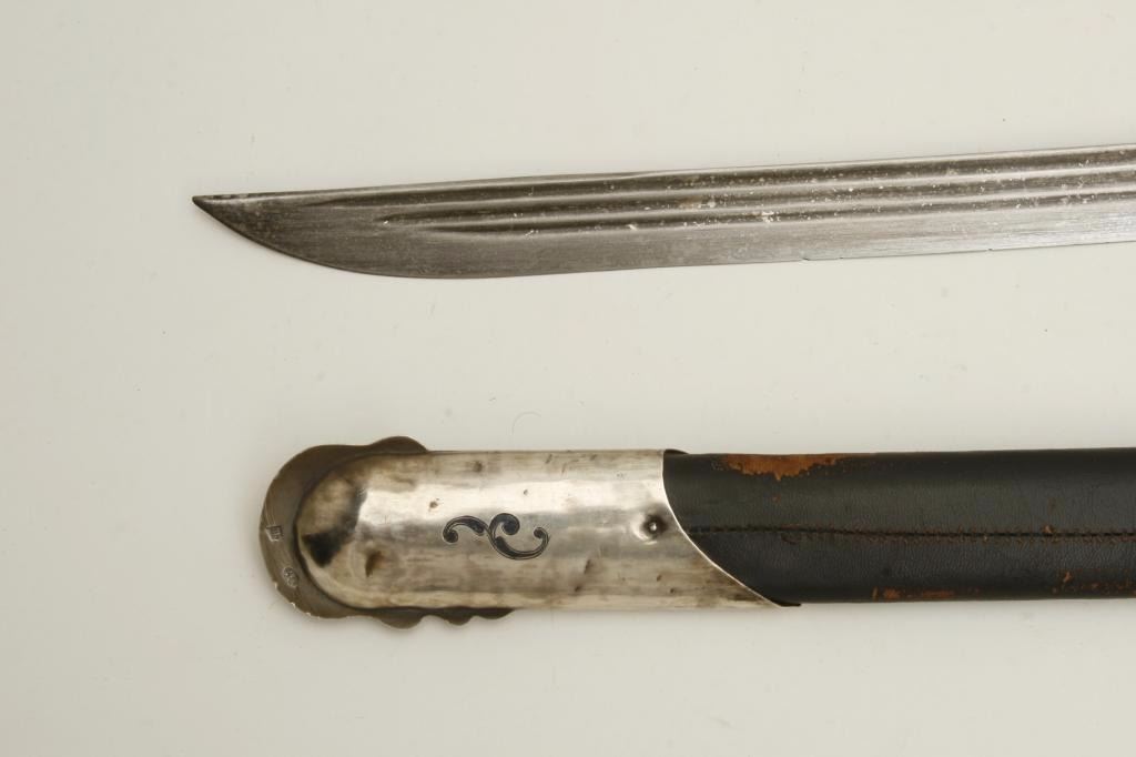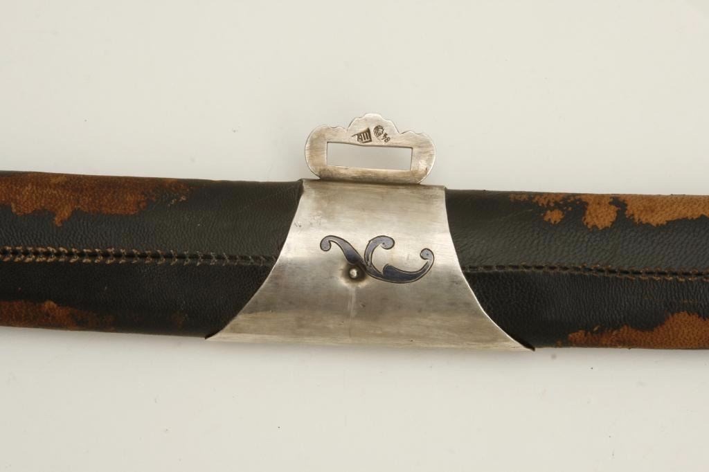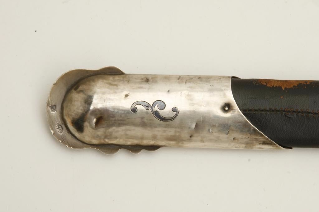 “last Czars” era showing Kokoshnik silver hall marks of 1896-1908. Measures 37” overall with 30 ½” etched blade showing false Damascus along with Russian two headed eagle and crown. In near fine condition with minor scuffs and small losses to the leather on the scabbard. An unusually fine condition piece that by tradition belonged to Royal guards. Est.: $1750-$3500