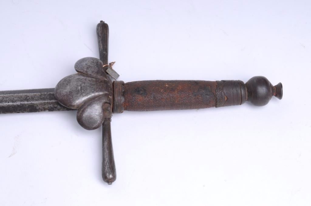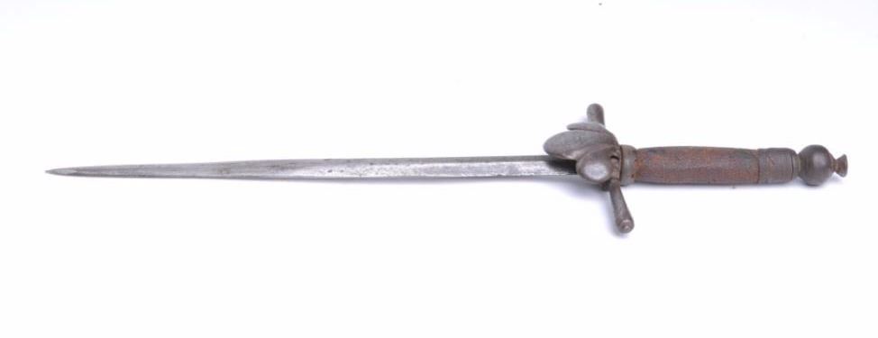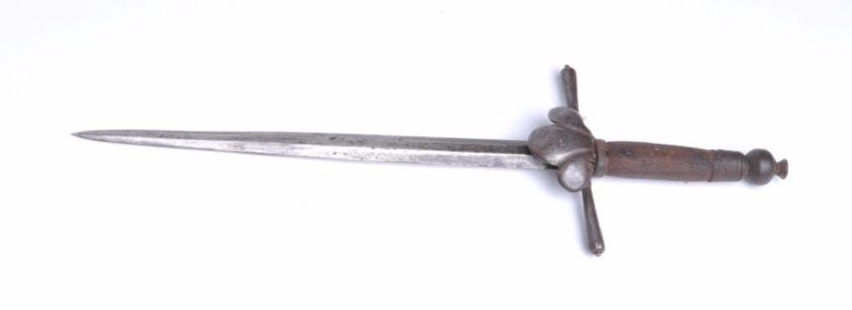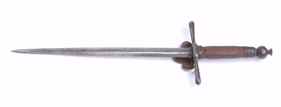 circa 1580-1650. Measures 14 5/8” overall with a 10 ¼” blade. In good condition and all original matching parts. The grip shows traces of chain metal wrap over woven cord wrapping. The metal shows a patina with minor pitting. Brass collection tag with initials B.U. from 19th or early 20th century. Est.: $750-1500