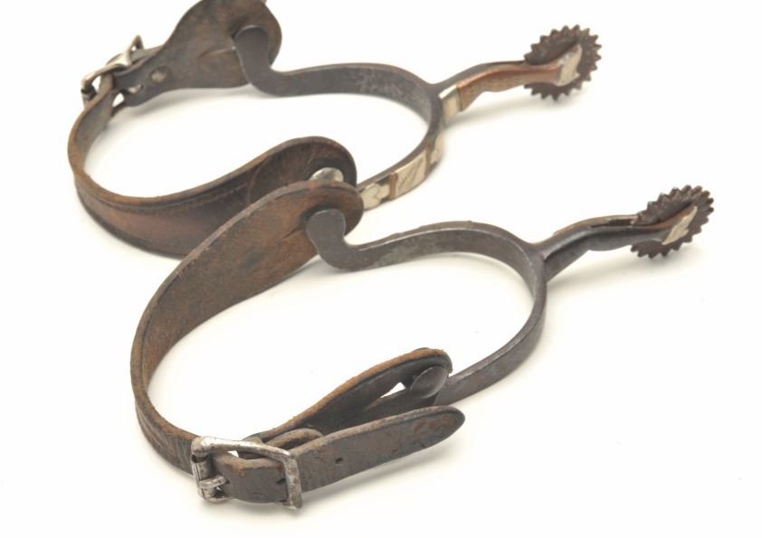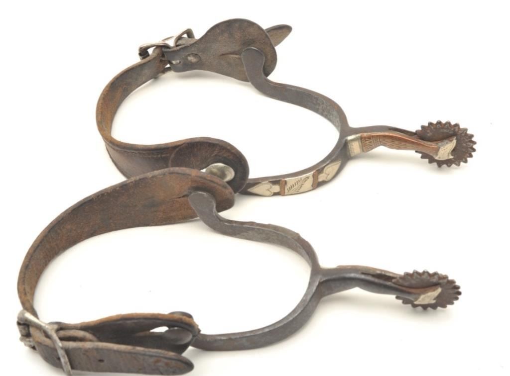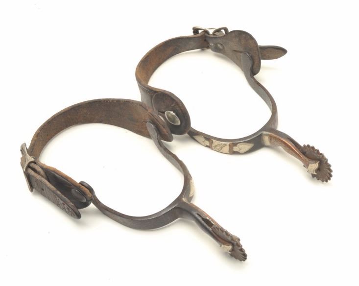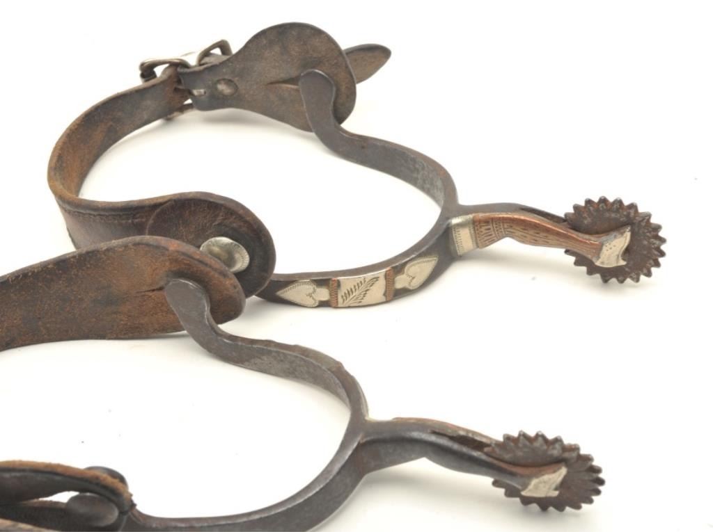 and nickel silver spade inlays. Plain buckle and leathers of the period with small pie cutter rowels. In good condition with normal wear and aging. Approximately circa 1890-1910. Est.: $250-$500