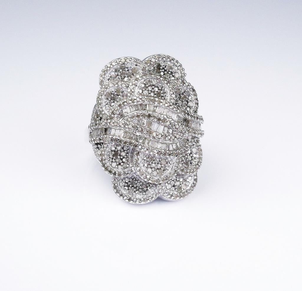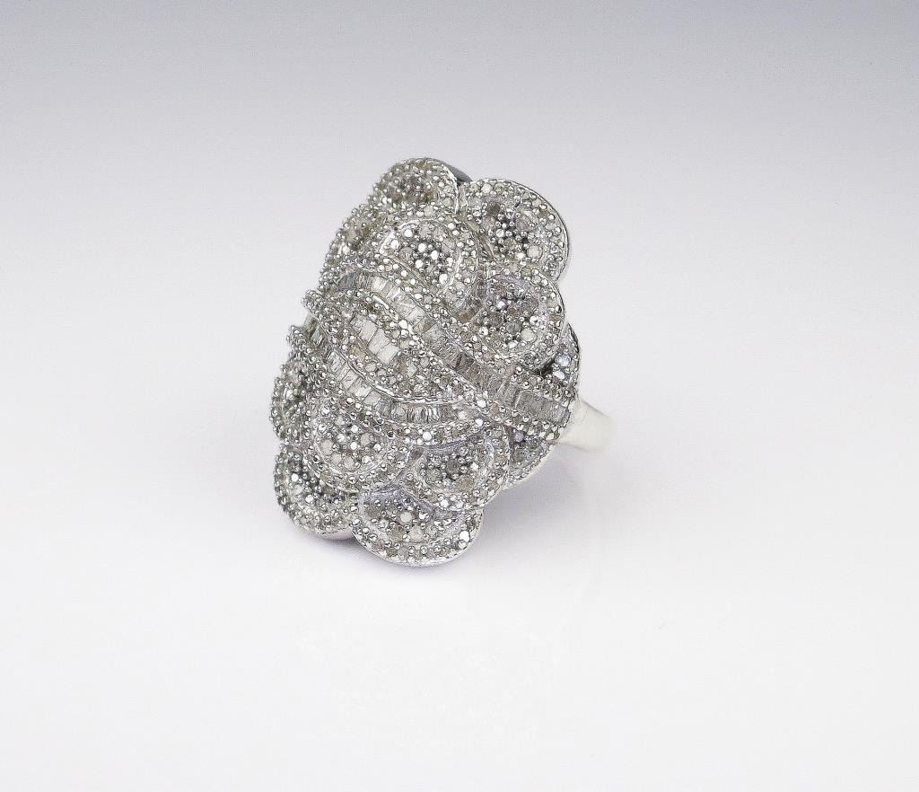 and baguette cut diamonds weighing approx. 2.50-3.00 carats of H-I-J colors in a Sterling silver design setting. Estimates $400-$600