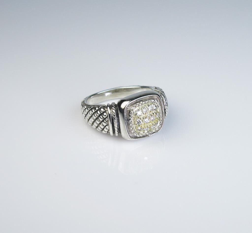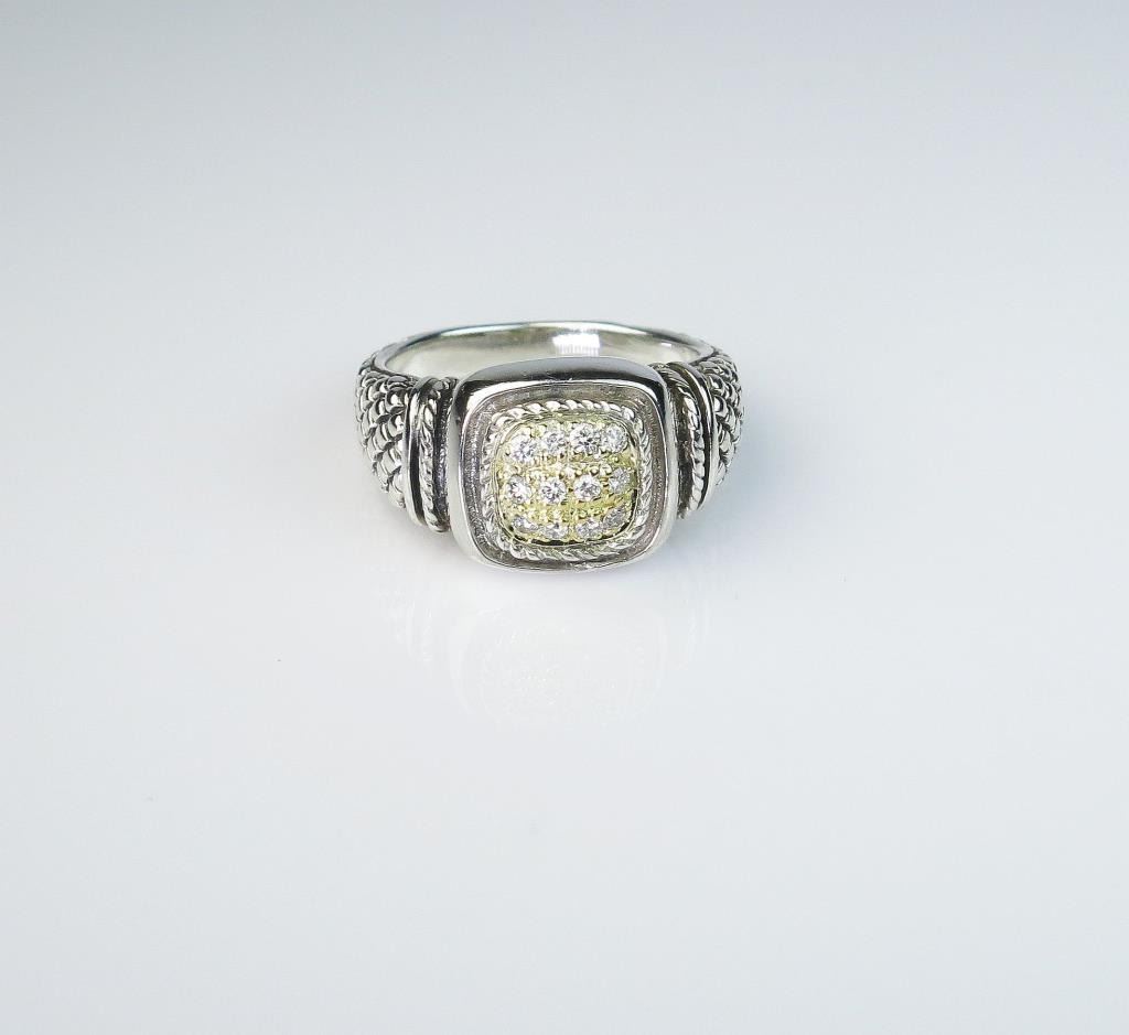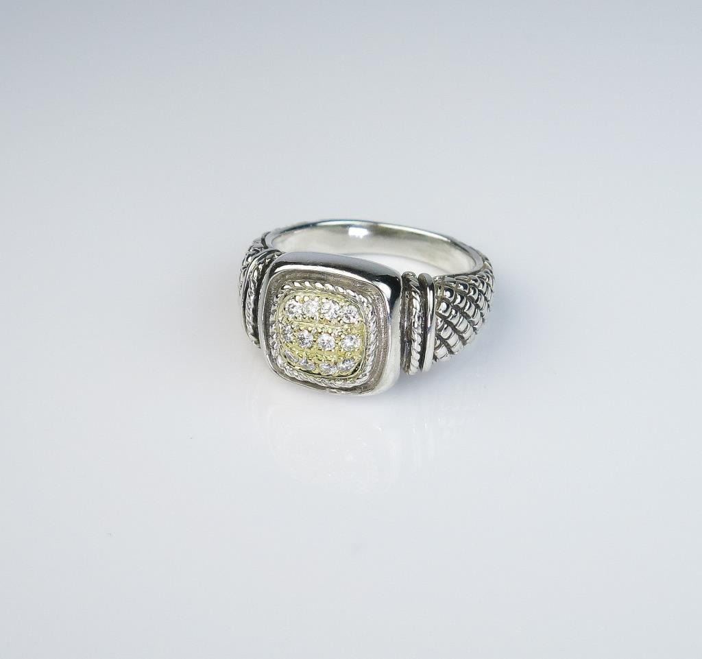 cut diamonds weighing approx. 0.30 carats of F-G colors and VS clarity set in Sterling silver and 18 karat yellow gold accent. Estimates $400-$600