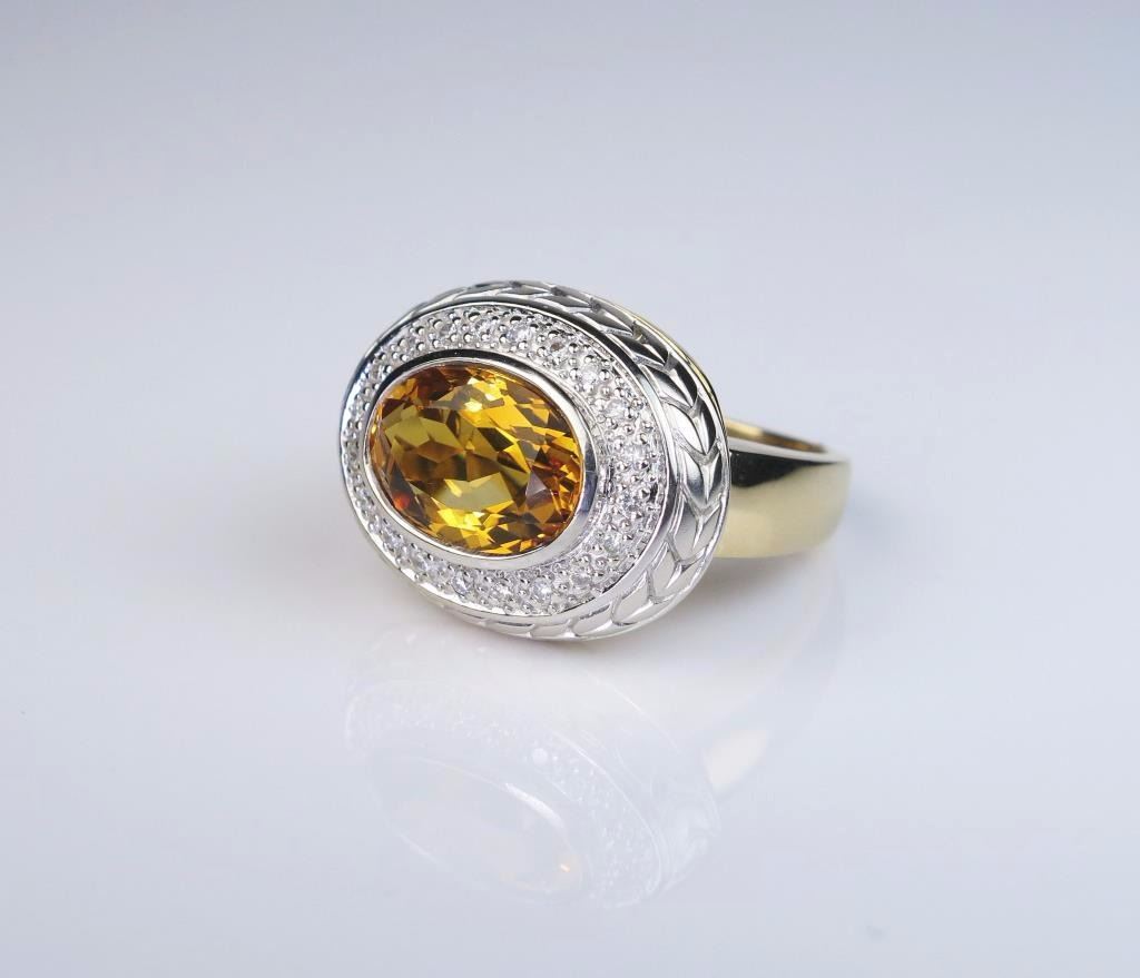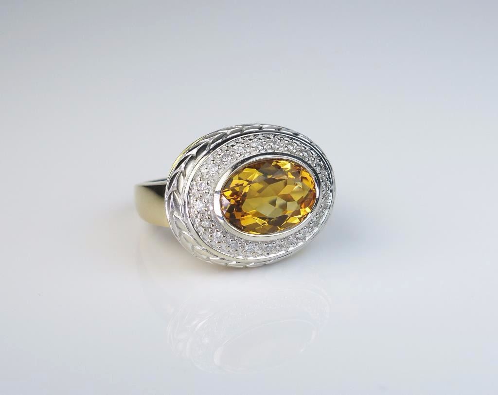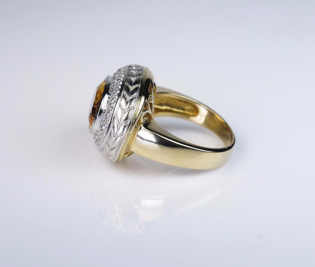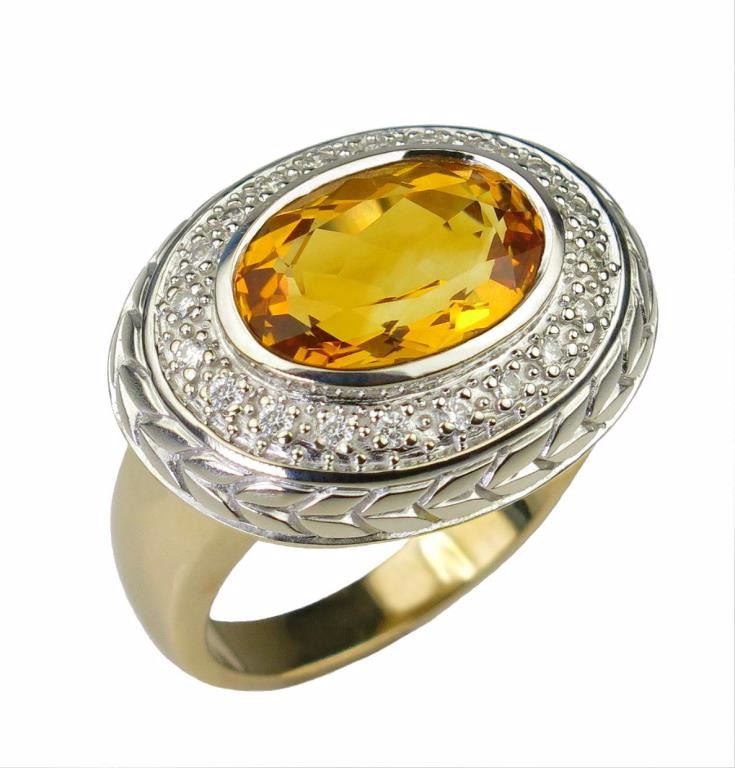 fine citrine weighing approx. 6.00 carats and fine set with 20 ‘IDEAL’ cut diamonds weighing approx. 0.30 carats of F-G colors and VS clarity in a 14 karat yellow gold custom made setting. Retail $2,000-$3,000 Estimates $1,500-$2,000